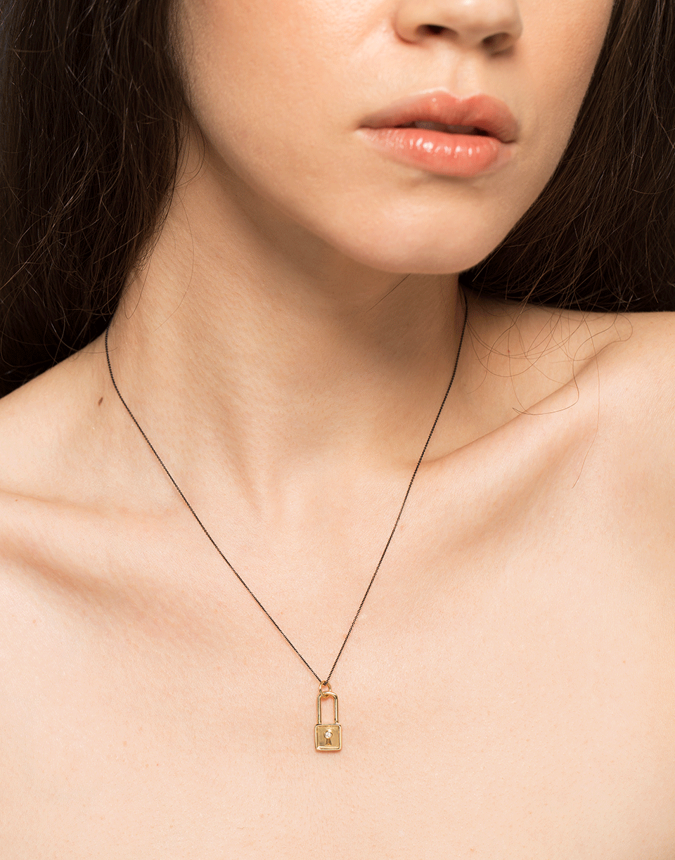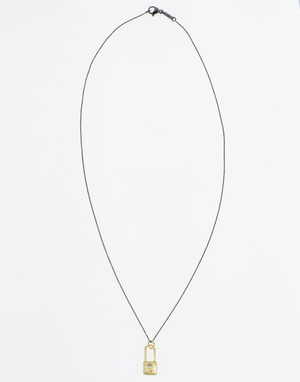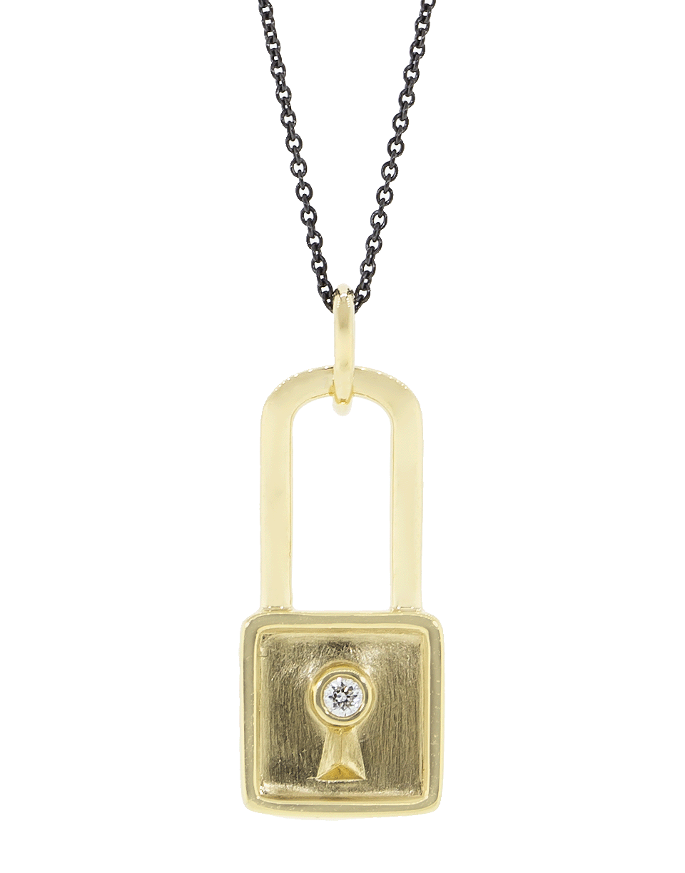 This square lock charm necklace from Monica Rich Kosann features a lightweight 18k yellow gold square lock charm with a diamond keyhole and a contrasting dainty 17” black steel chain.