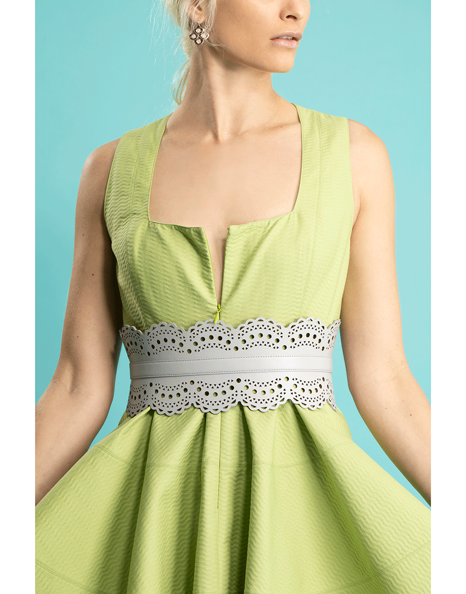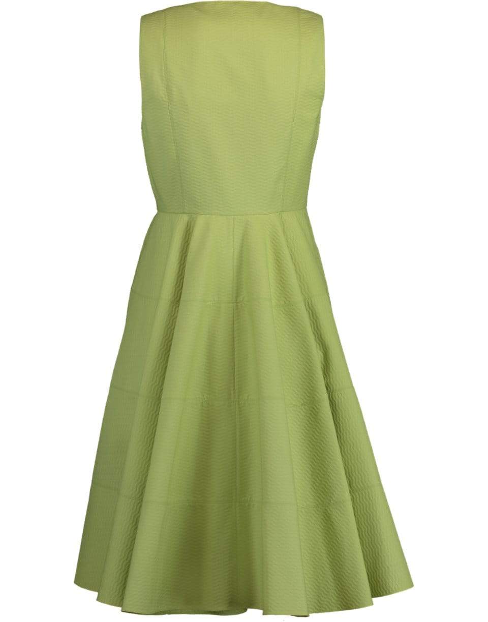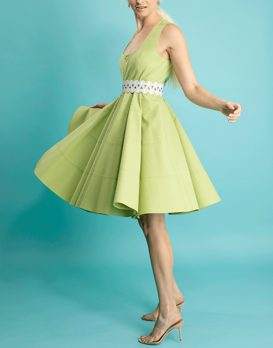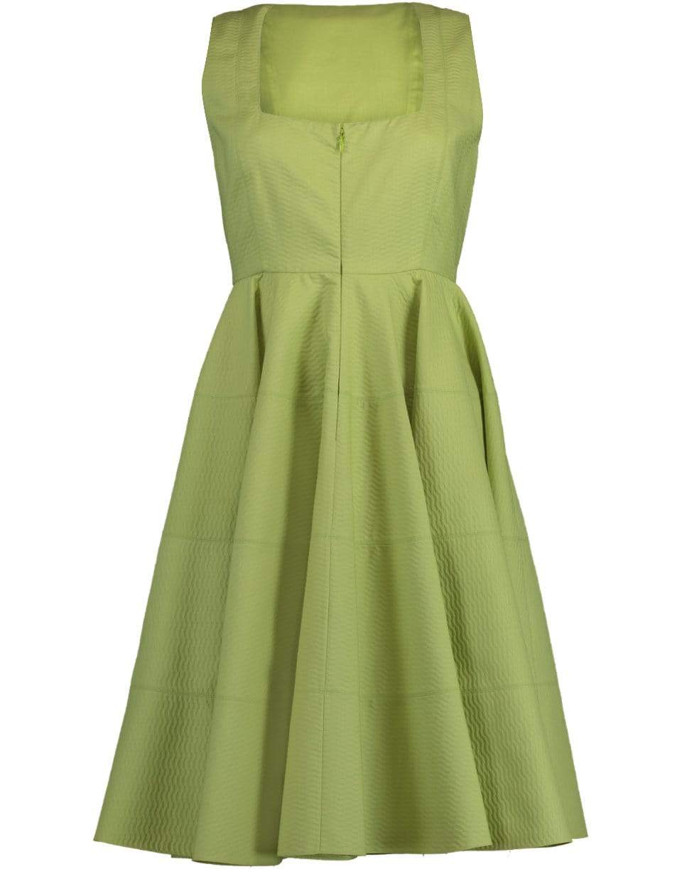 Alaia sleeveless square neck dress with a fitted bodice, front zip closure, full skirt, and a knee length.