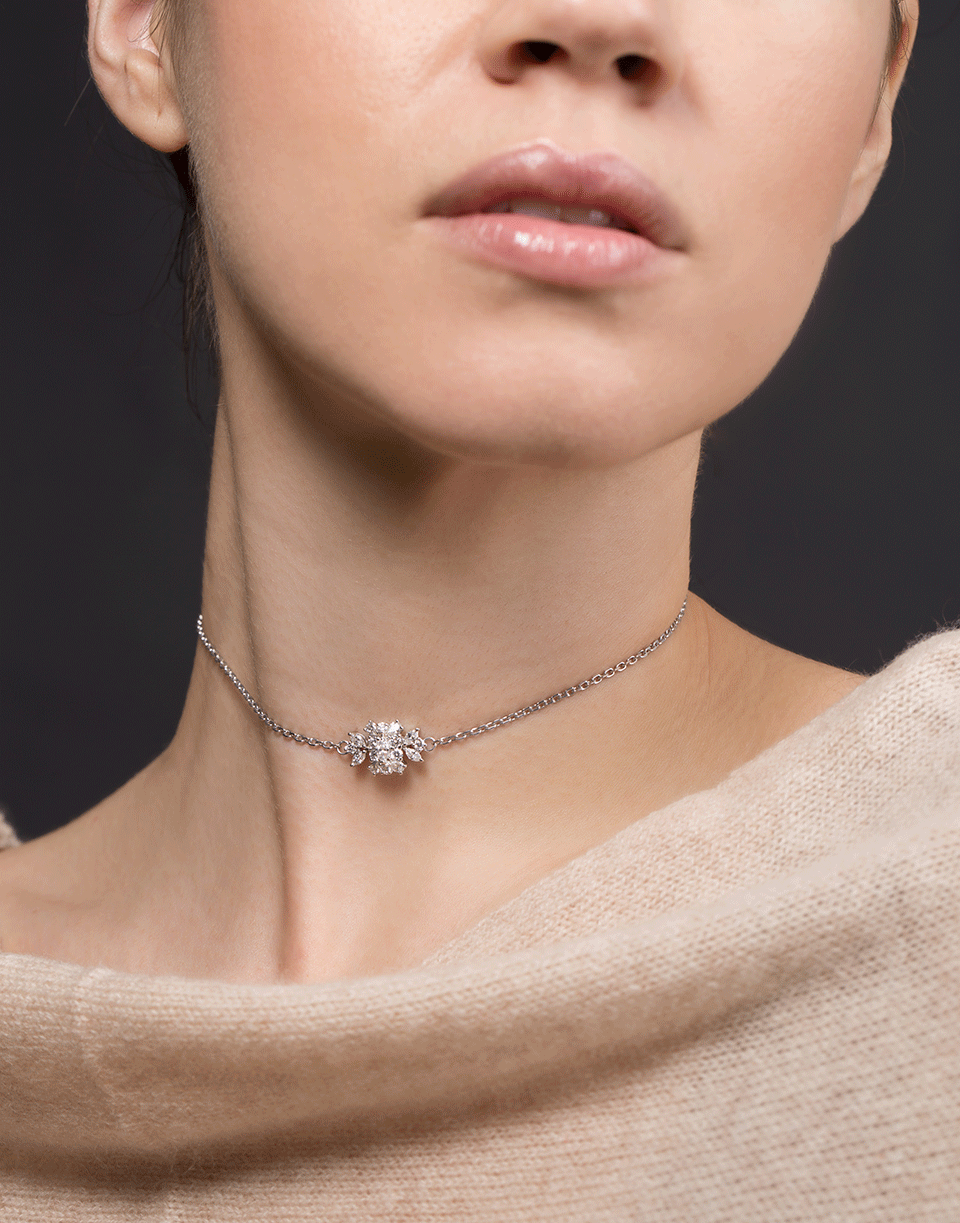 Yeprem 18k white gold choker with a square diamond pendant with clasp closure.