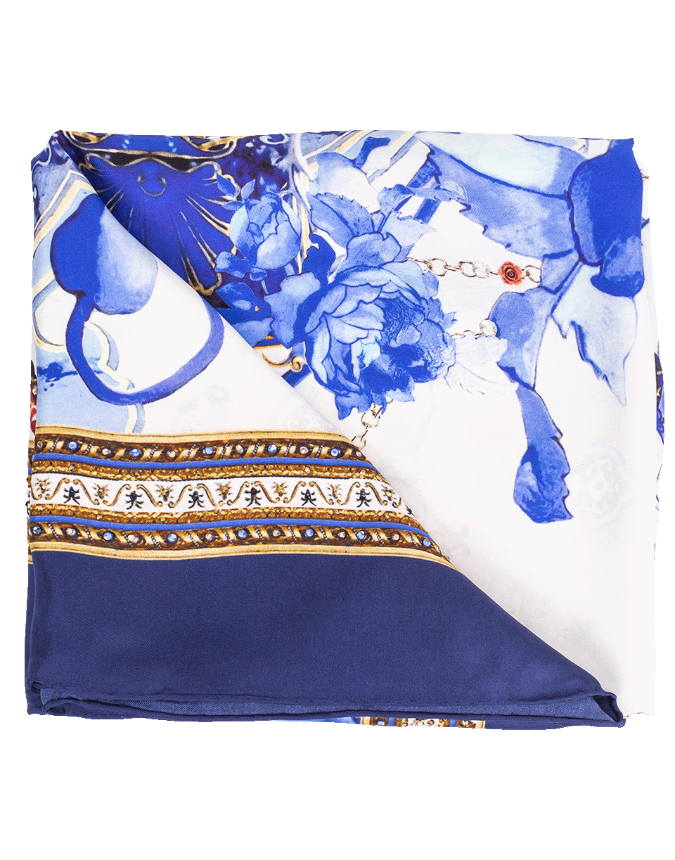 This square silk scarf by Camilla features a 16th century French print and crystal embellishment detailing. It can be tied around your hair or around your favorite woven bag.