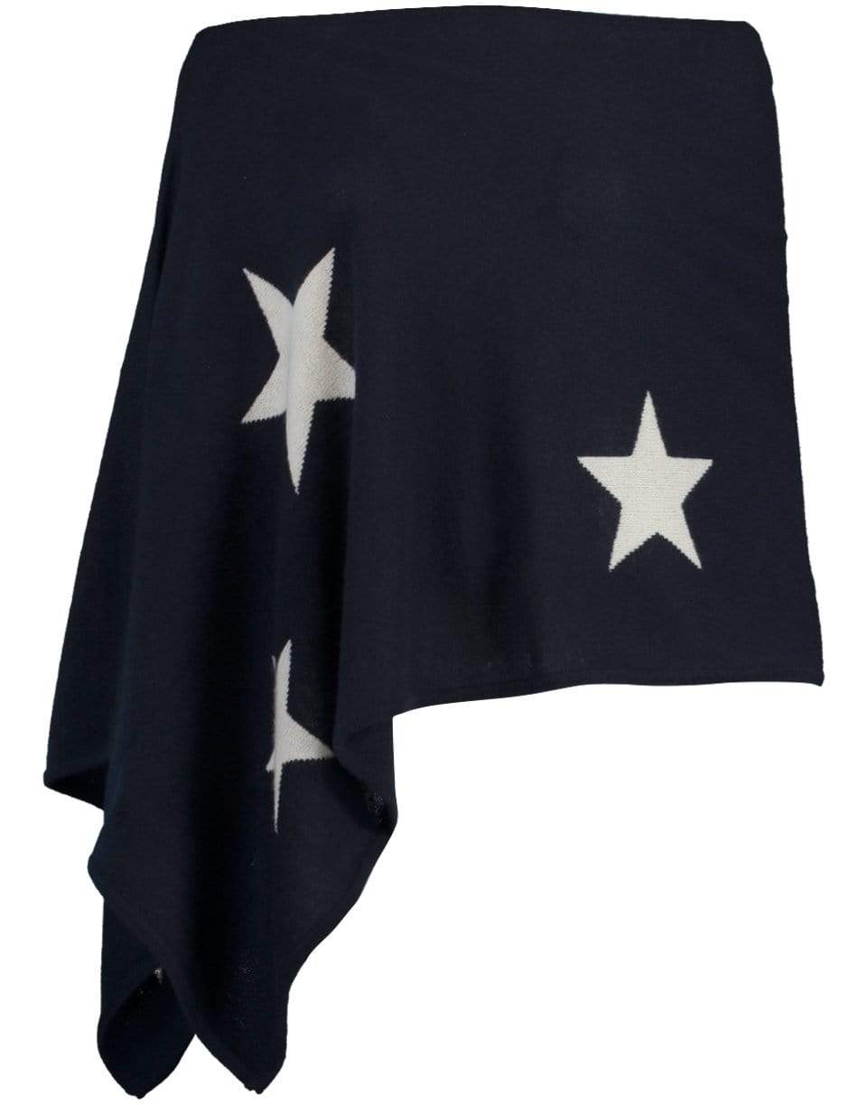 Claudia Nichole intarsia topper with stars. Off shoulder boat neckline with a loose fitting silhouette and draped hem.