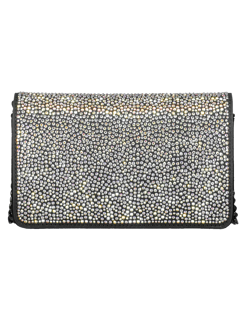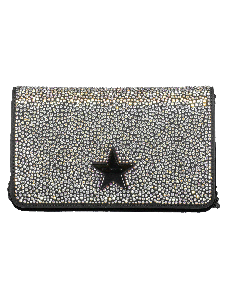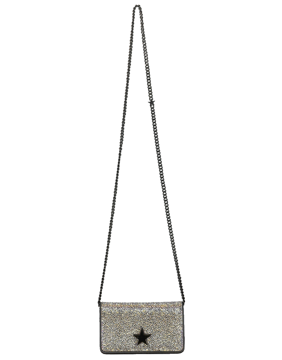 Rhinestone star shoulder bag by Stella McCartney. This rhinestone studded shoulder bag features a magnetic flapover front with a star shaped logo plaque gunmetal hardware, faux leather trim, internal slip pocket and star detailing on a 55” shoulder chain strap.