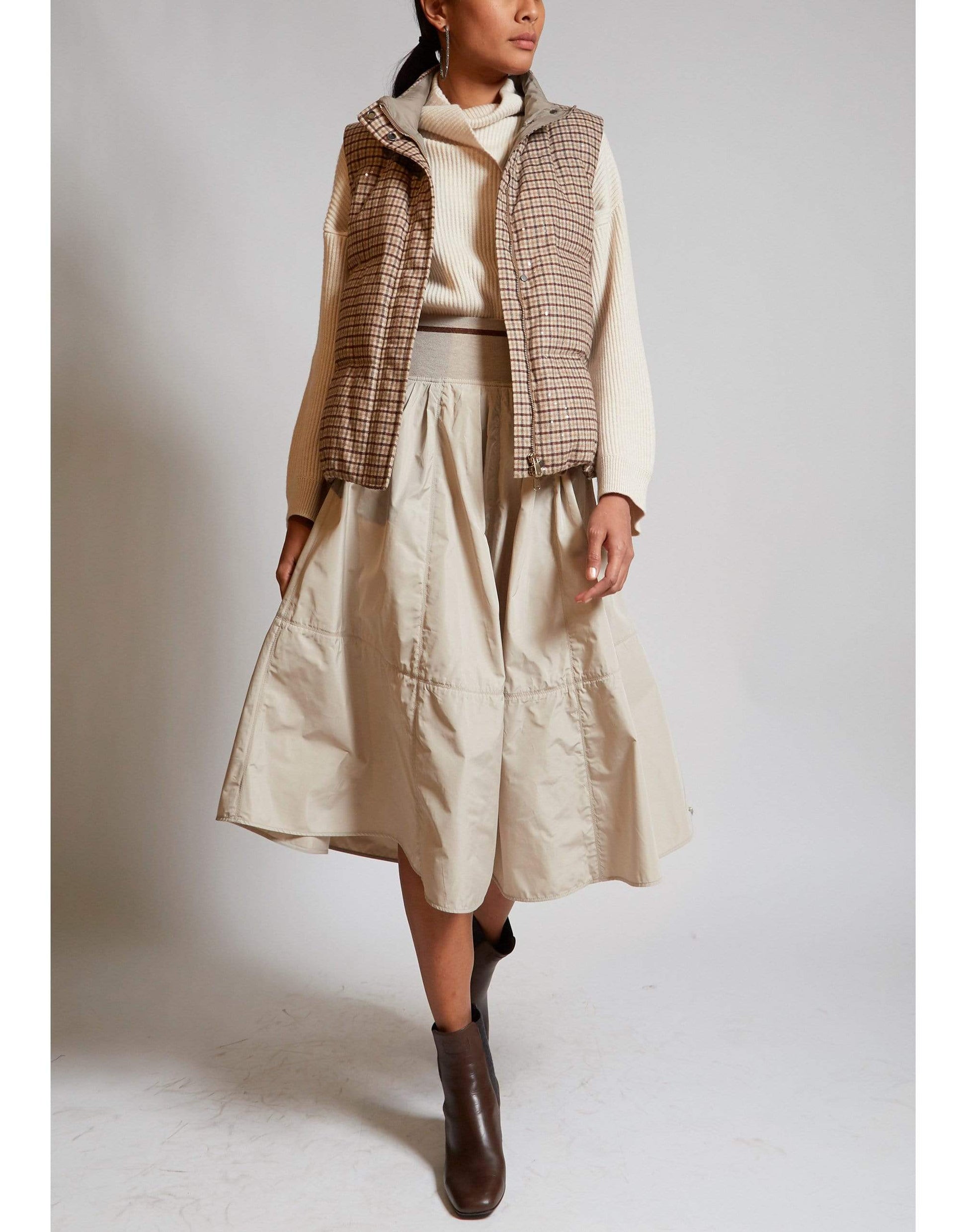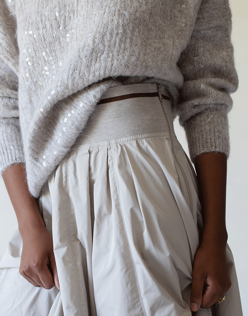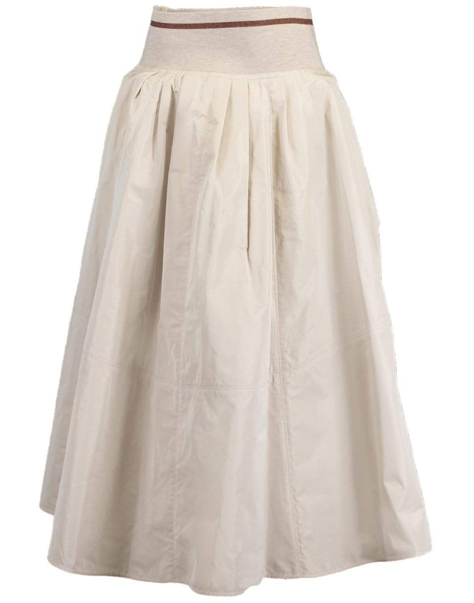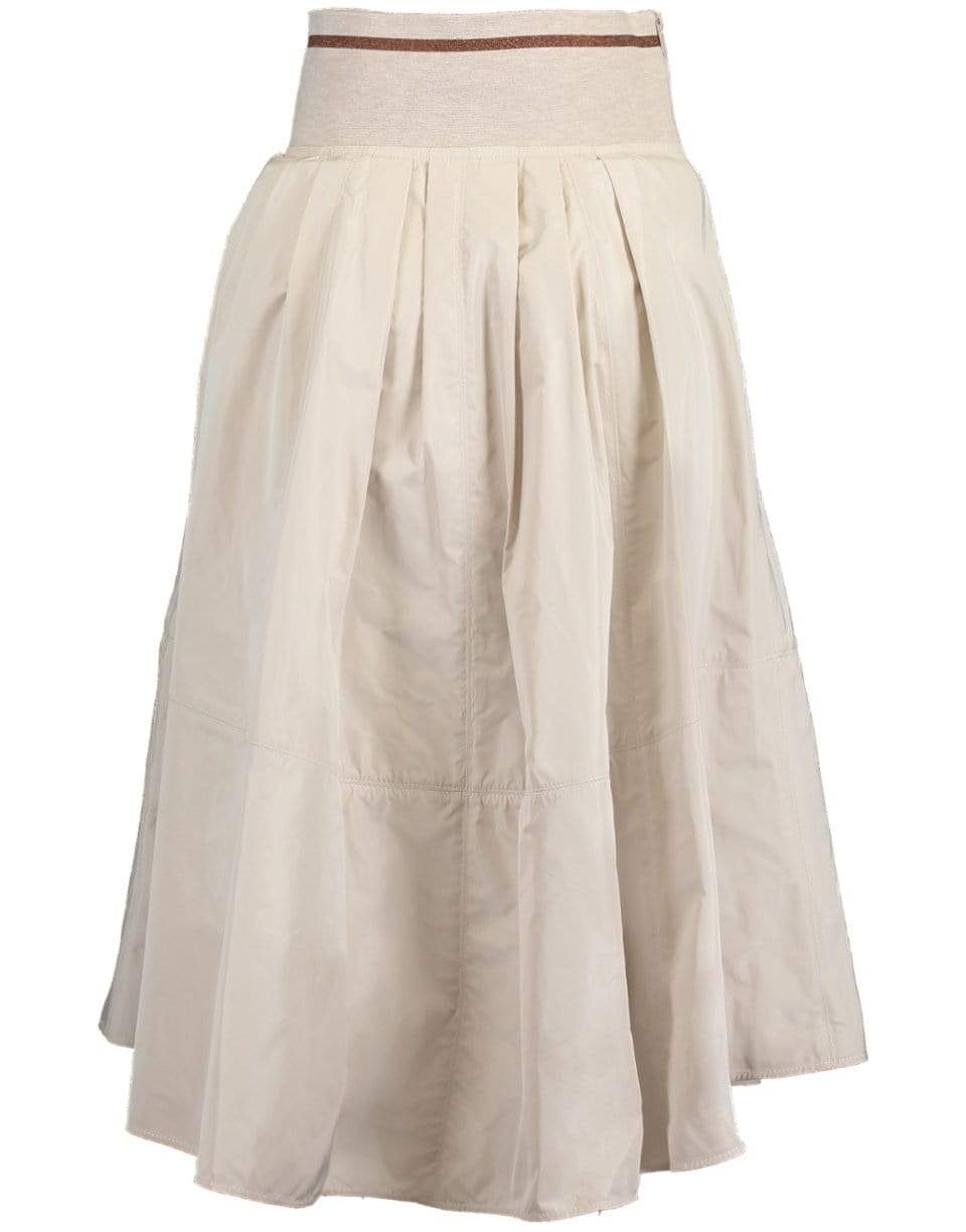 Brunello Cucinelli stone taffeta and jersey striped waistband skirt with exposed side zip closure and a calf length.