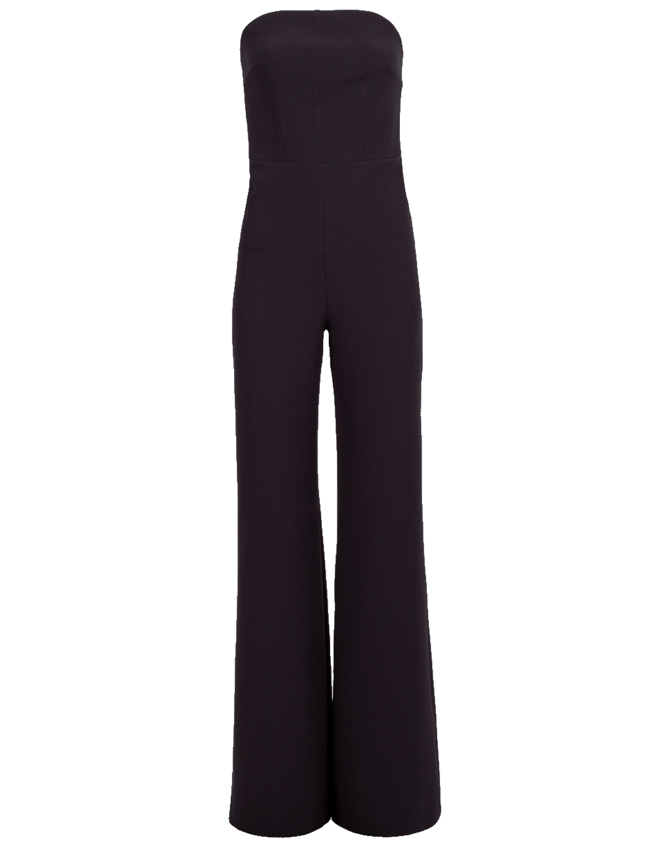 You can always trust Safiyaa to provide modern eveningwear pieces with timeless elegance. This feminine jumpsuit features a strapless fitted bodice with a concealed zip closure along the back and a flattering wide-leg silhouette. Wear it with the matching grand sleeve topper for an elevated dramatic look.