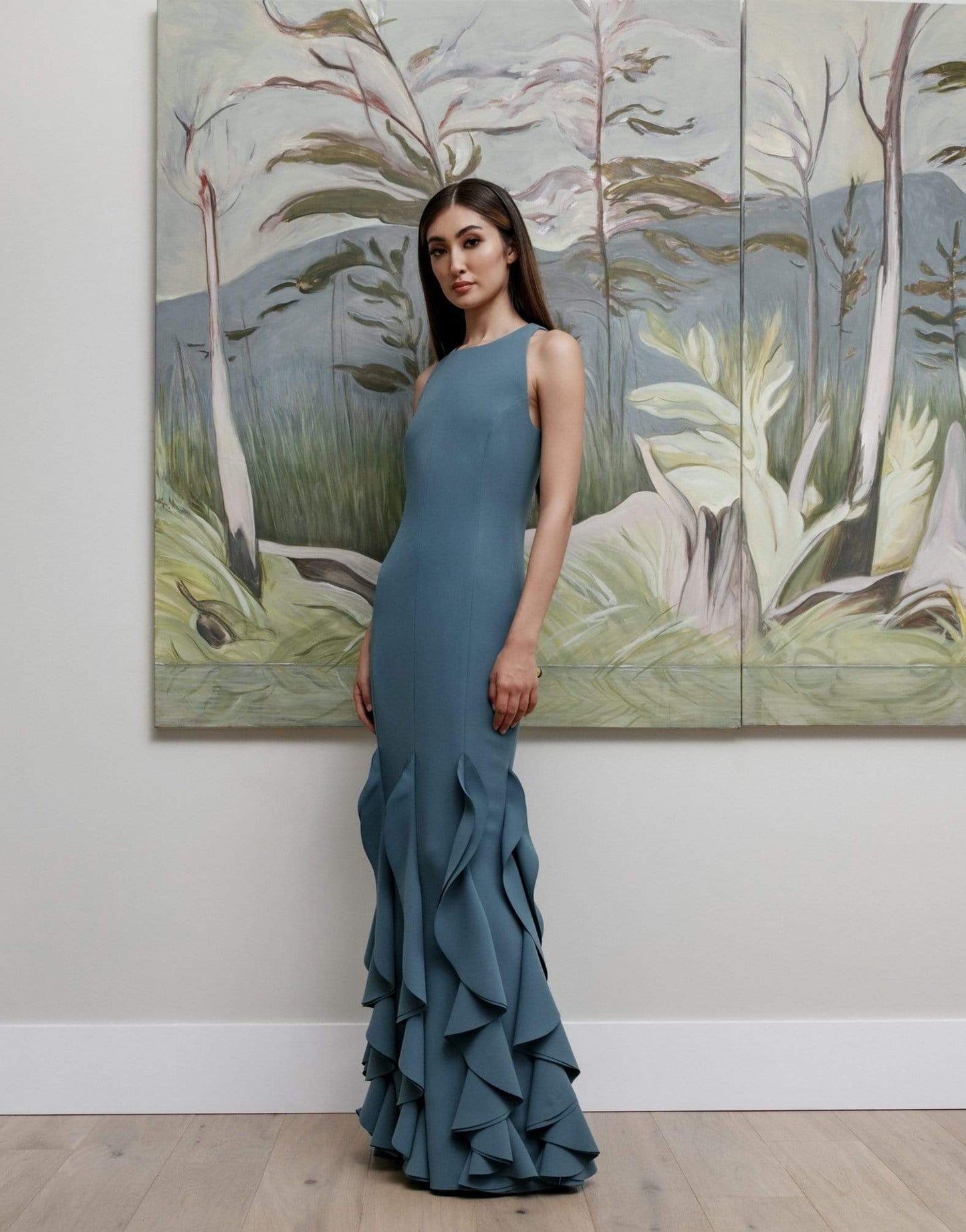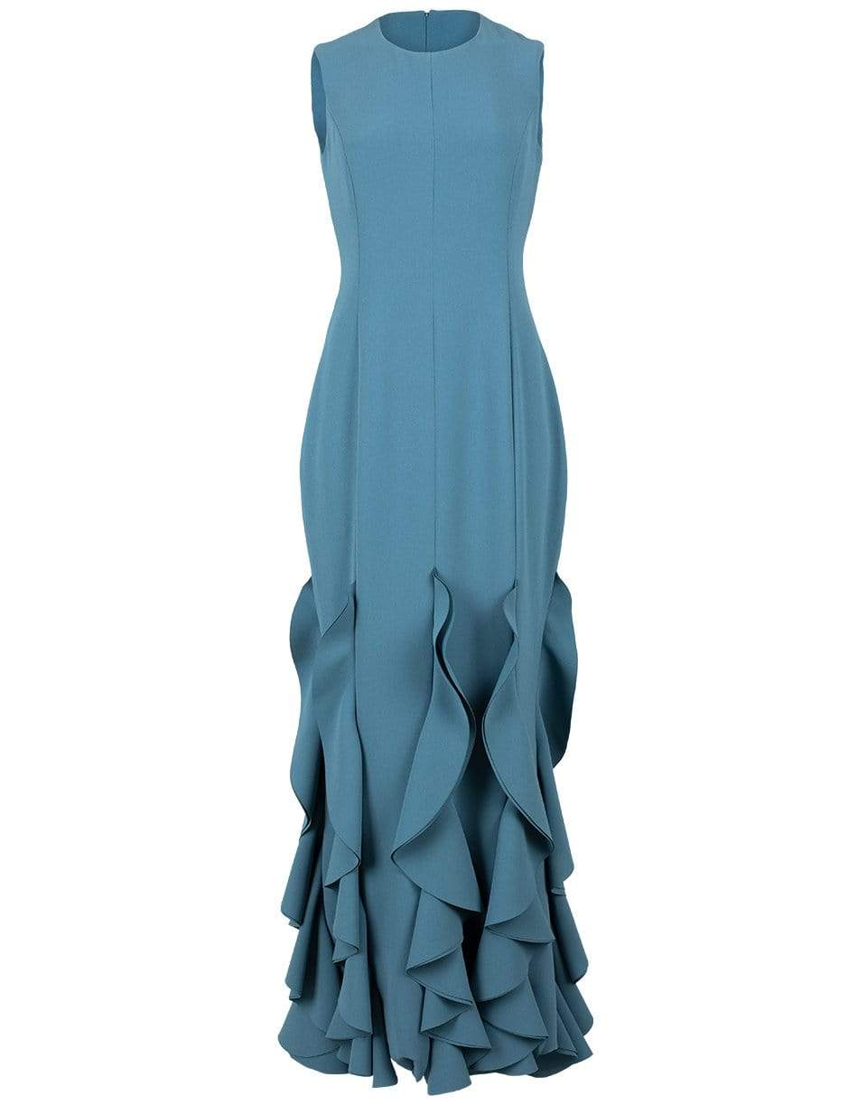 Sleeveless Catherine Regehr spanish crepe light teal stream tank sheath gown with a ruffle wave hem. Racer neck, sleeveless, seamless centre waist, vertical seams to elongate look of bodice, silk habotai and self lined. Invisible zipper at back with hook and eye.