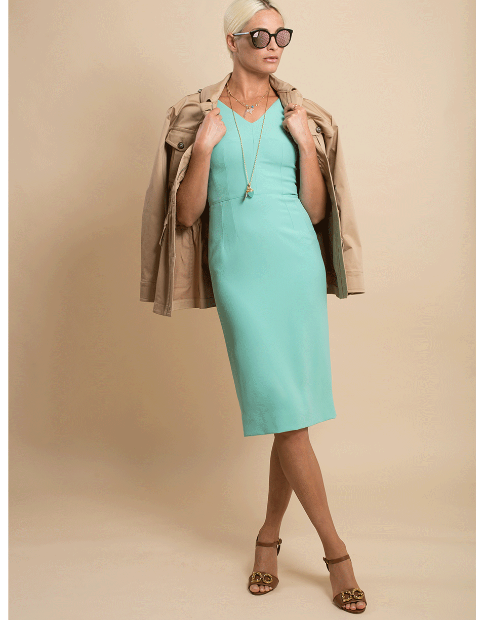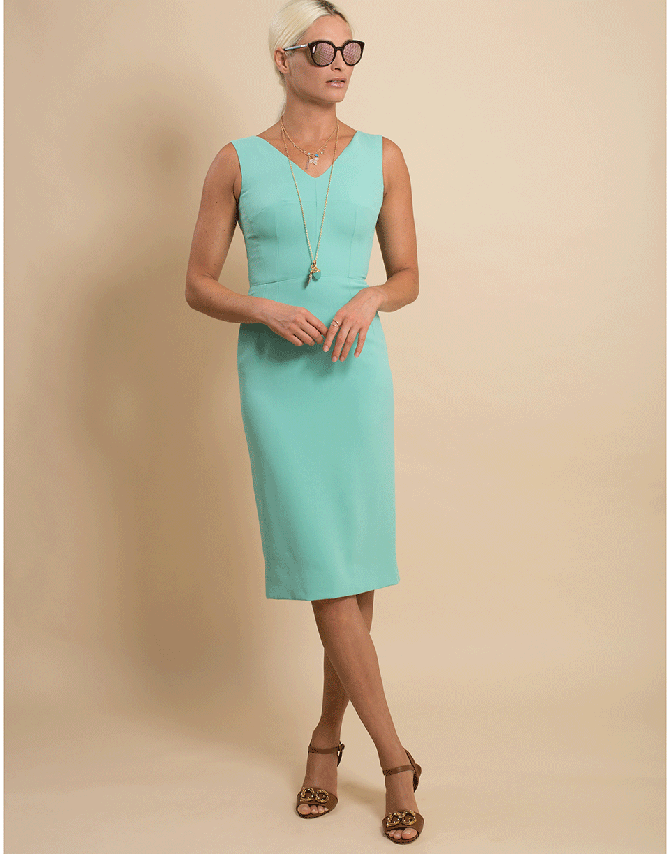 Dolce & Gabbana stretch cady sleeveless V-neck dress with a slim fit, concealed back zip closure, and a mid-length.