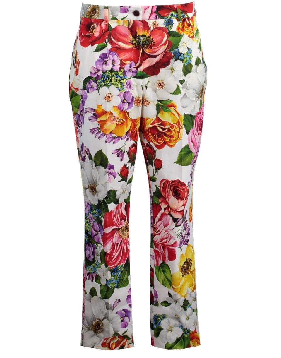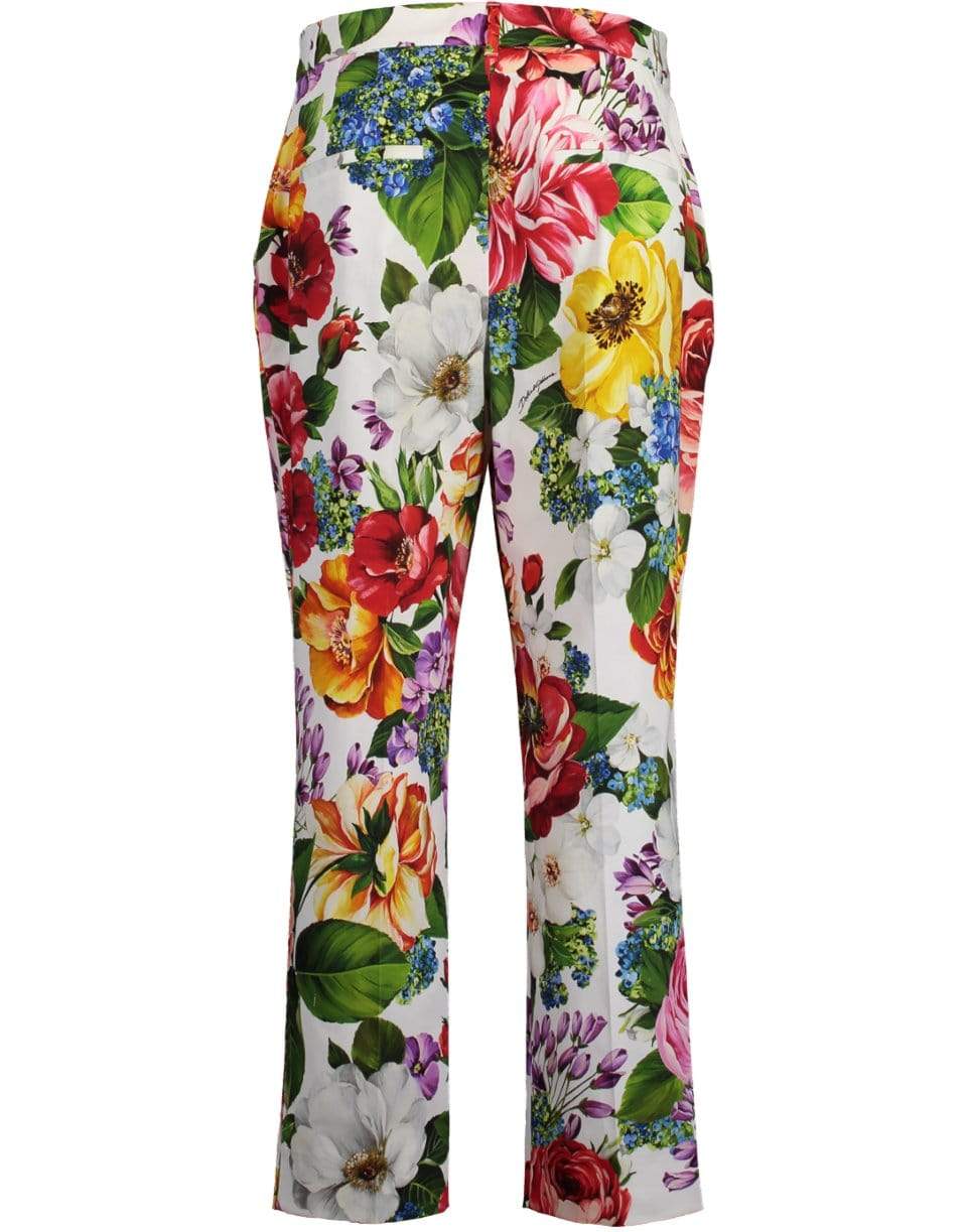 Dolce & Gabbana white mix floral print stretch trousers with a mid-rise, slim leg, button fastening, and zip fly.