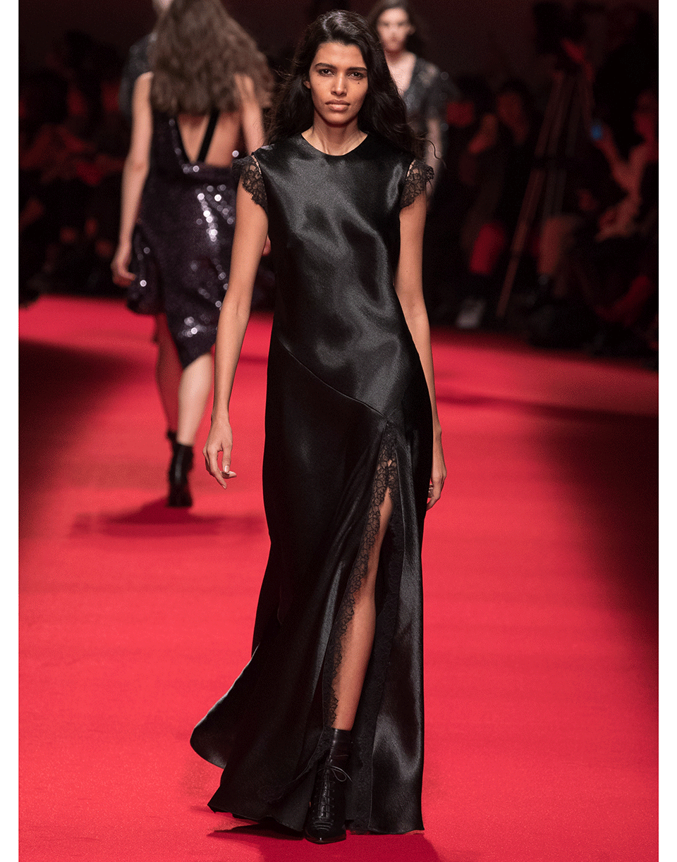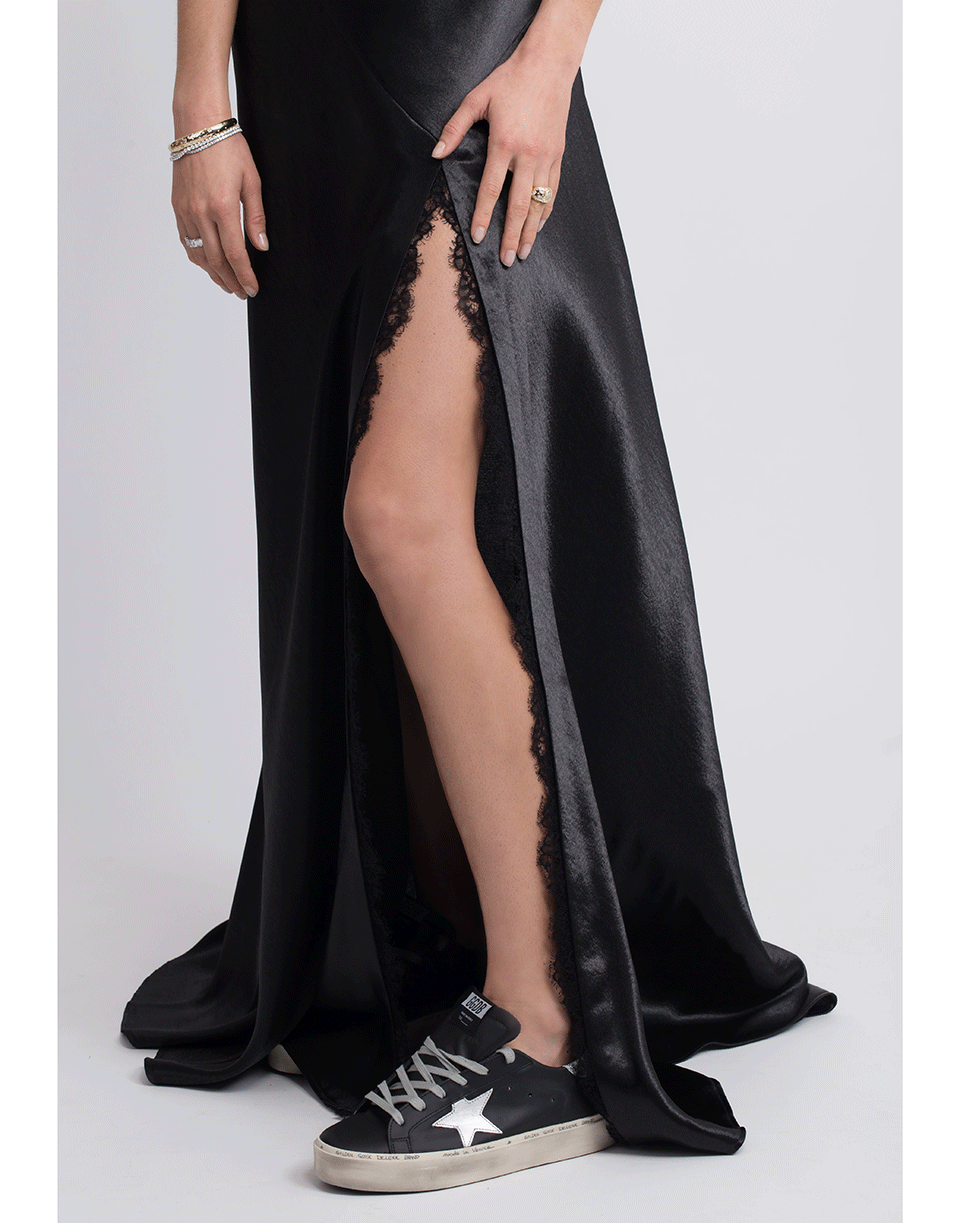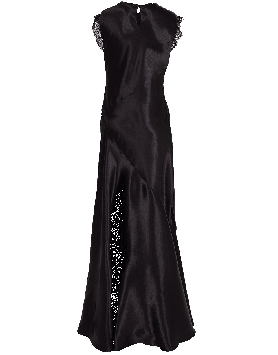 Black stretch satin gown from Philosophy di Lorenzo Serafini featuring a slim fitting maxi length with lace cap sleeves, round neck, keyhole at back, and finished with a slit.