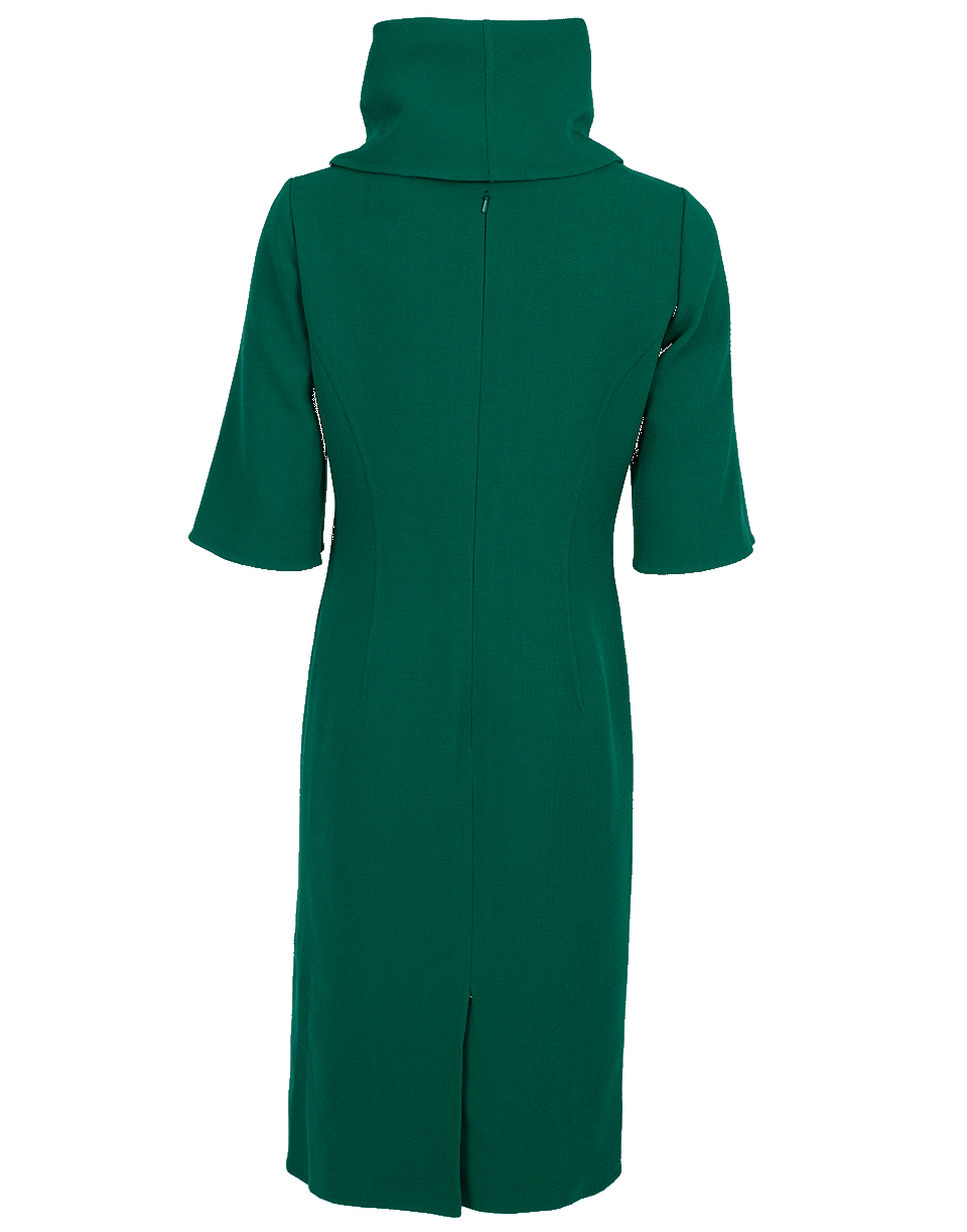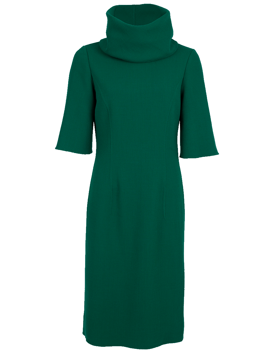 This stretch wool crepe turtleneck dress features a regular fit with a mid-length, elbow sleeves, turtleneck, and a concealed back zip closure.