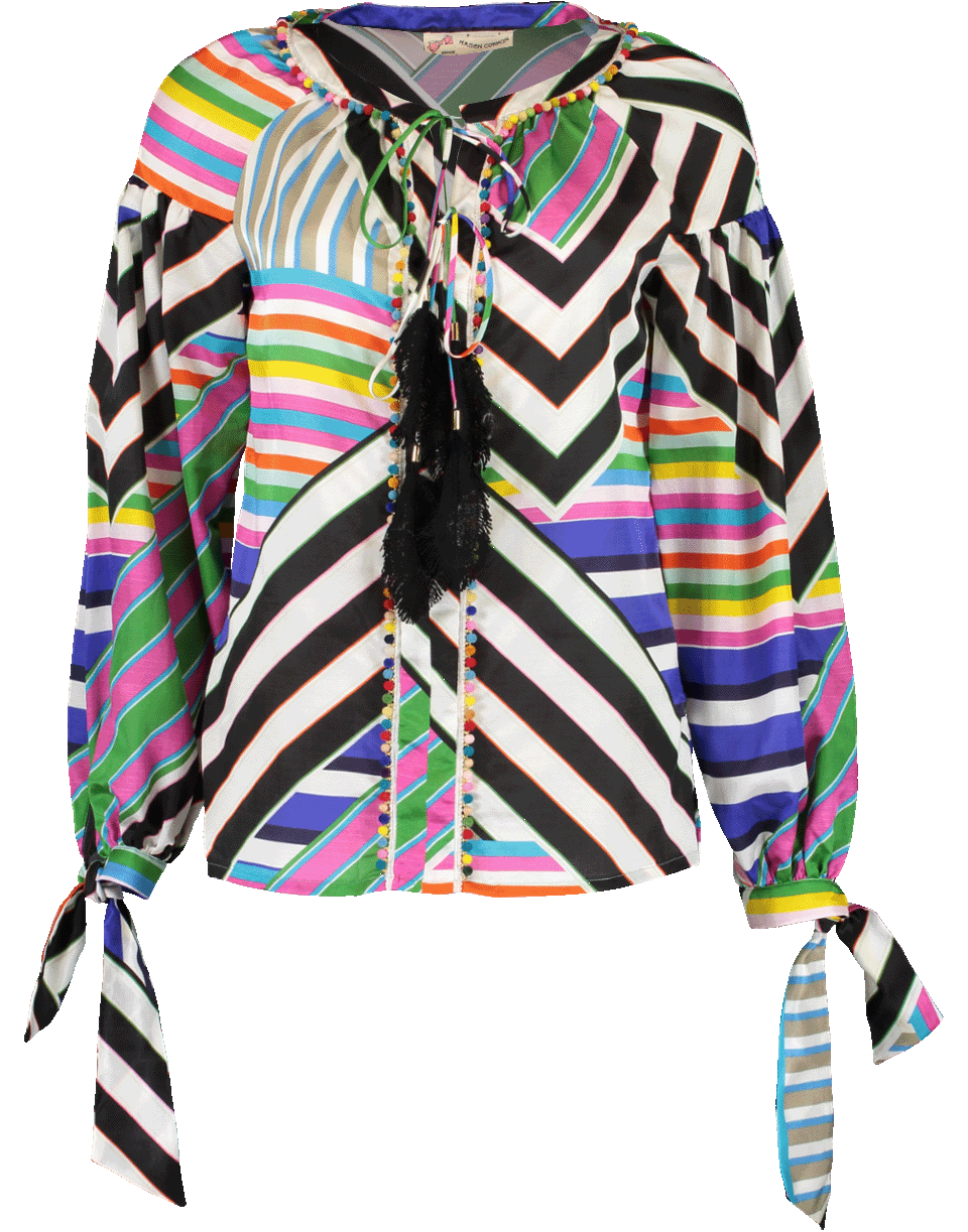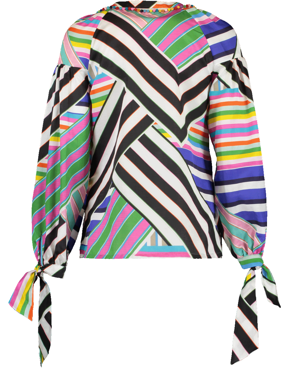 Multicolor stripe blouse by Maison Common. This silk-blend stripe blouse features a round neckline, cuff and neck ties and a stipe design with contrasting pom-pom appliques down the middle.