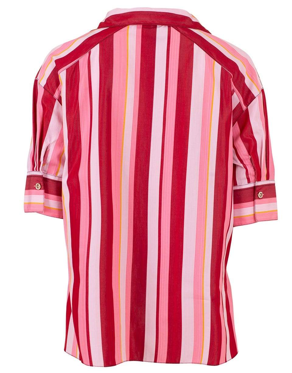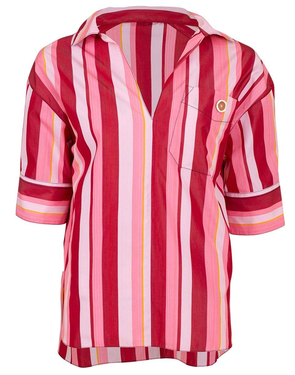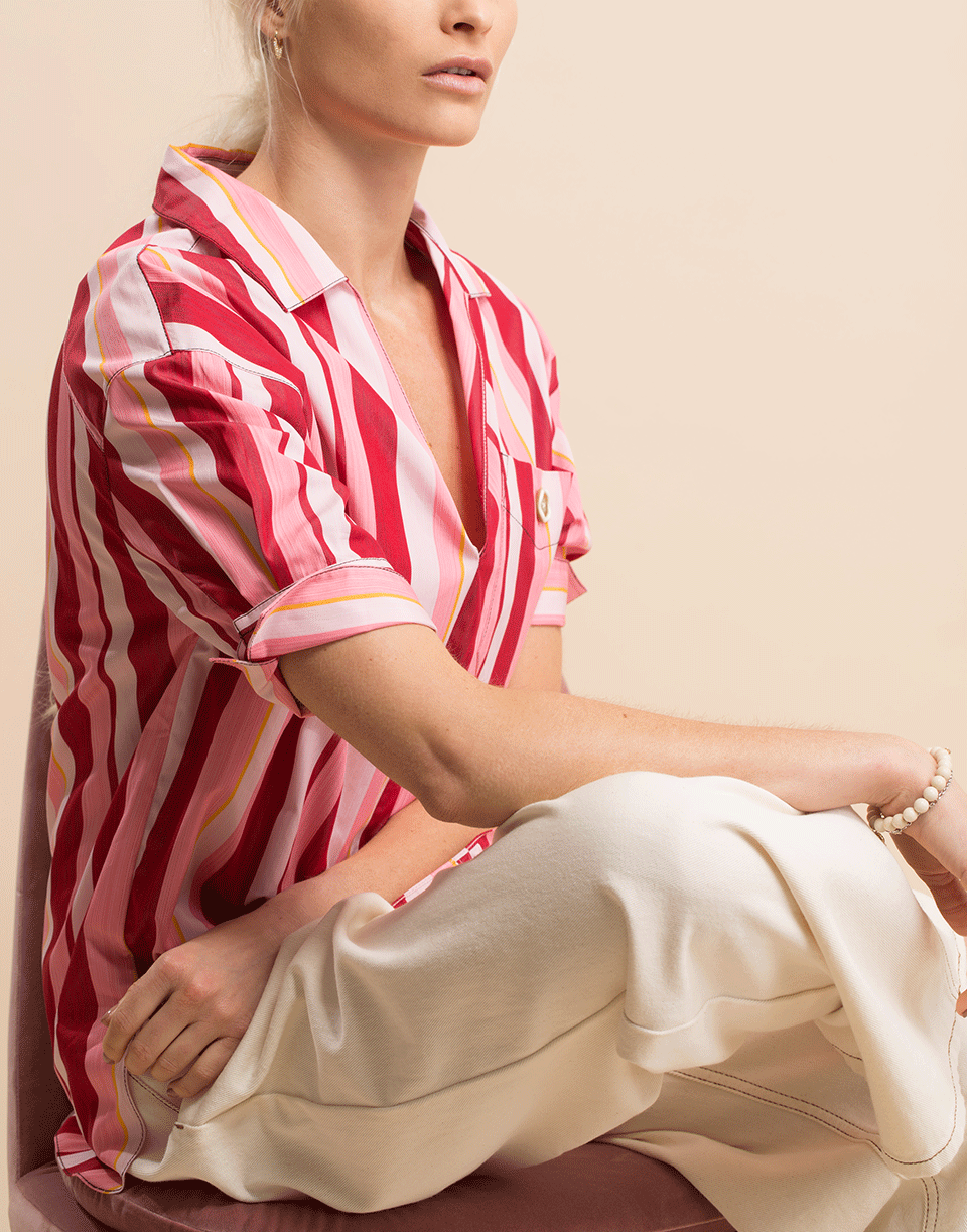 Marni striped henley shirt with short sleeves, V-neck, spread collar, chest pocket, and a boxy fit.