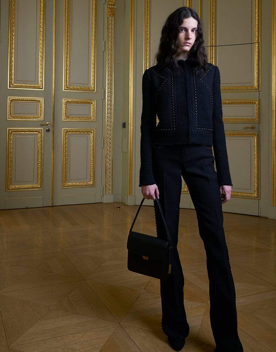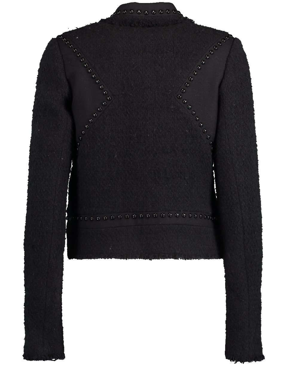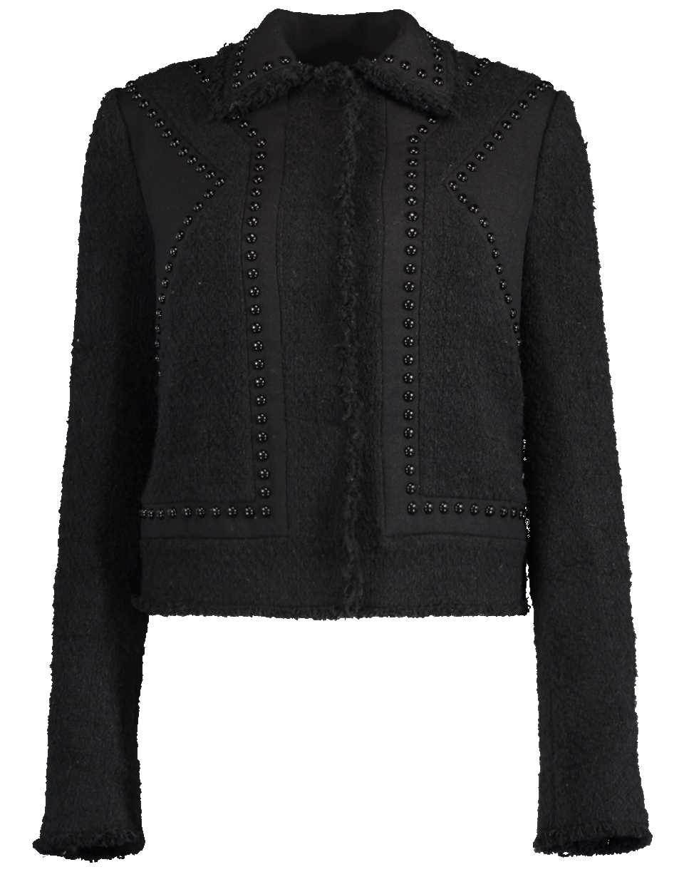 Black tweed jacket from Giambattista Valli featuring long sleeves, concealed snap button front, spread collar, and stud details.