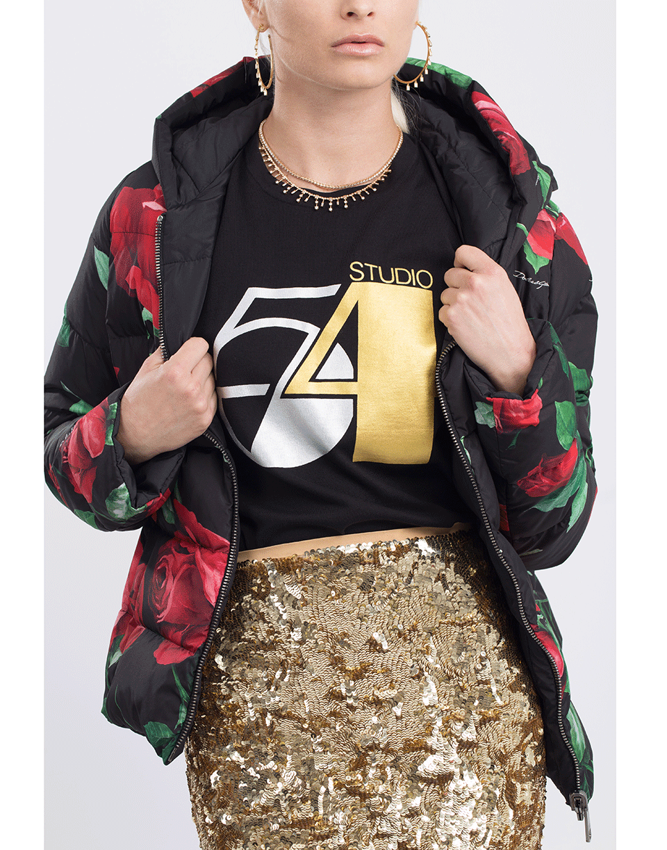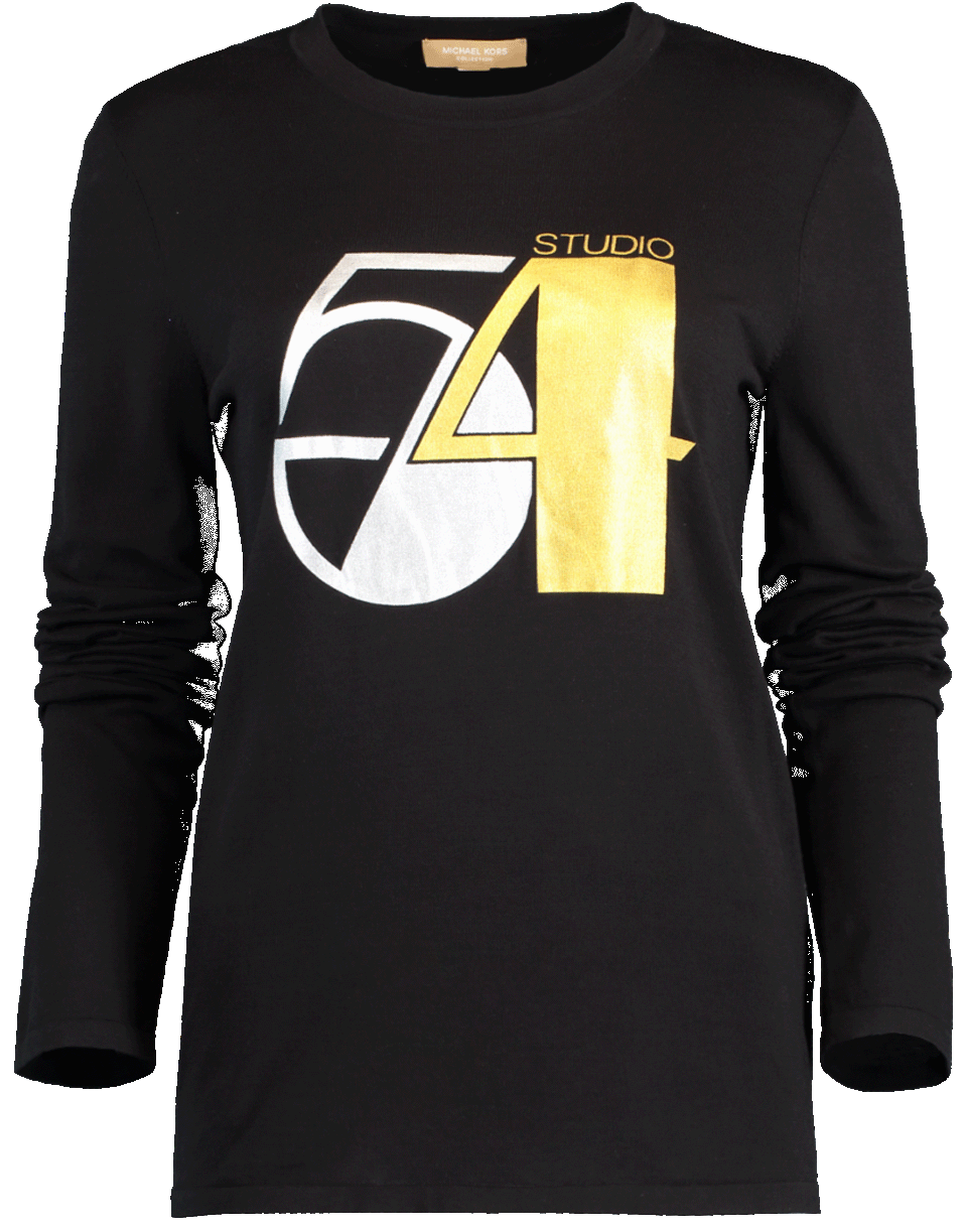 Studio 54 cotton t-shirt from Michael Kors featuring a regular fit with long sleeves, crewneck, pullover style, and a metallic Studio 54 print at front.