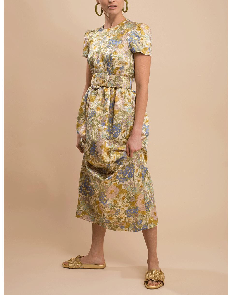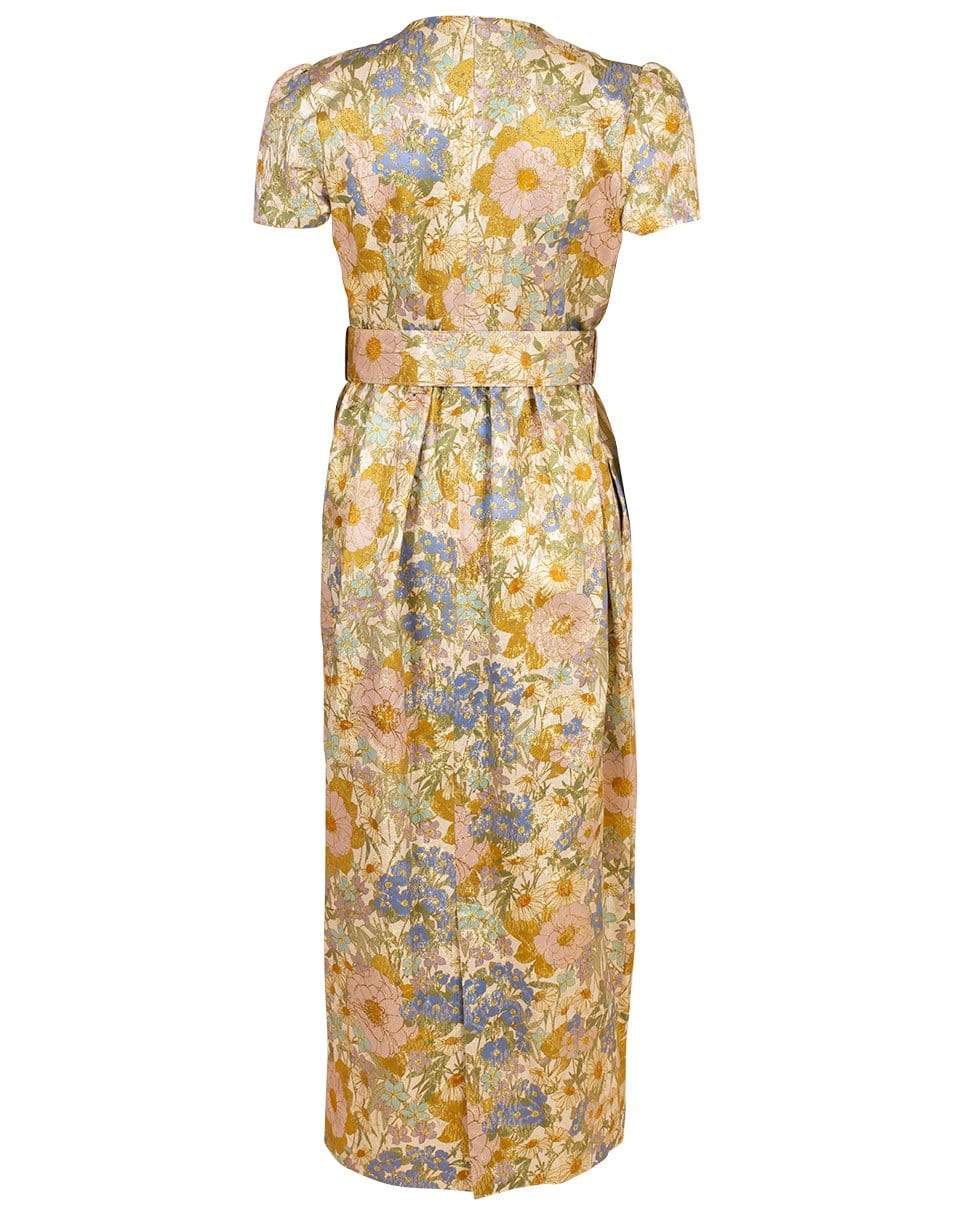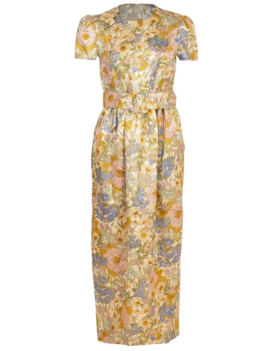 Zimmerman floral super eight brocade midi dress features a classic empire silhouette, adjustable belt. Unlined with a concealed zip astening along the back.