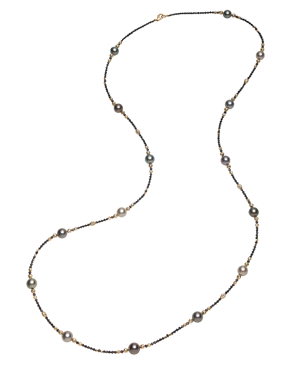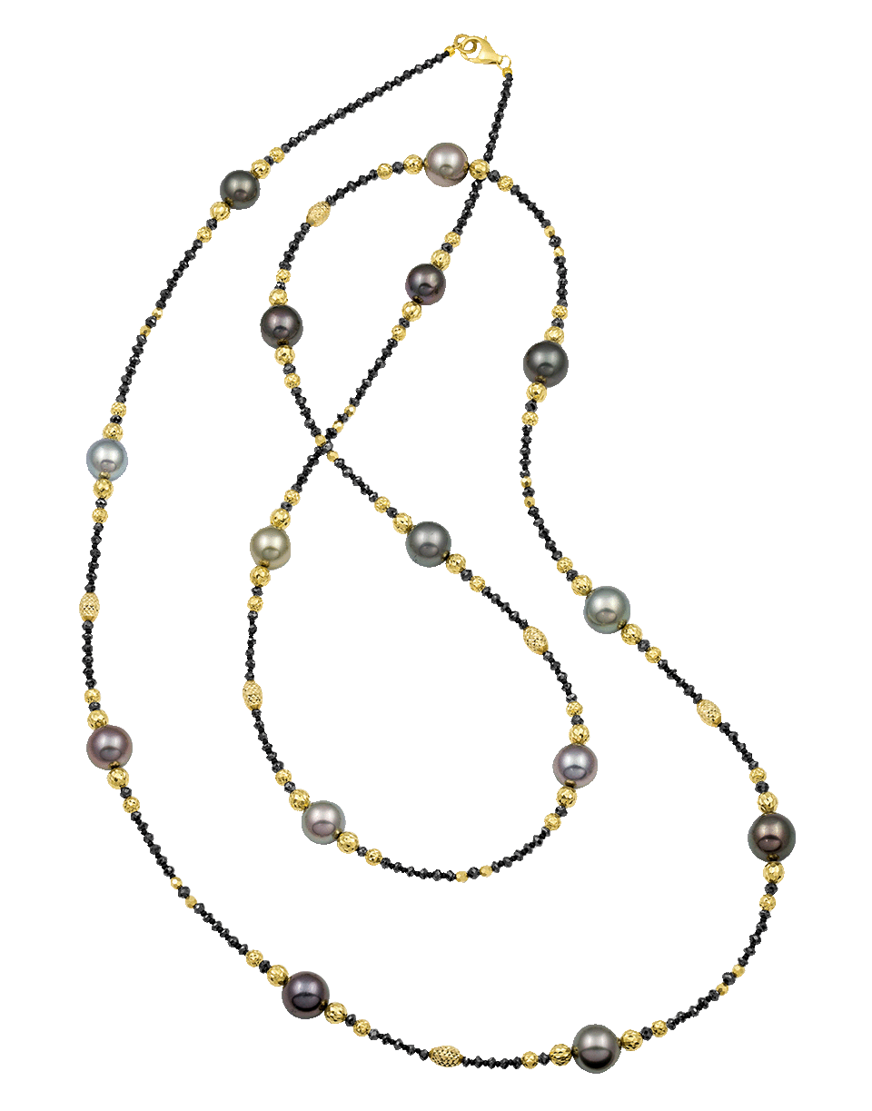 From the Biggins Black Magic Diamond Collection, this black diamond beaded necklace is designed with Tahitian cultured pearls and finished with faceted 18k yellow gold beads scattered throughout.