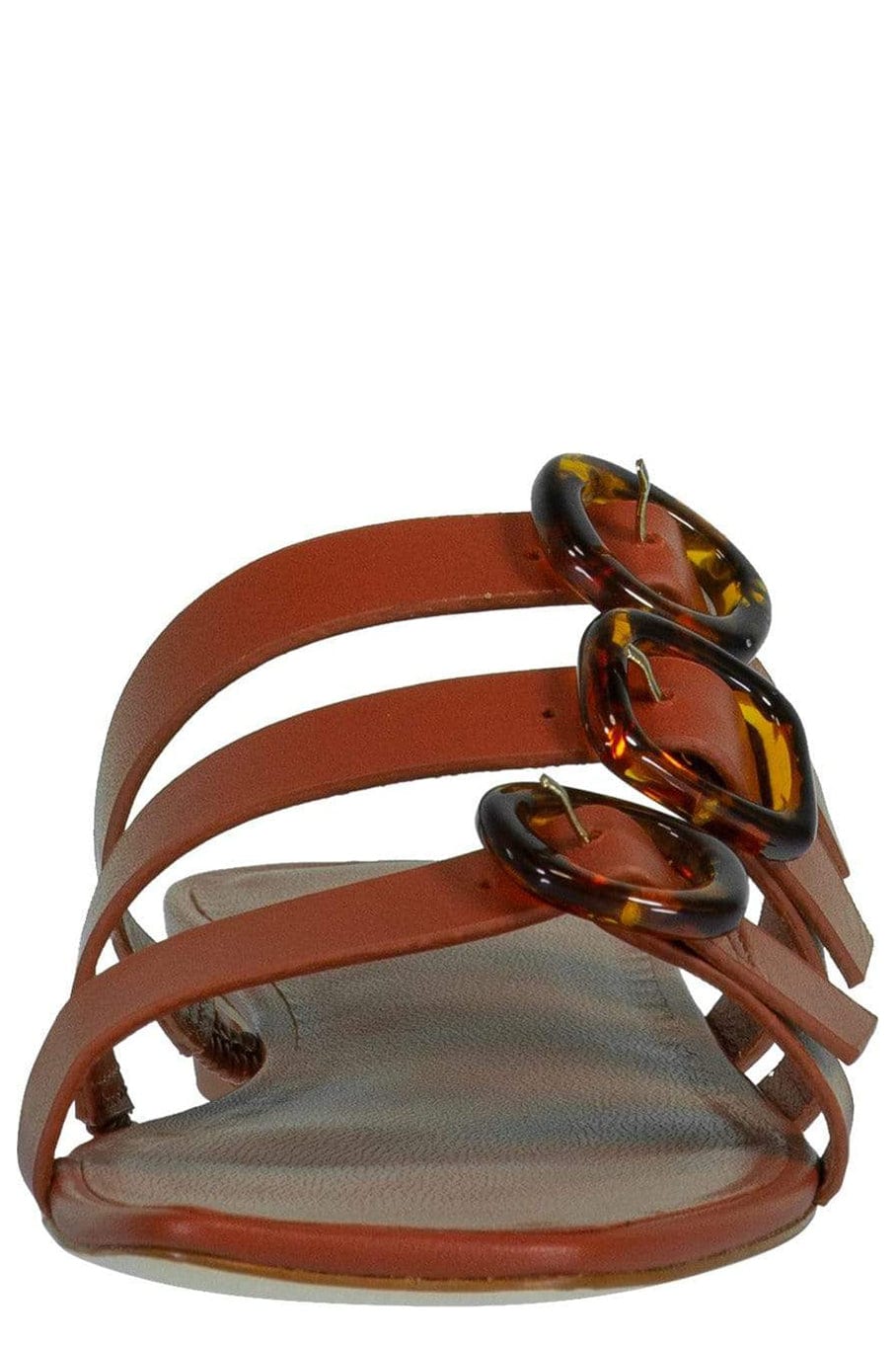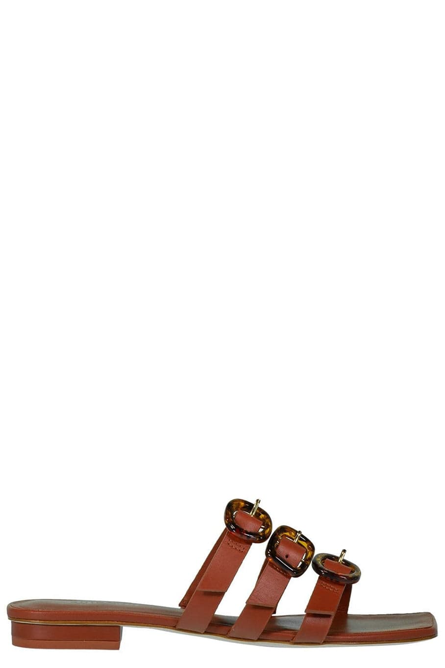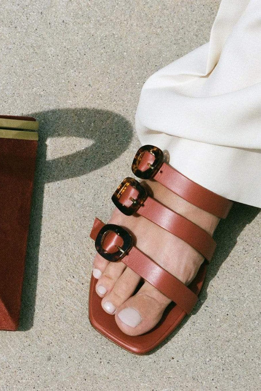 Cult Gaia Tallulah Sandal featuring a squared open toe and a three strap design with tortoiseshell acrylic buckles.