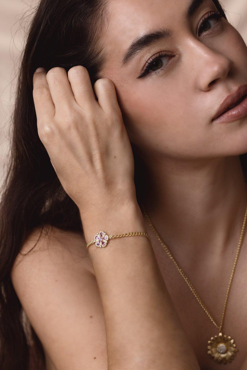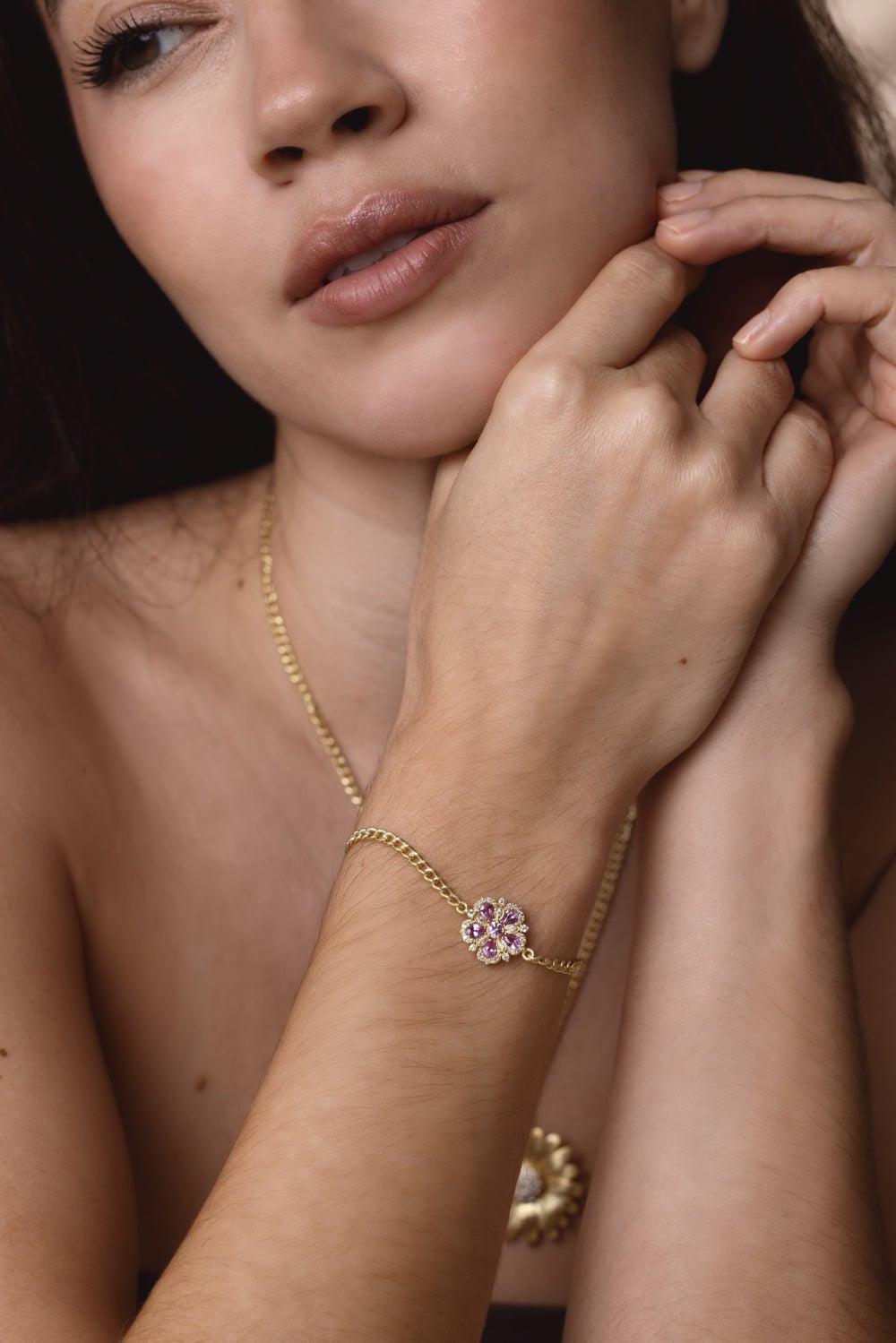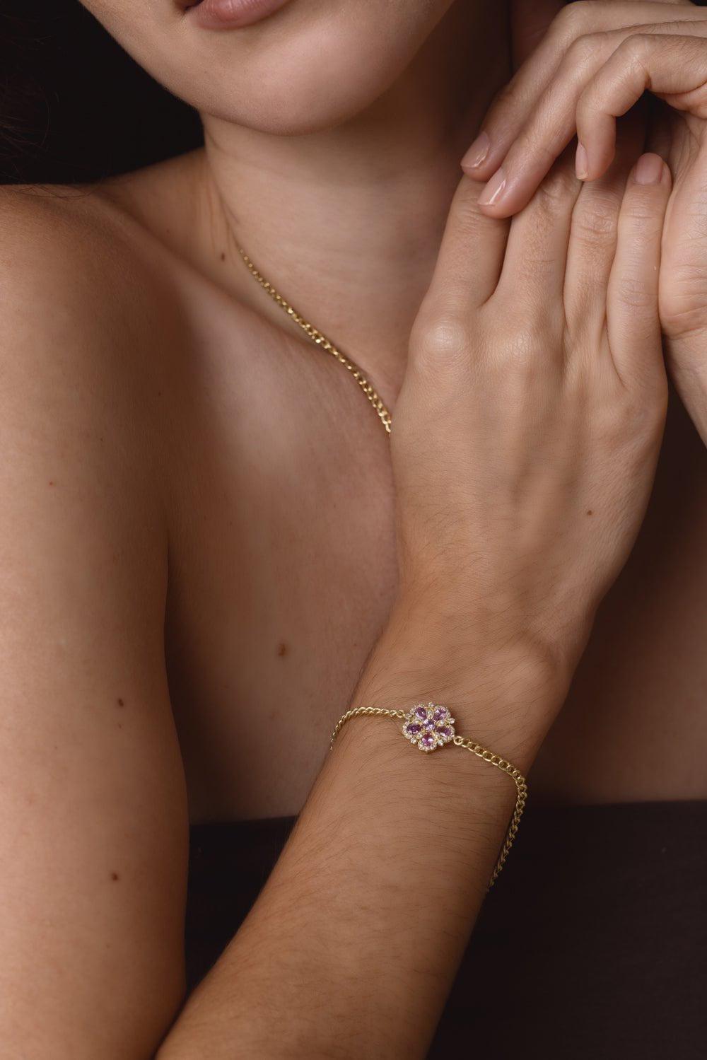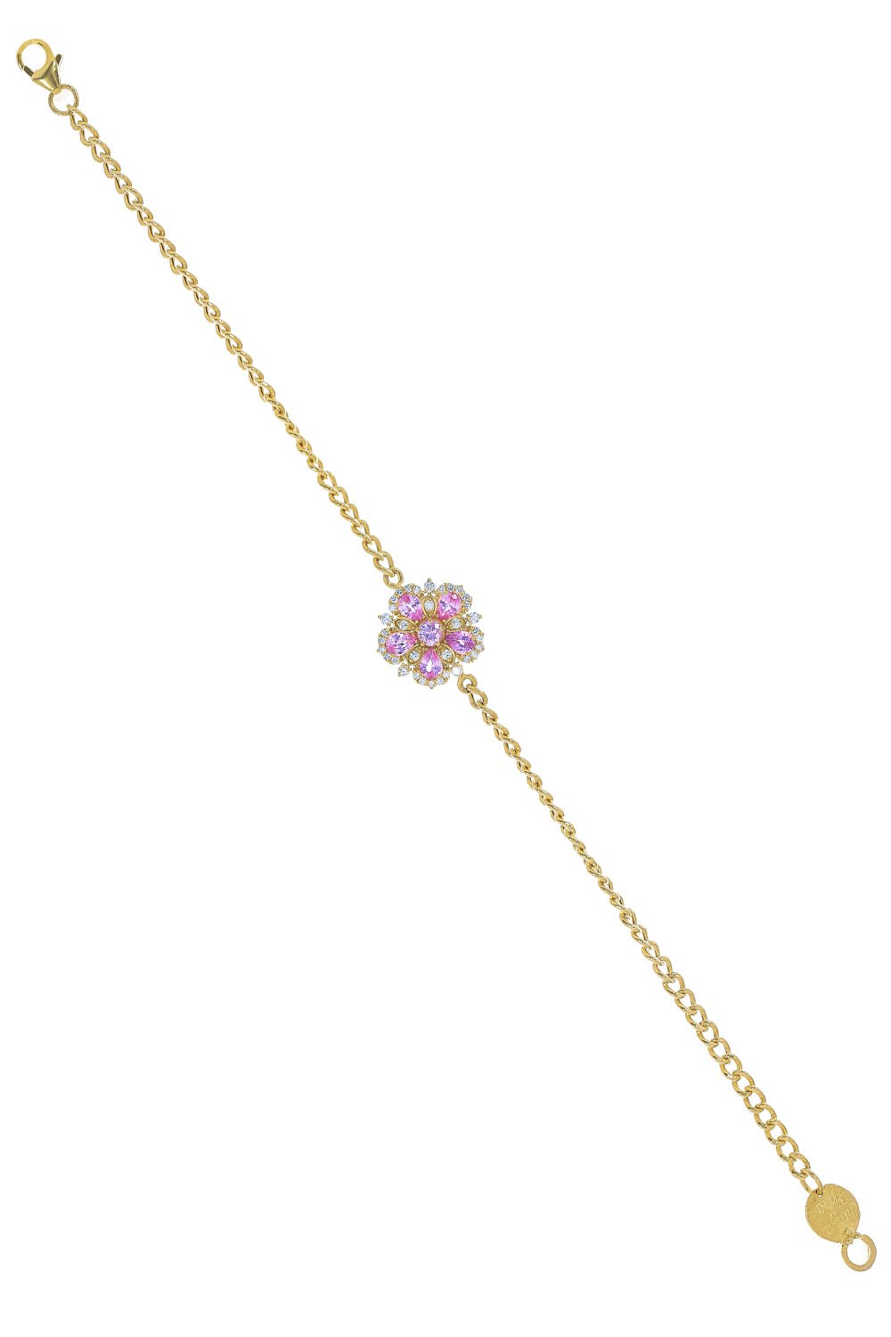 Tanya Farah jasmine bloom pink spaphire diamond flower station bracelet in yellow gold.