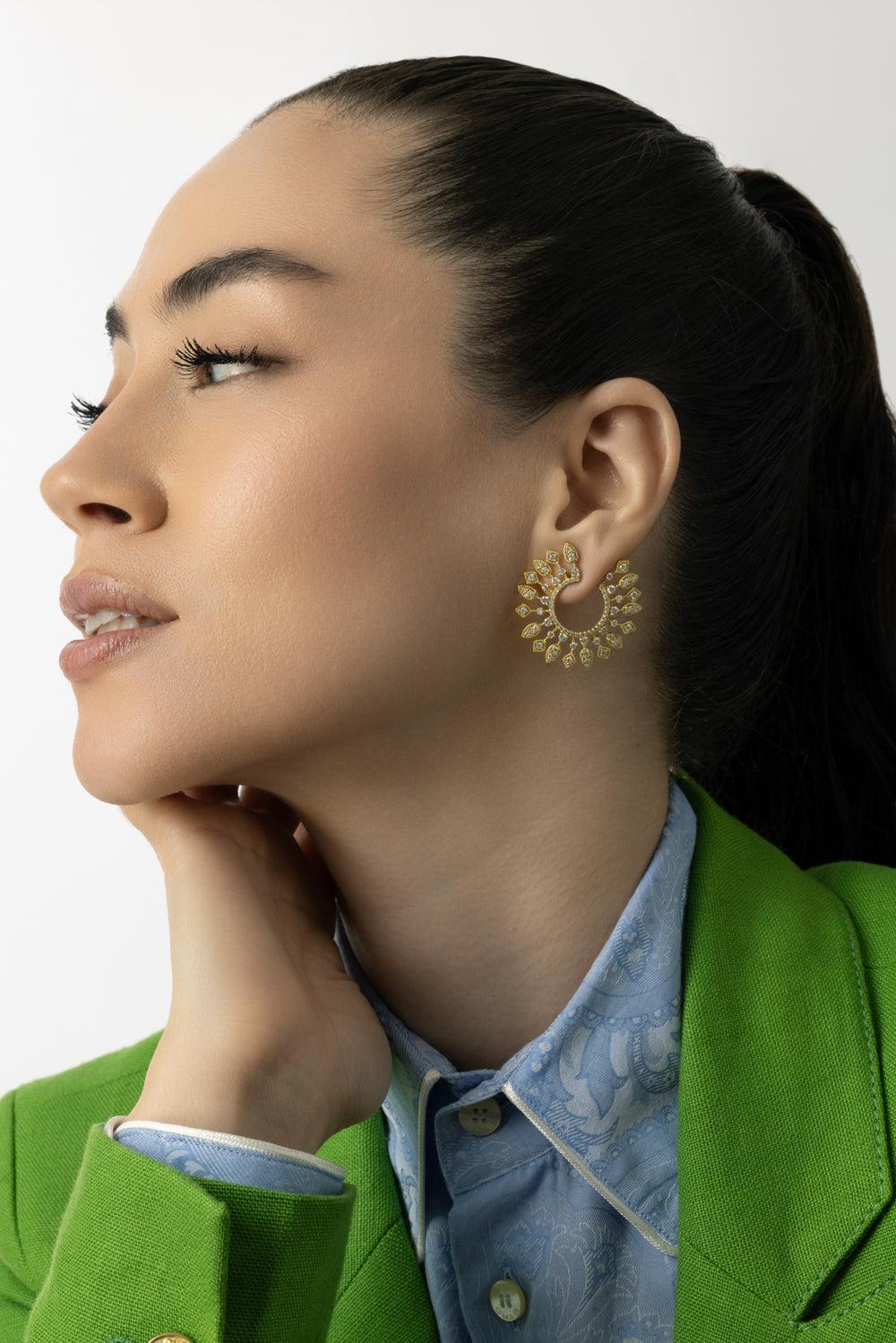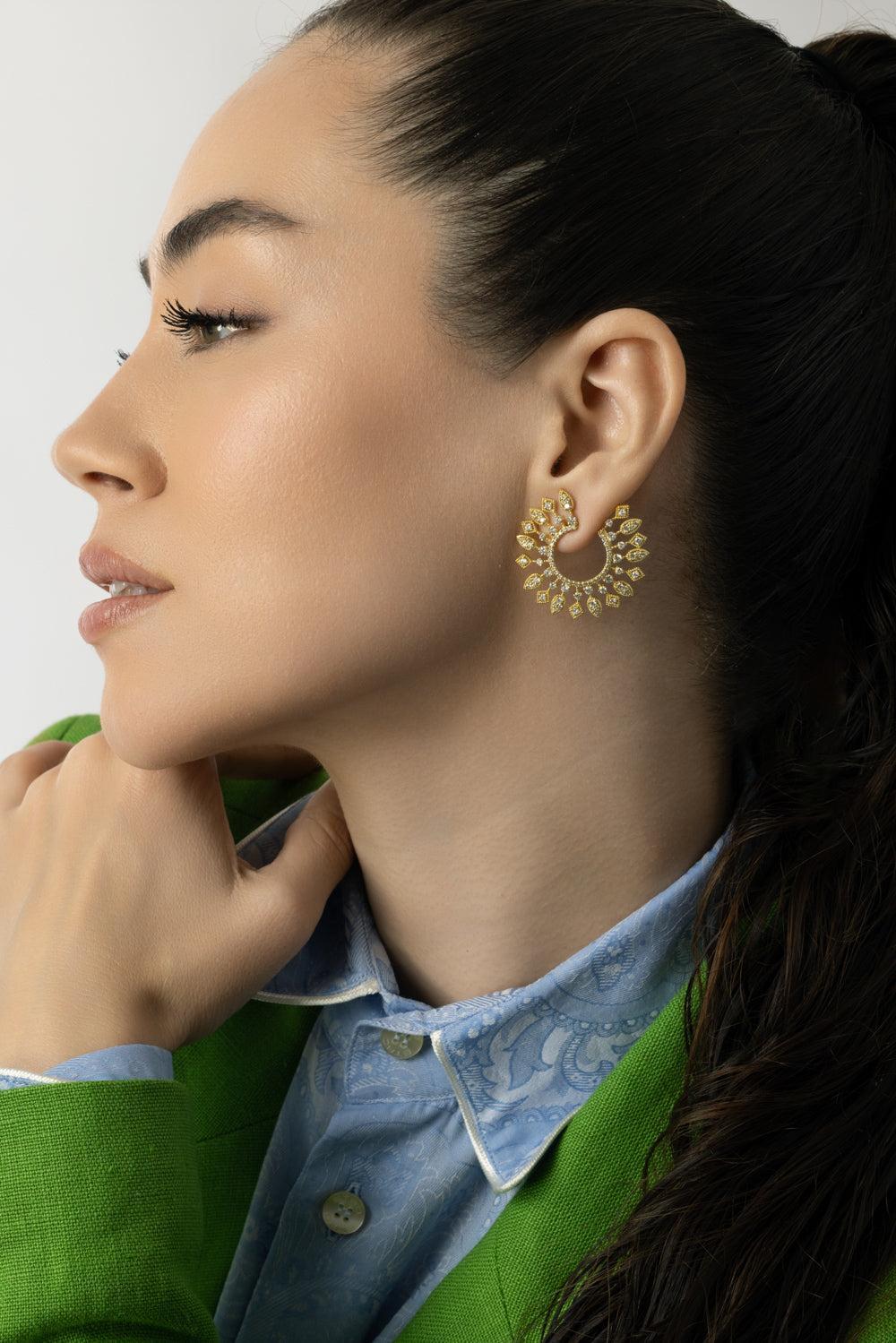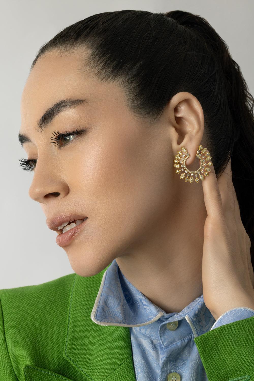Tanya Farah large sunburst celestial diamond bypass hoop earrings in yellow gold.