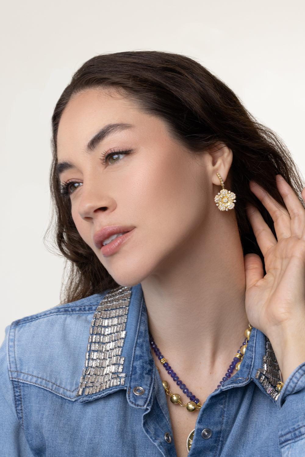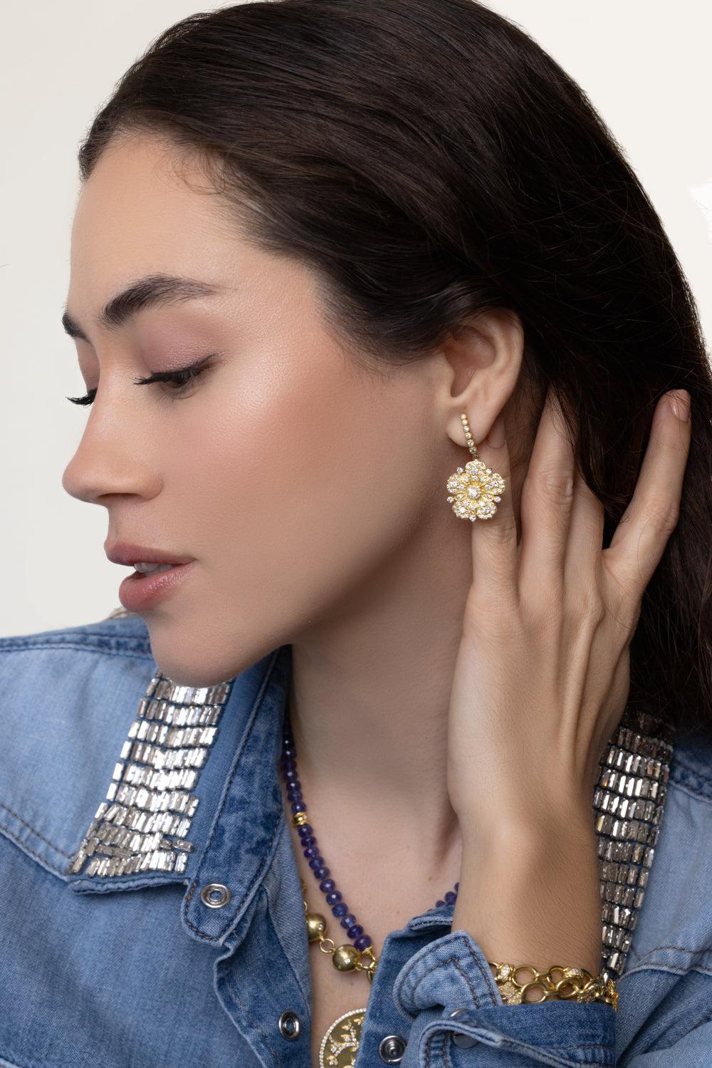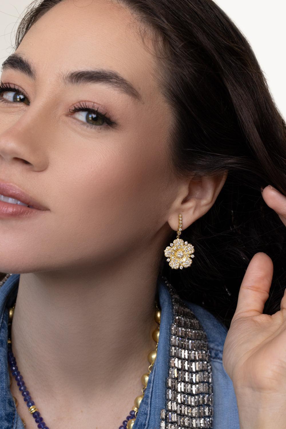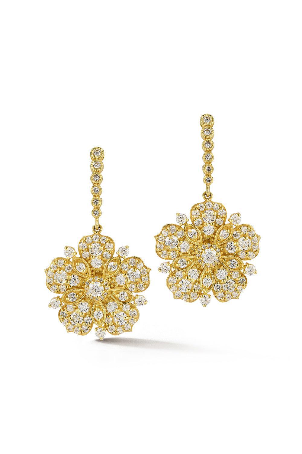 Tanya Farah medium jasmine bloom diamond flower earrings in yellow gold.