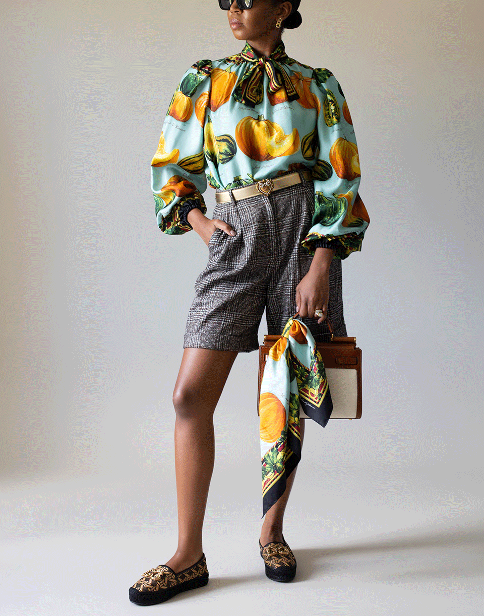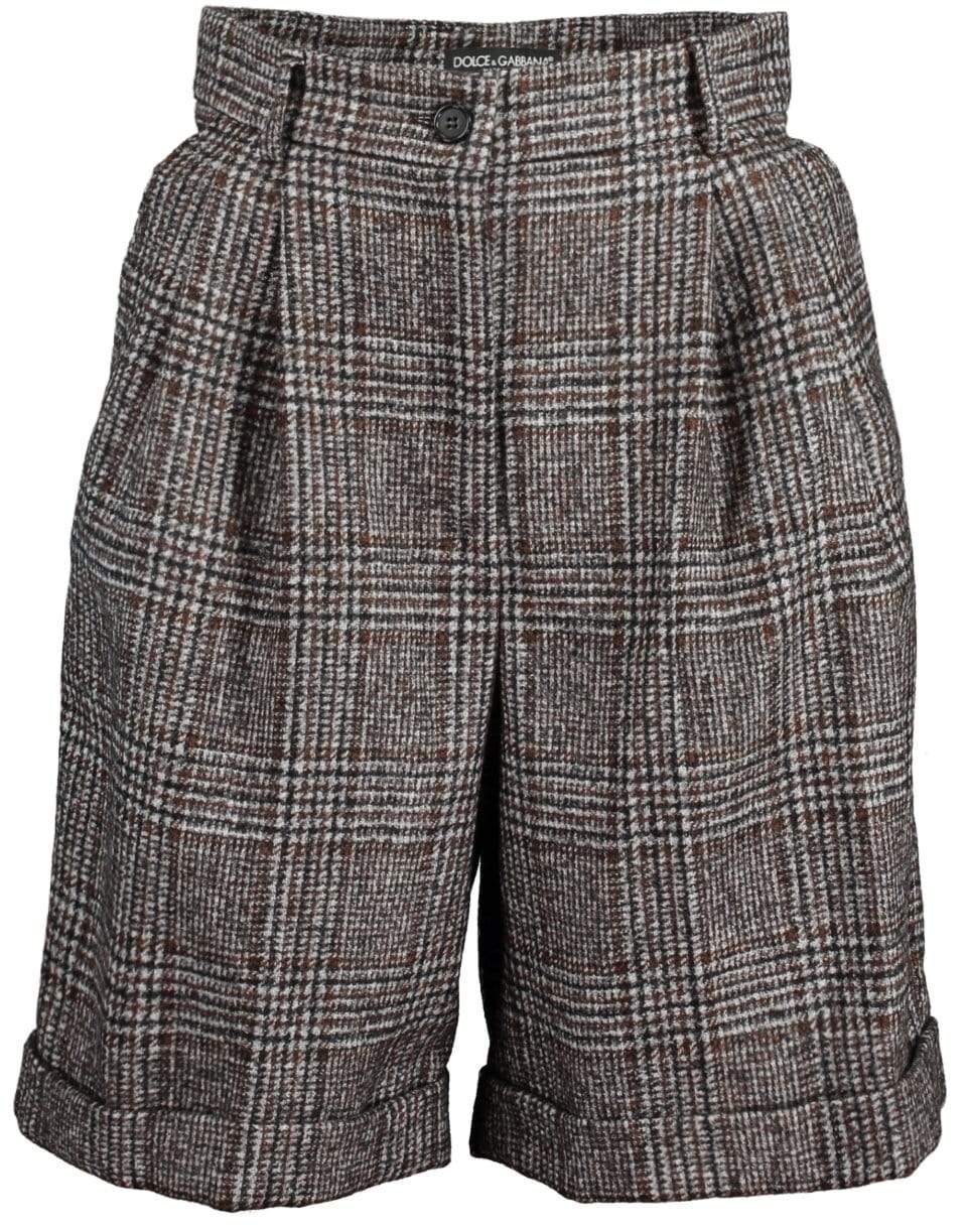 Dolce & Gabbana high waisted tartan pleated front shorts with a button closure, zip fly, side pockets, back buttoned welt pockets, cuffed hem, and a mid thigh length .