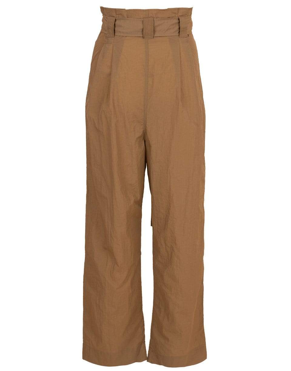 Ganni Tech Pant with a paperbag silhouette, high-rise waist, straight leg, removable D-ring belt, side pockets, and a concealed side zip closure.