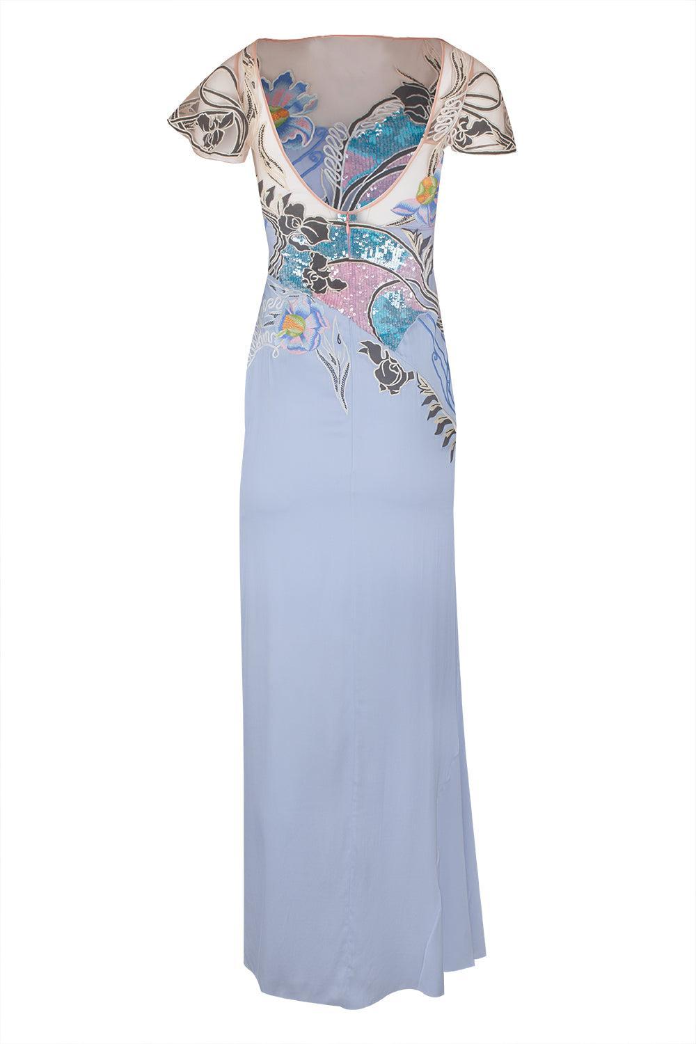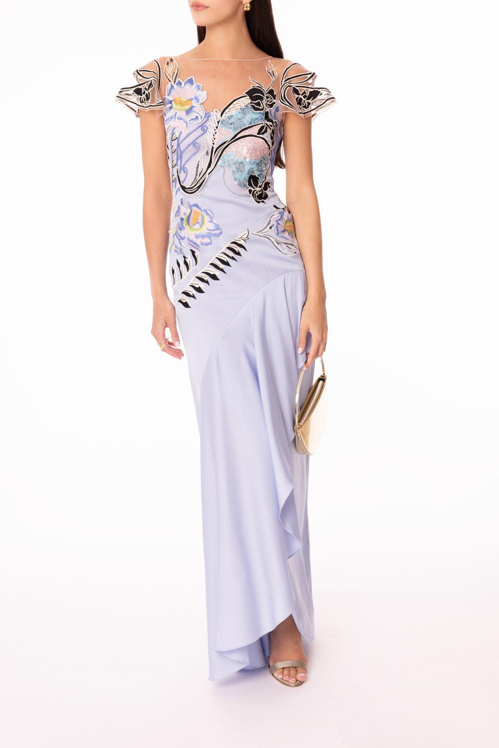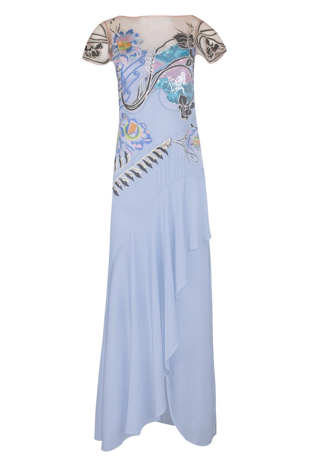 Centre Back Invisible Zip Fastening Short Sleeves Low Back Ruffled Skirt Detailing Full Length Lined