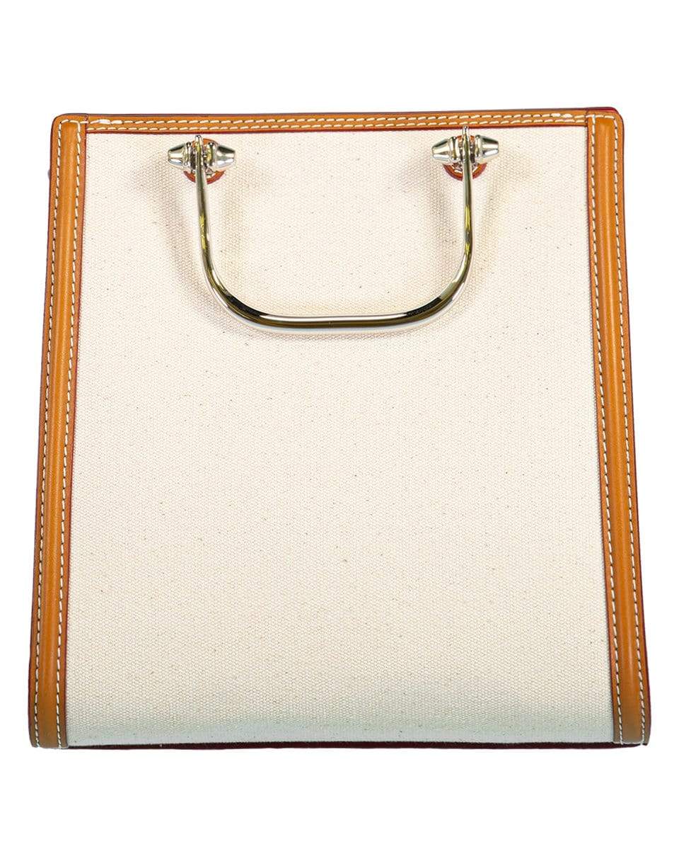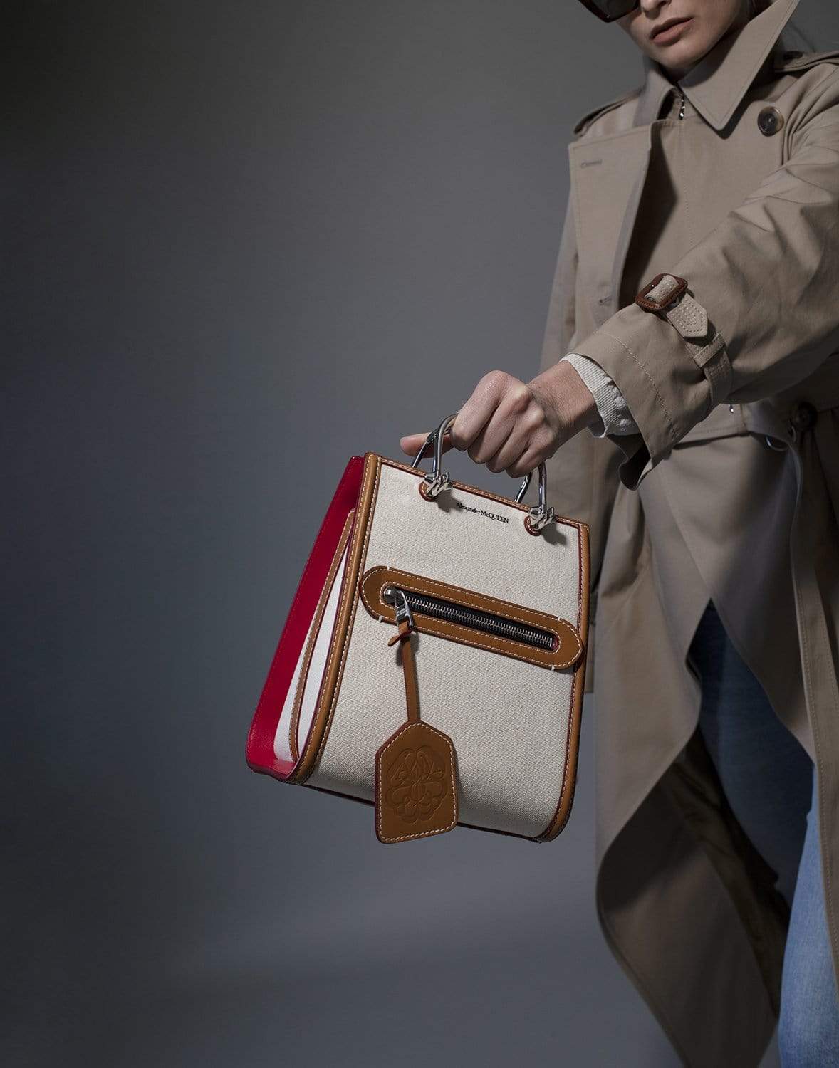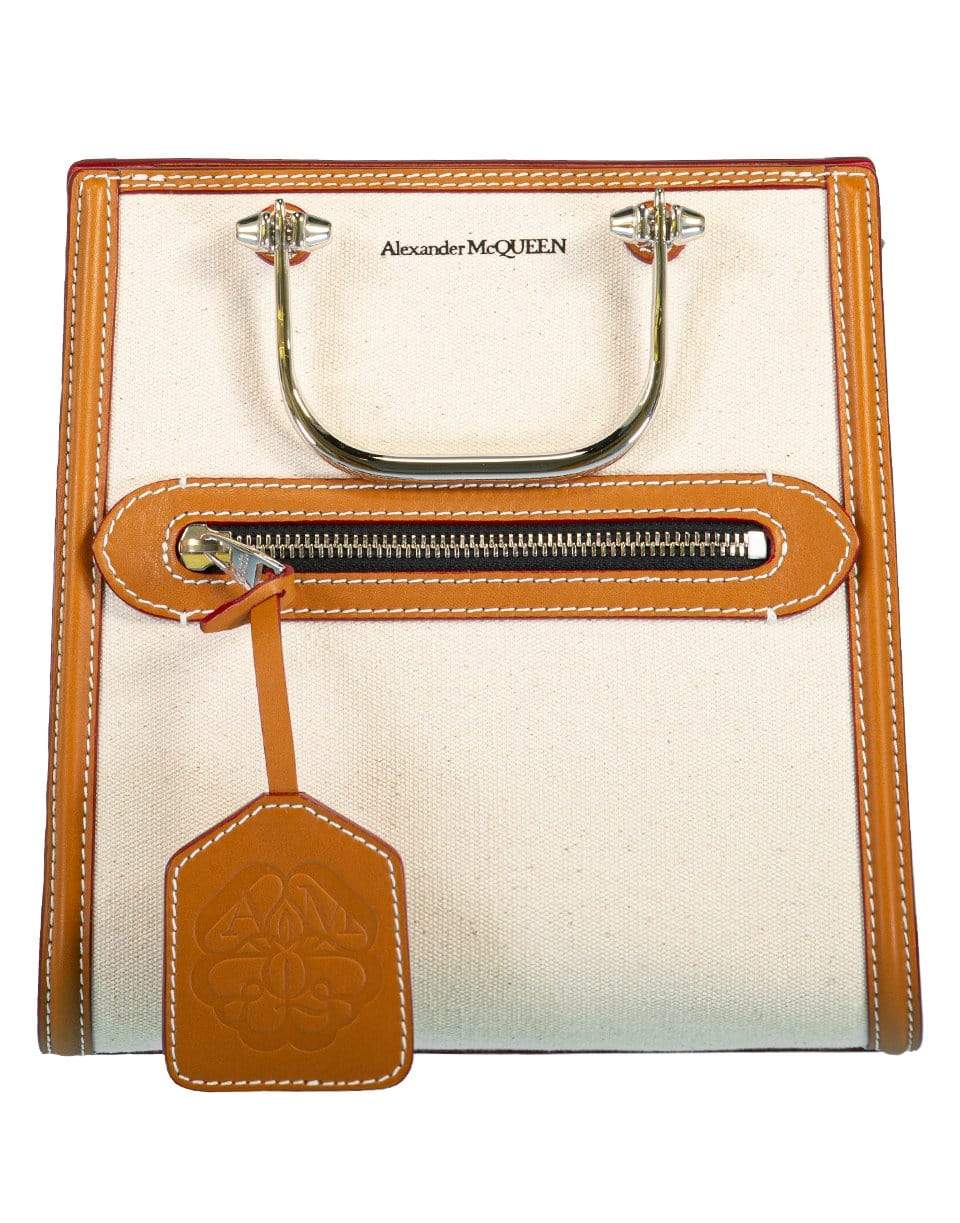 The Short Story by Alexander McQueen in natural canvas is detailed with contrasting with tan and welsh red leather trims and silver-finished metal handles adorned with two studs. The bag can be worn multiple ways: hand-held using the metal handles, worn over the shoulder or across the body using the leather strap. Leather tag embossed with the Alexander McQueen Seal signature.