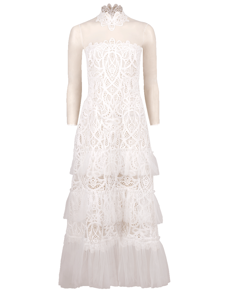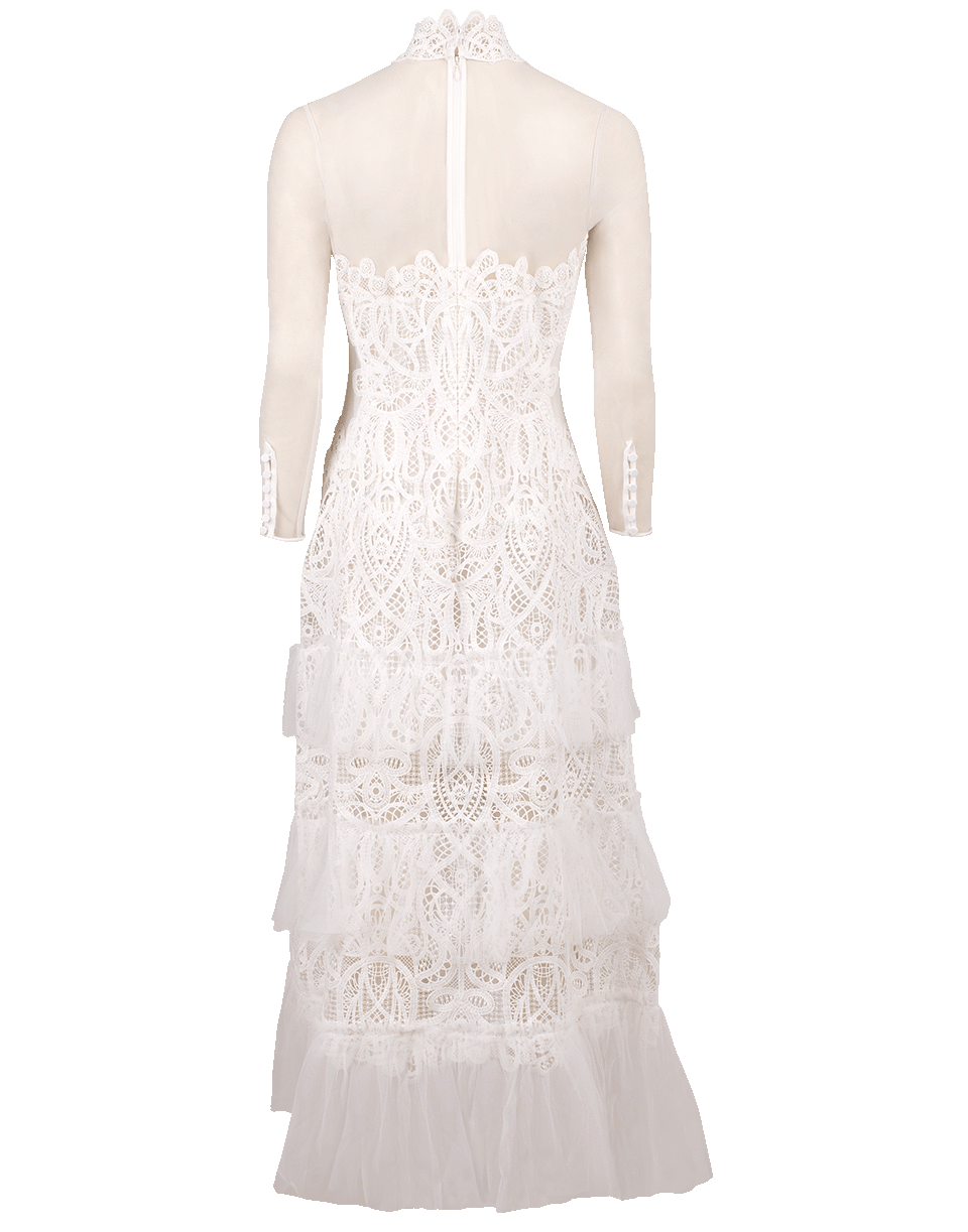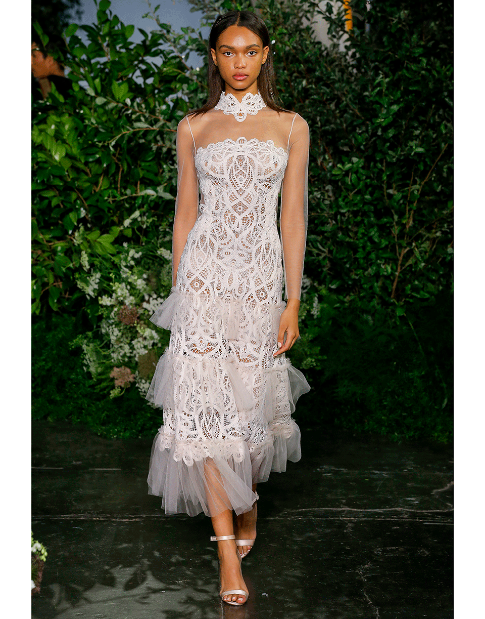 Threaded lace and tulle dress by Jonathan Simkhai. This lace ruffle dress features long sleeves, a high neck, a sheer yoke and sleeves, a ruffled tier overlay, and a zip closure along the back.