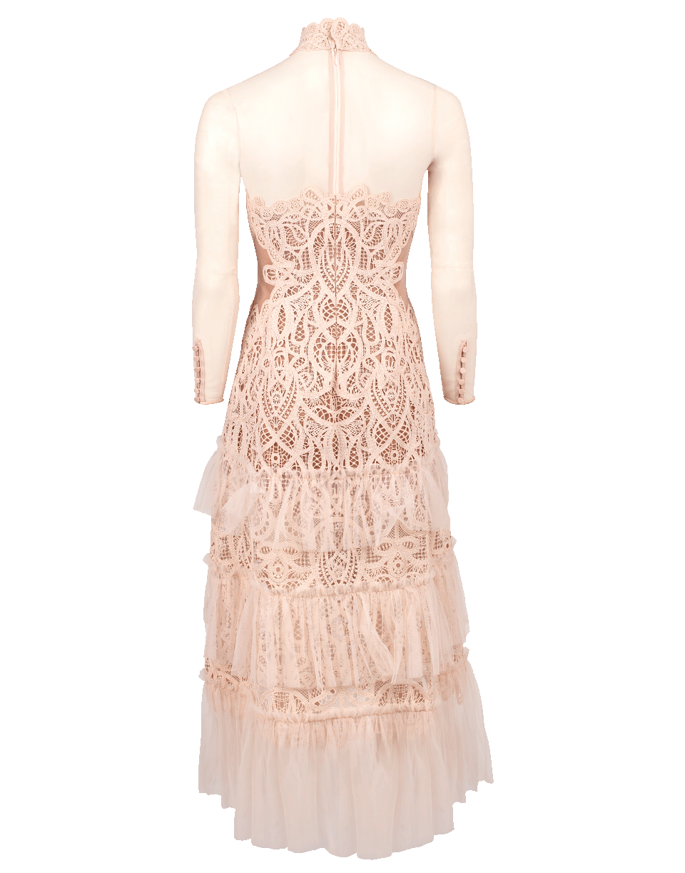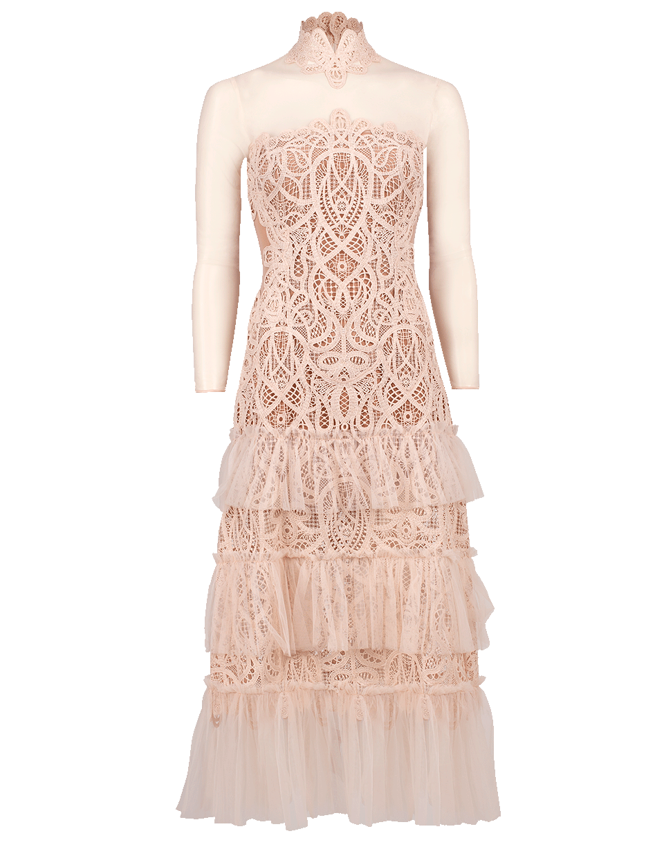 Threaded lace and tulle dress by Jonathan Simkhai. This lace ruffle dress features long sleeves, a high neck, a sheer yoke and sleeves, a ruffled tier overlay, and a zip closure along the back.