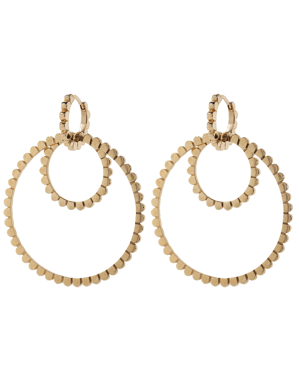 Three linked 18k rose gold daisy hoop earrings with removable drops and huggie closures. For pierced ears.