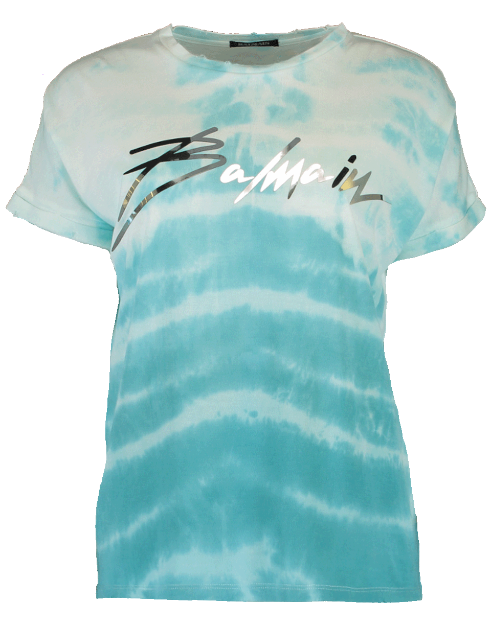 This Balmain tie dye logo t-shirt features a crew neckline, short sleeves, relaxed fit and a blue tie dye effect with a graphic logo print across the front.