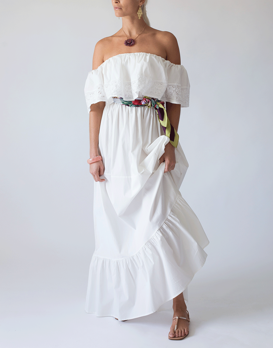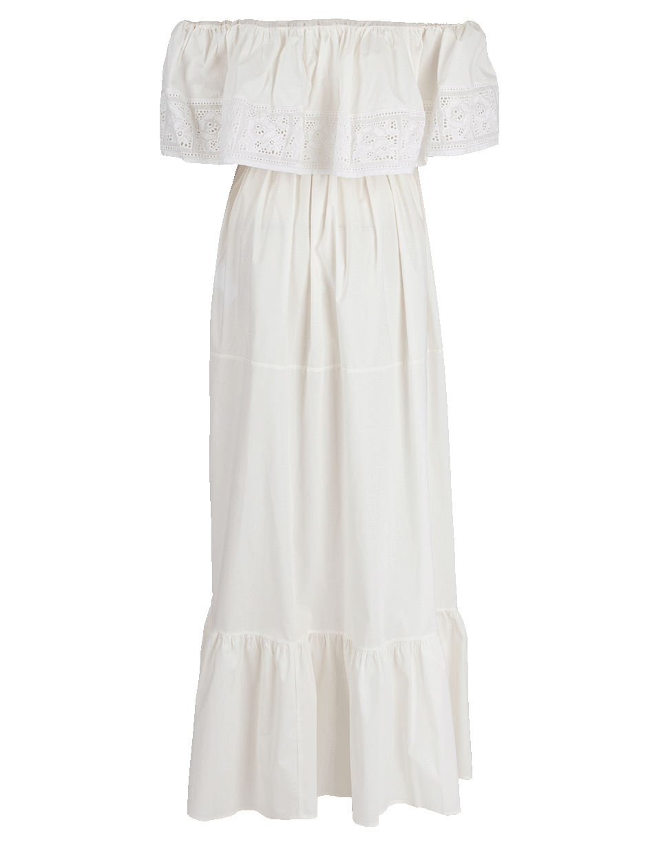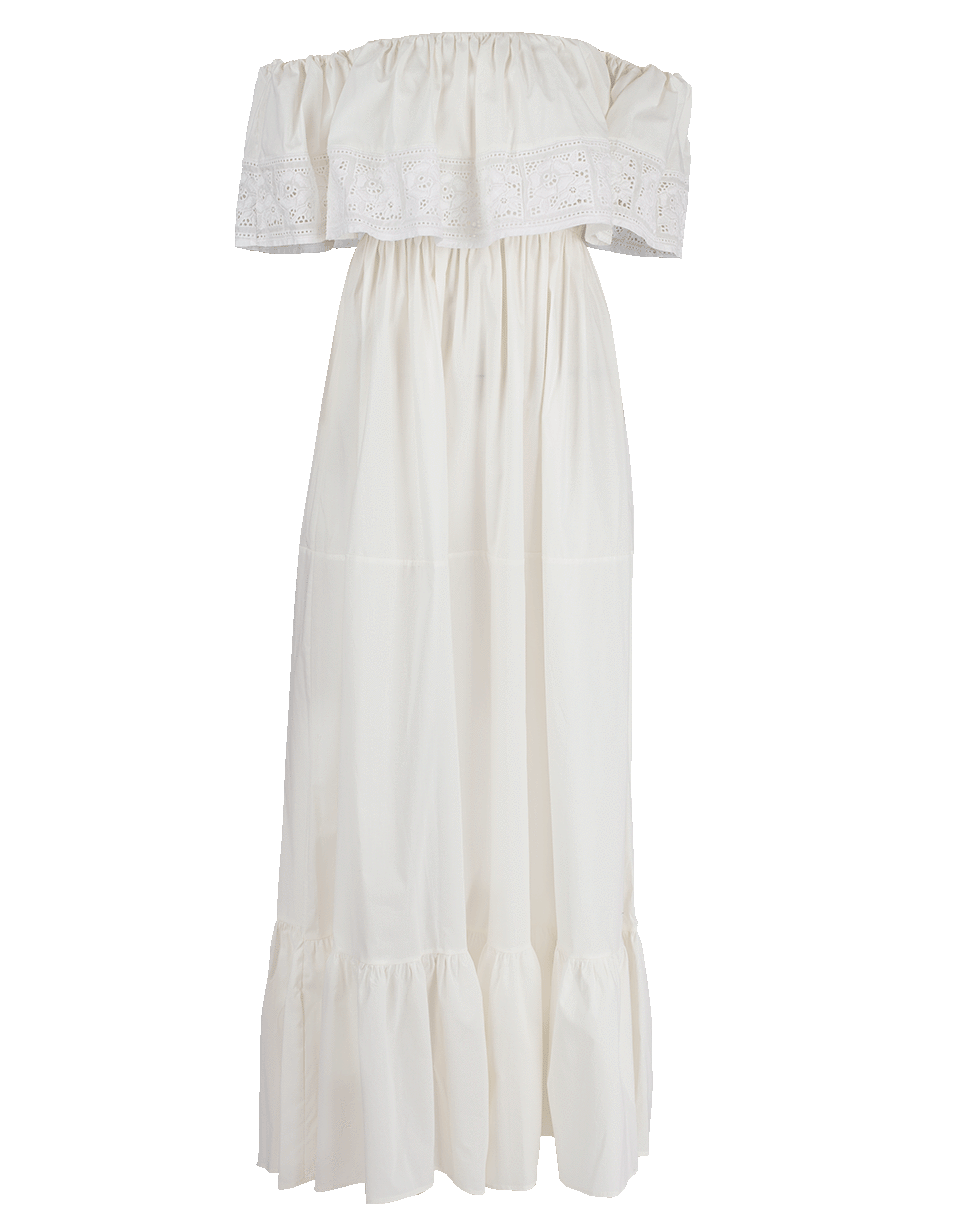 Off shoulder maxi dress by Blugirl. This maxi dress features an elastic off-shoulder ruffled neckline with tiered detail and relaxed fit.