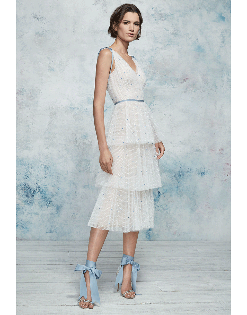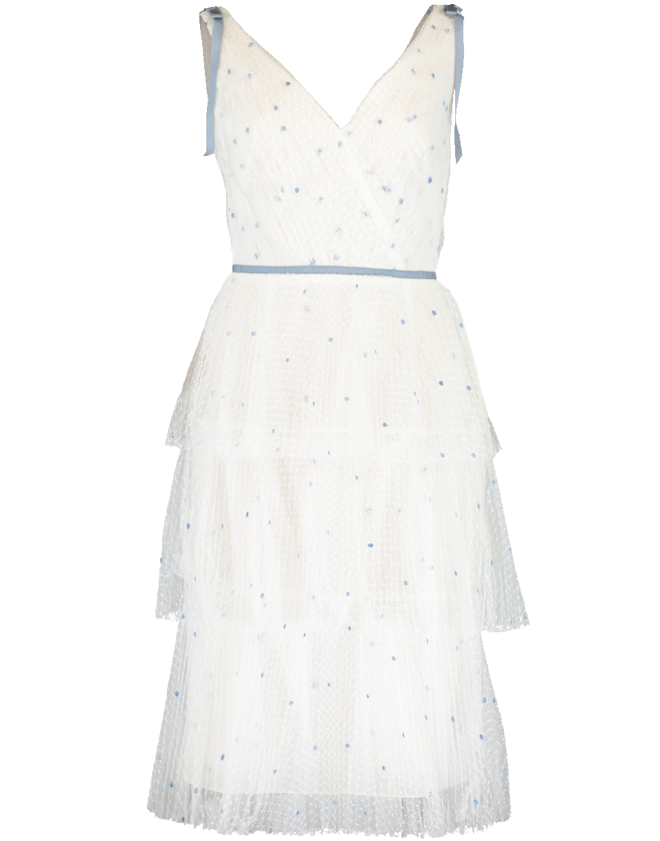 Ivory white midi cocktail dress from Marchesa Notte has a layered three tiered skirt with discreet blue-tone polka dots. This dress showcases a v-neckline, sleeveless design with a fitted waist and blue accent belt.