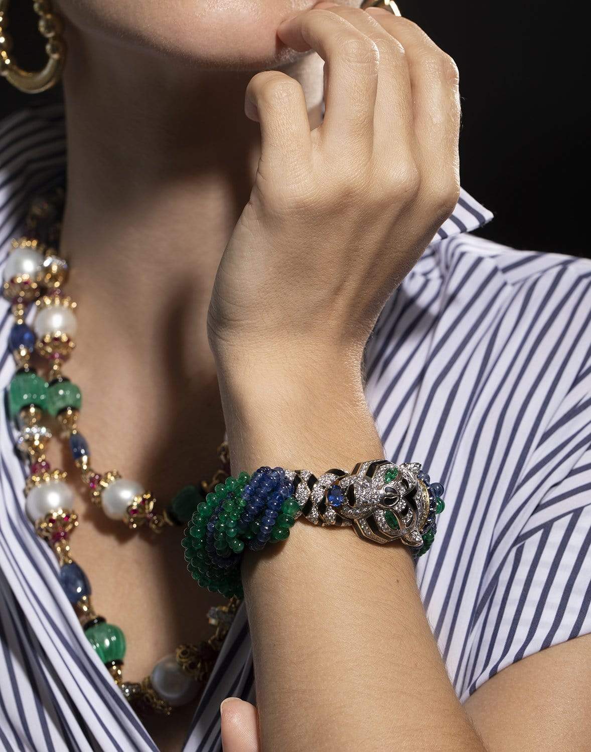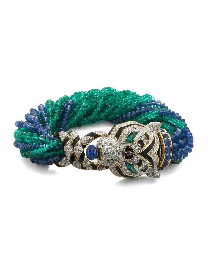 David Webb tiger bracelet. Faceted sapphires and emeralds, sapphire and emerald beads, black enamel, 18K gold, and platinum.