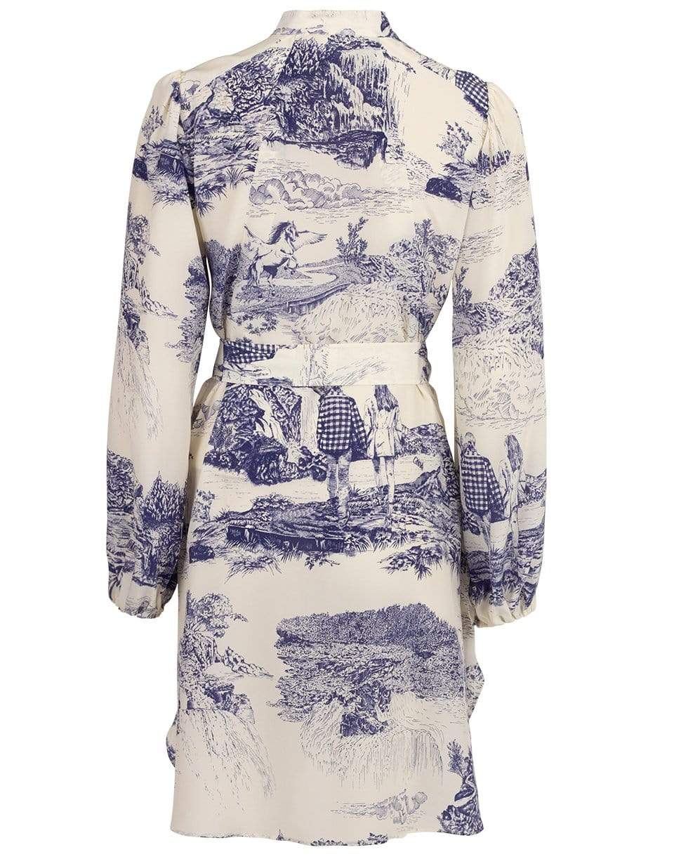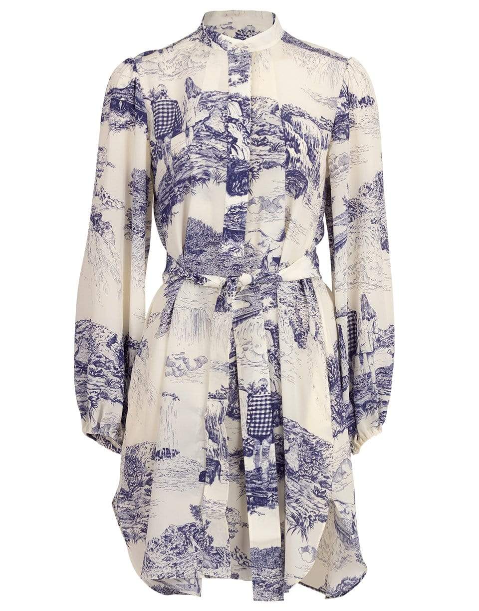 A-line Toile de Jouy printed dress from Chloe featuring long sleeves, high collar, waist belt, concealed button placket, slip hem, side pockets, and a knee length.