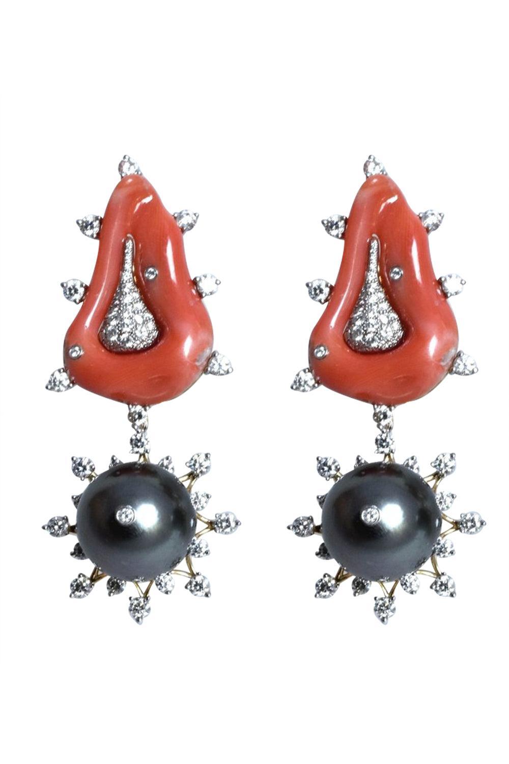 Tony Duquette coral diamond pearl earrings in yellow gold.