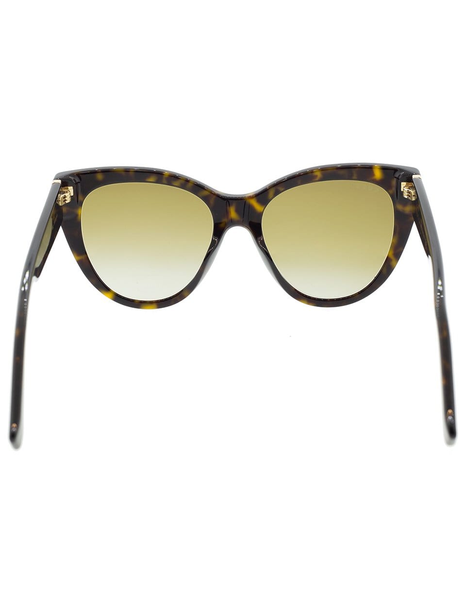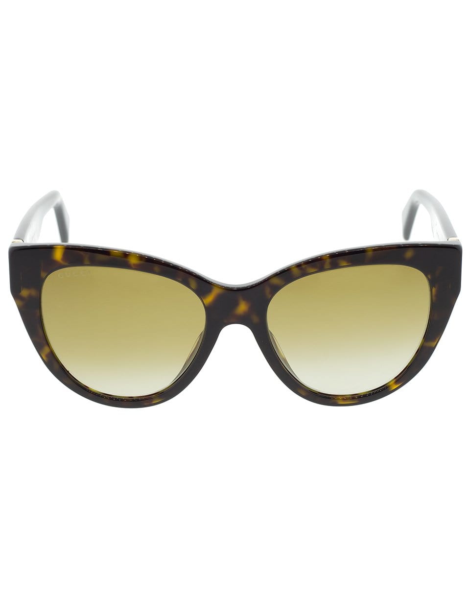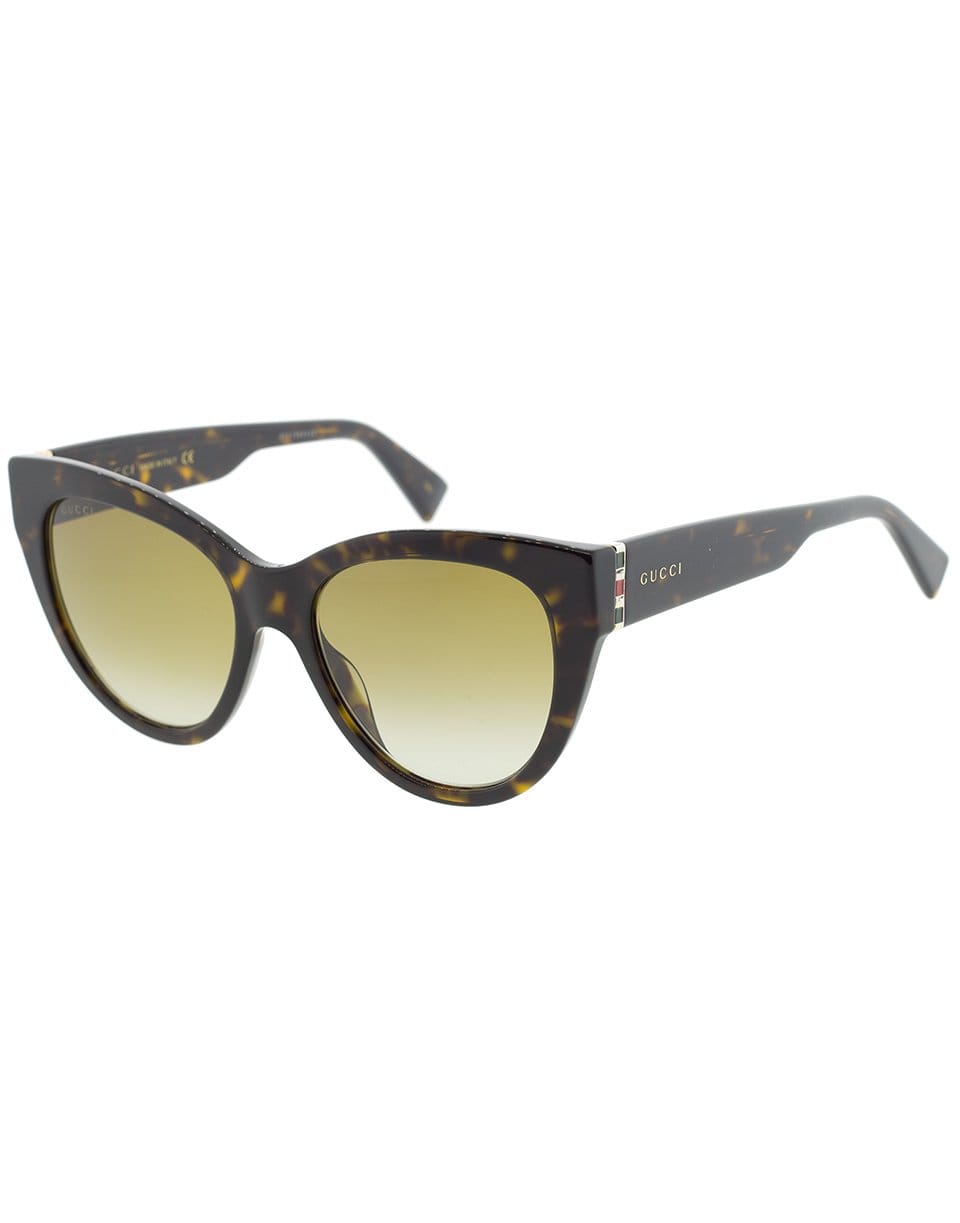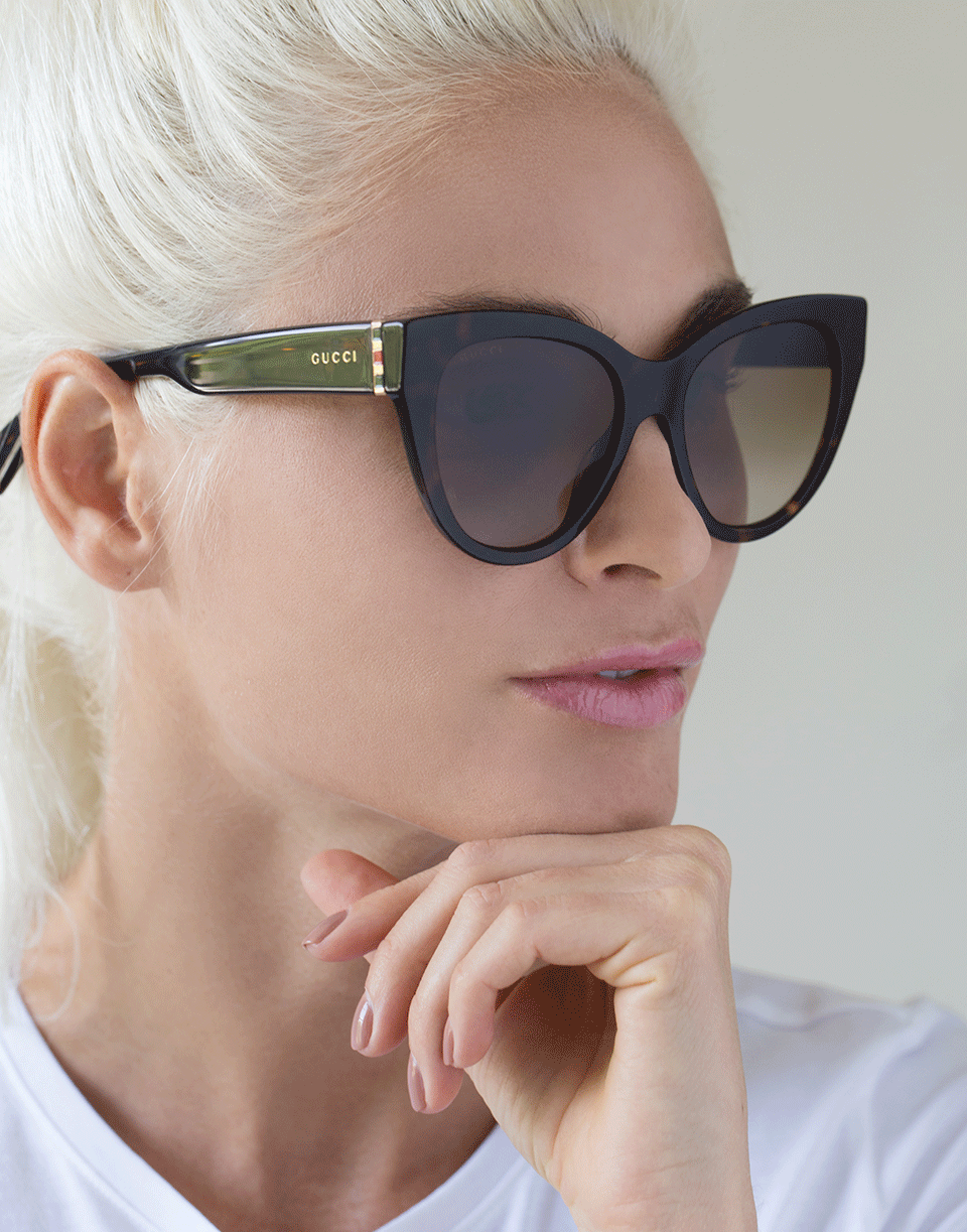 Gucci tortoise cat-eye sunglasses with an acetate frame and grey gradient lenses.