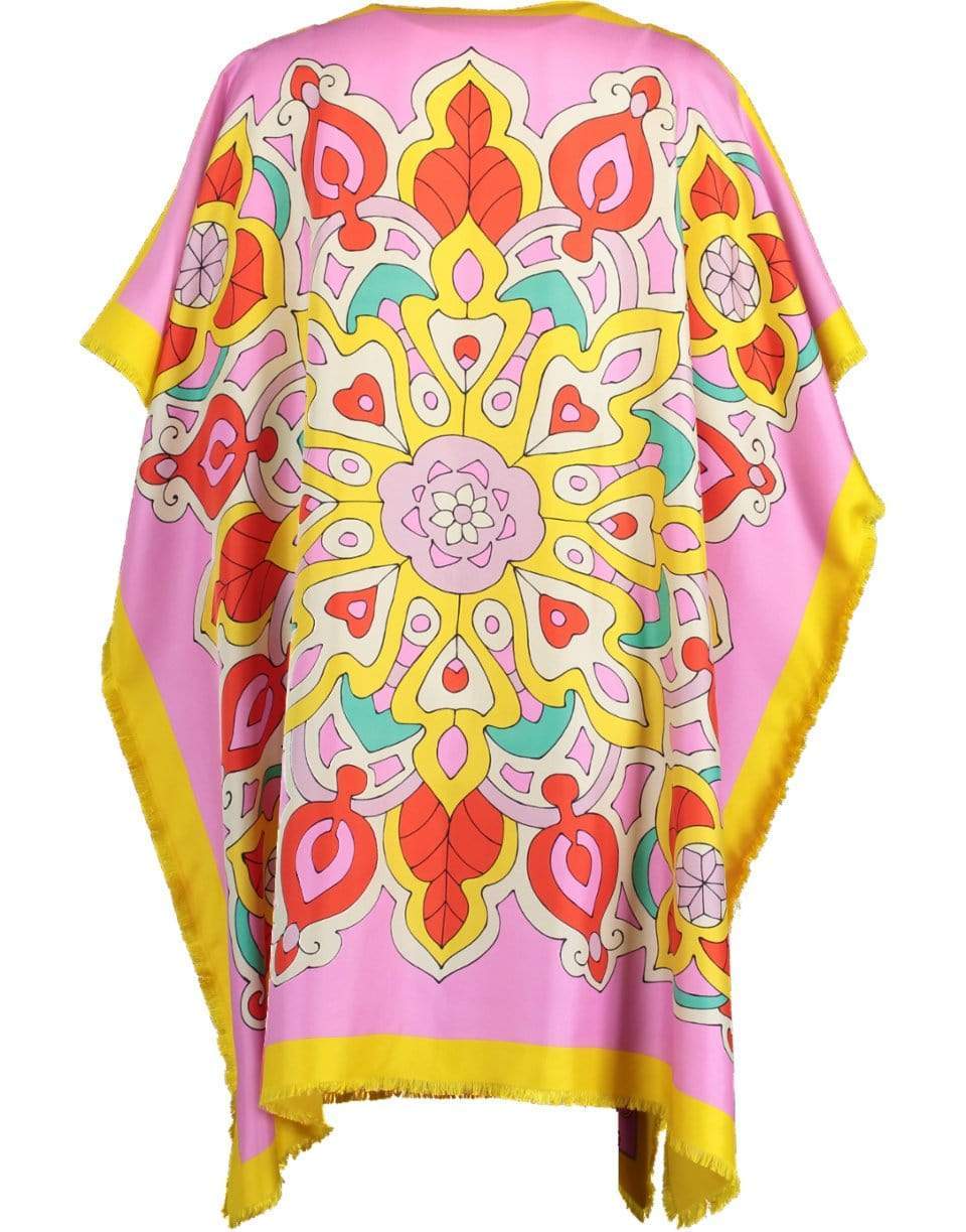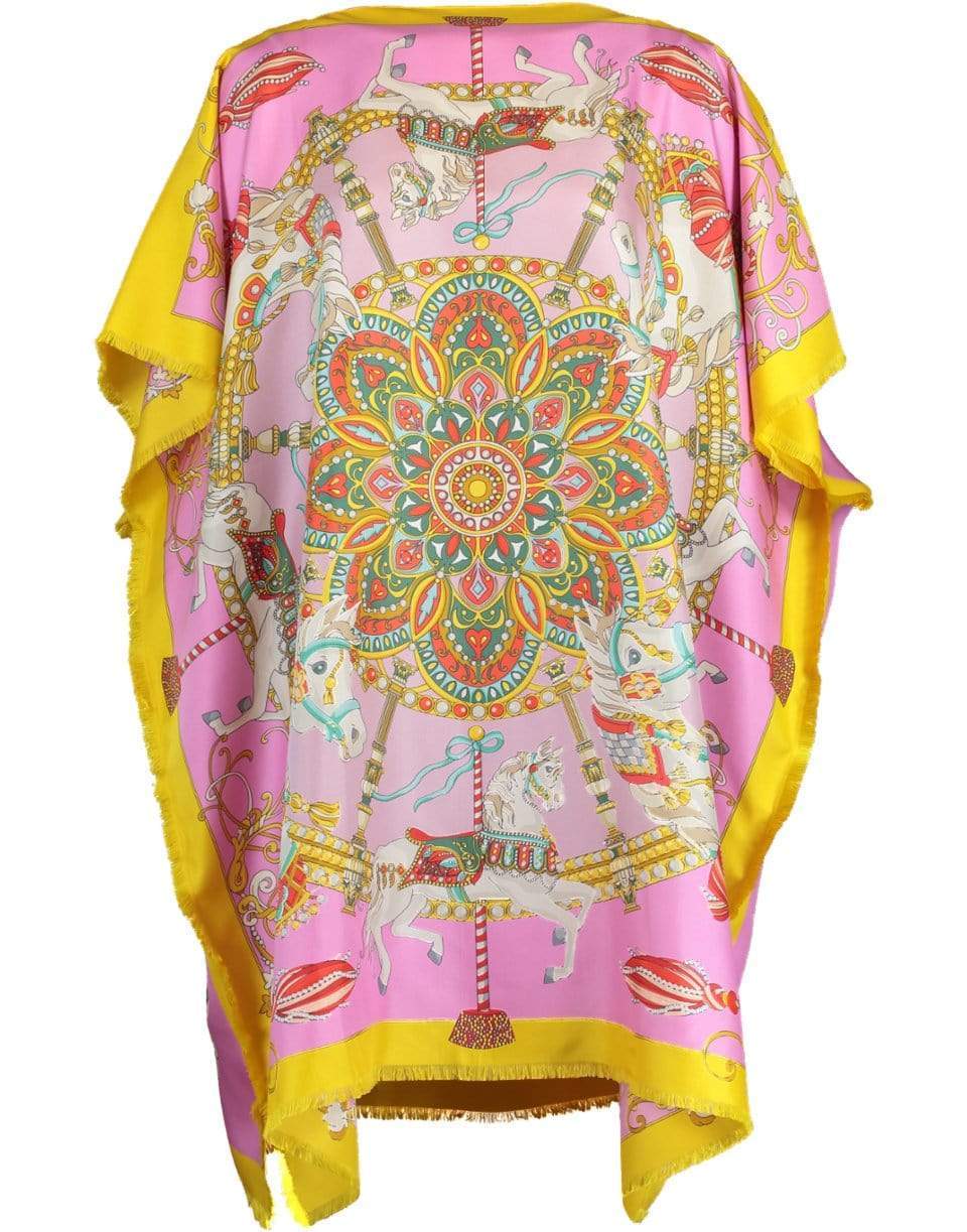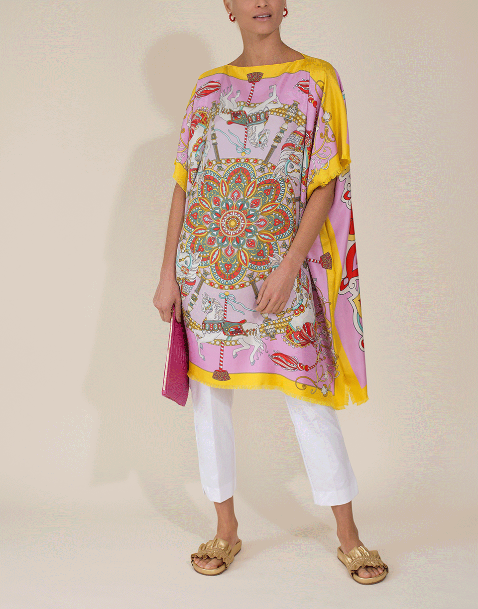 Rani Arabella toy horses printed silk dress with a relaxed fit, boatneck, draped sleeves, frayed trim, and a short length.