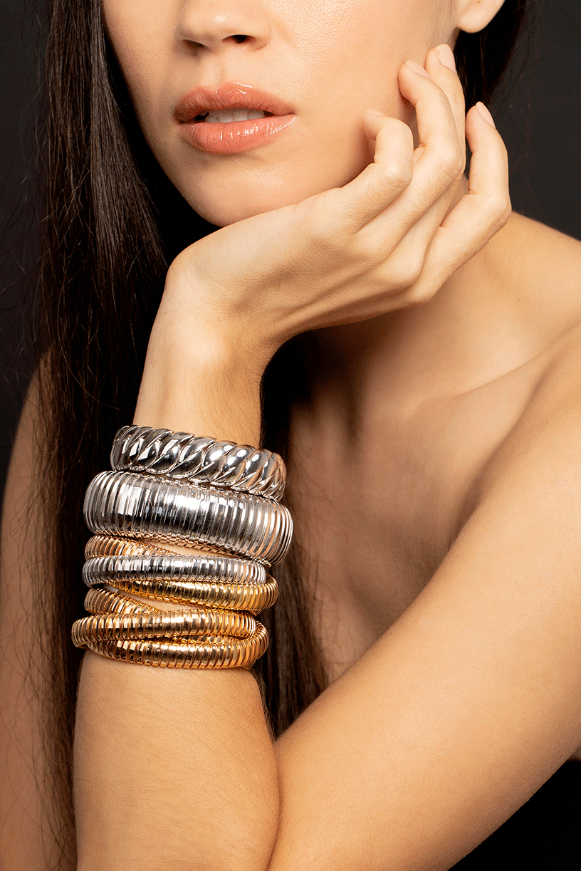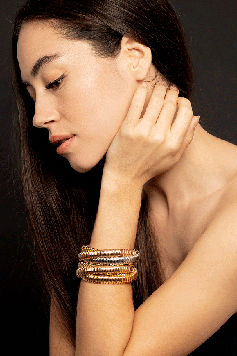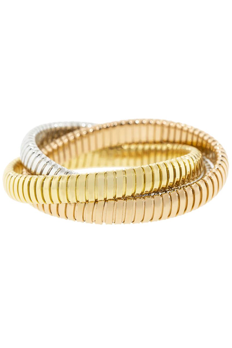 Sidney Garber rolling band bracelet with tri-color golds with an easy pull on fit.