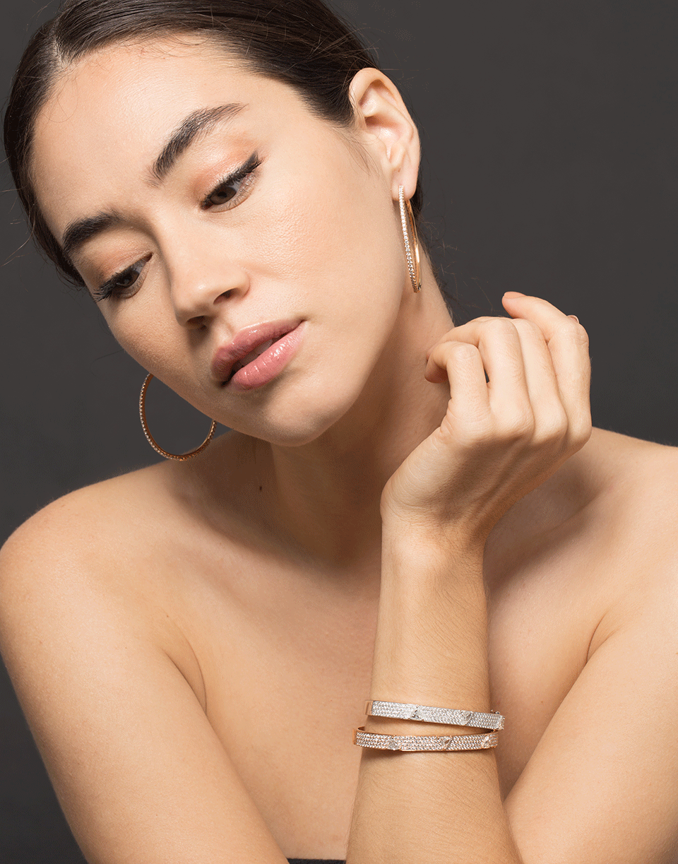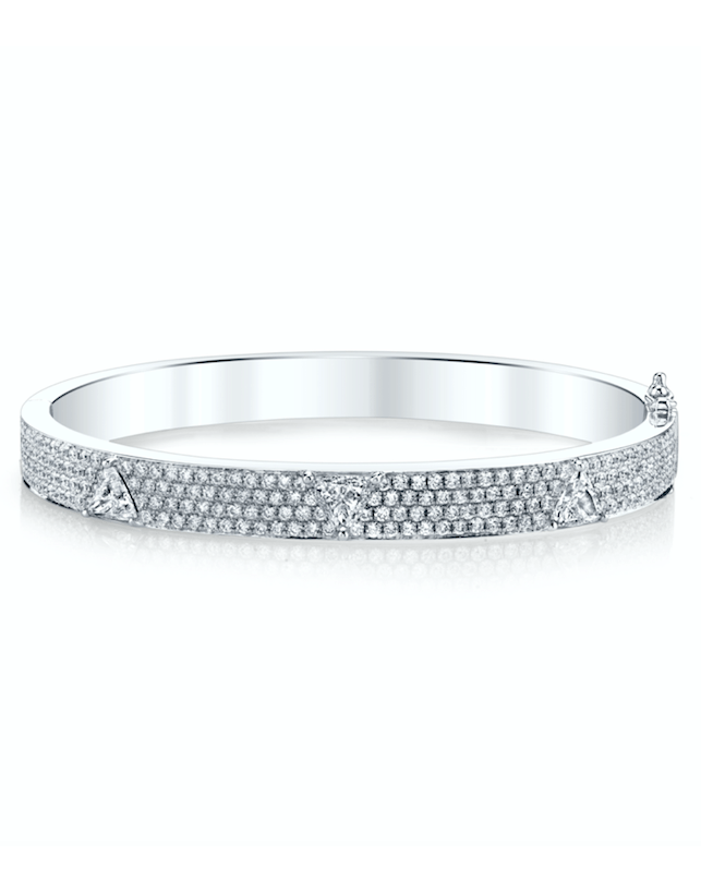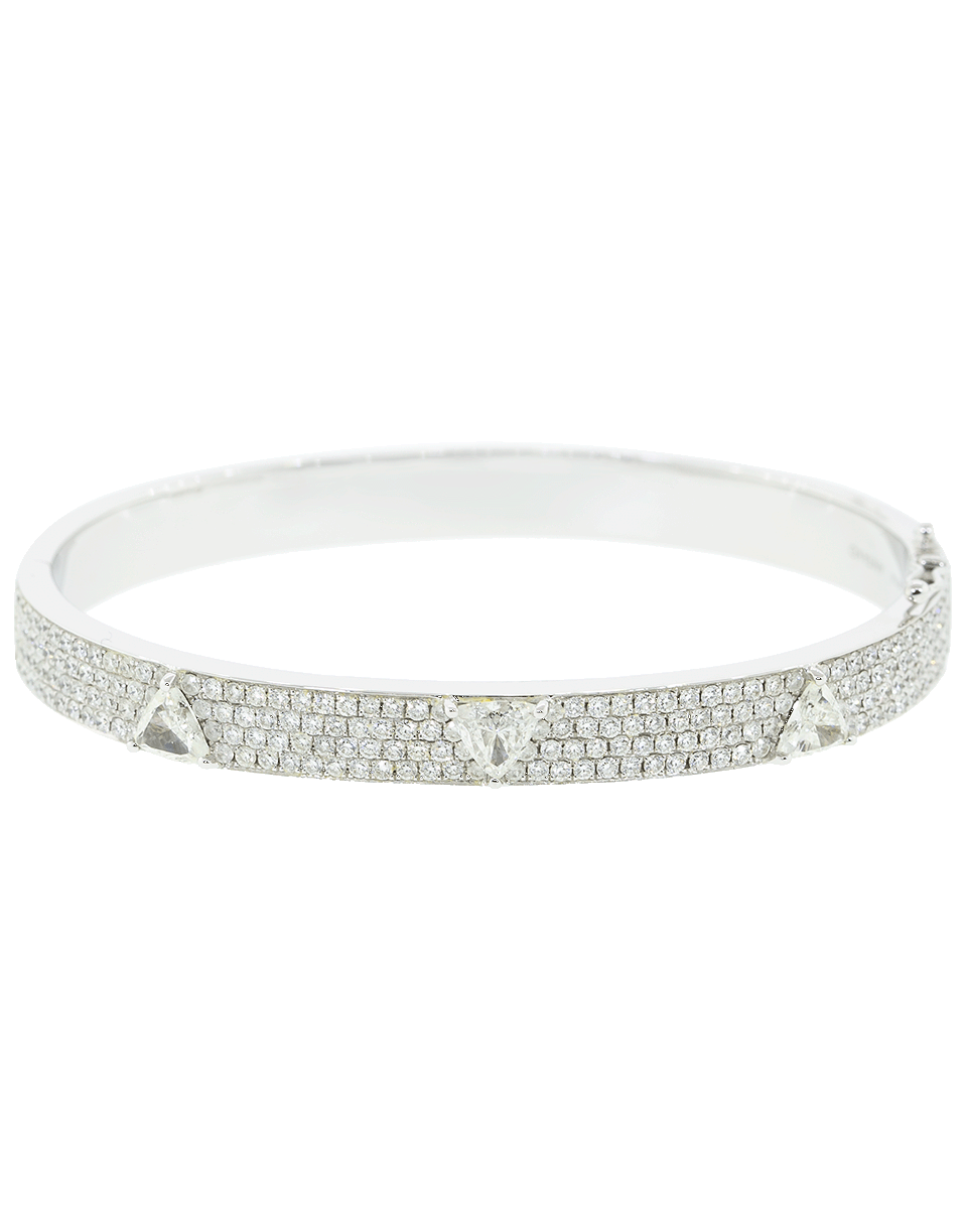 White gold diamond pave bracelet featuring three trillion cut diamonds along the edge. Hinged closure for a secure fit. Worn beautifuly with your favorite evening look.