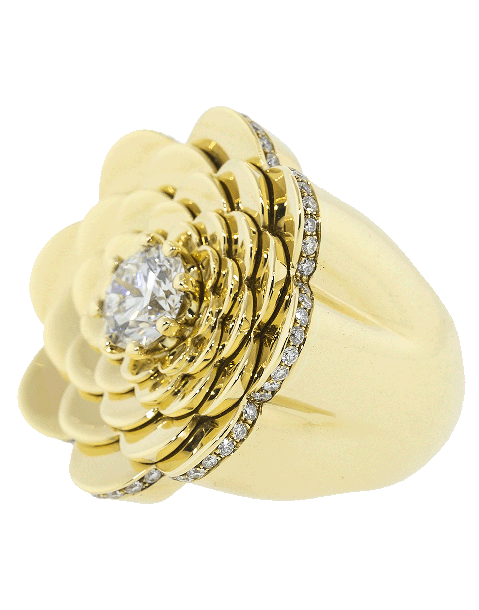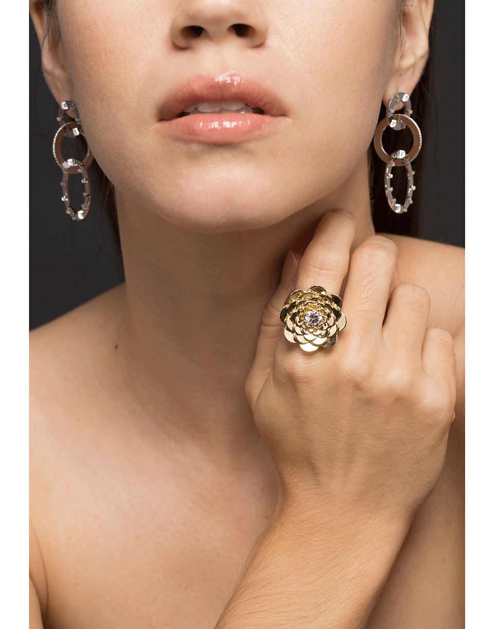 Cadar’s Bloom Collection features a series of intricately crafted floral jewels, like this trio cocktail ring. Handcrafted with polished 18k gold, the curved petals mimic a blooming flower and the diamond encrusted edges resemble droplets of water reflecting from the sun.