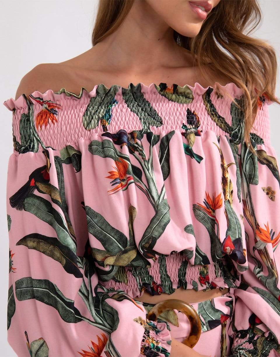 Tropical print off-the-shoulder top from PatBo featuring a regular fit, long sleeves, and elasticated detail along trims.
