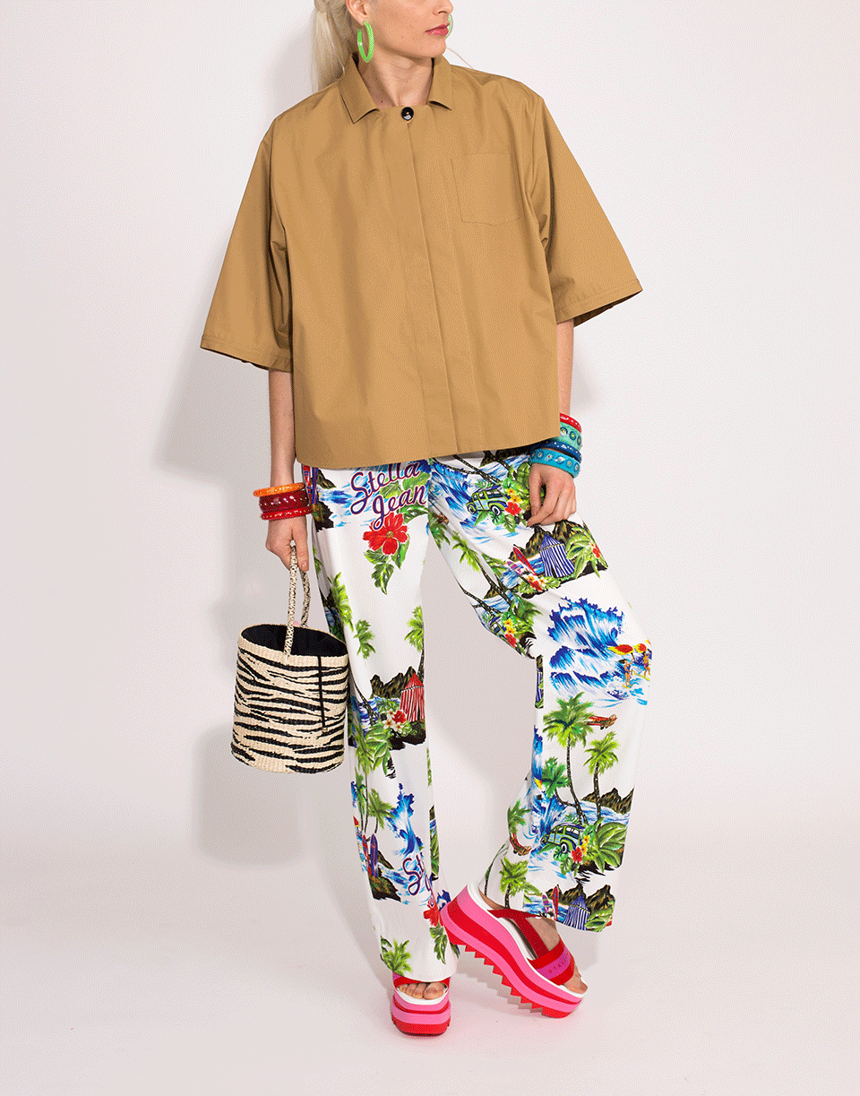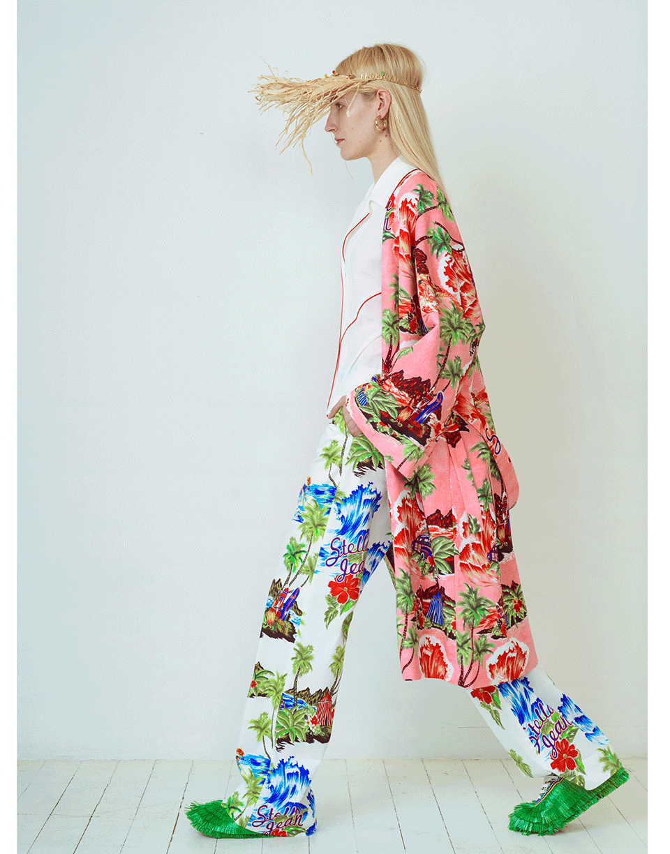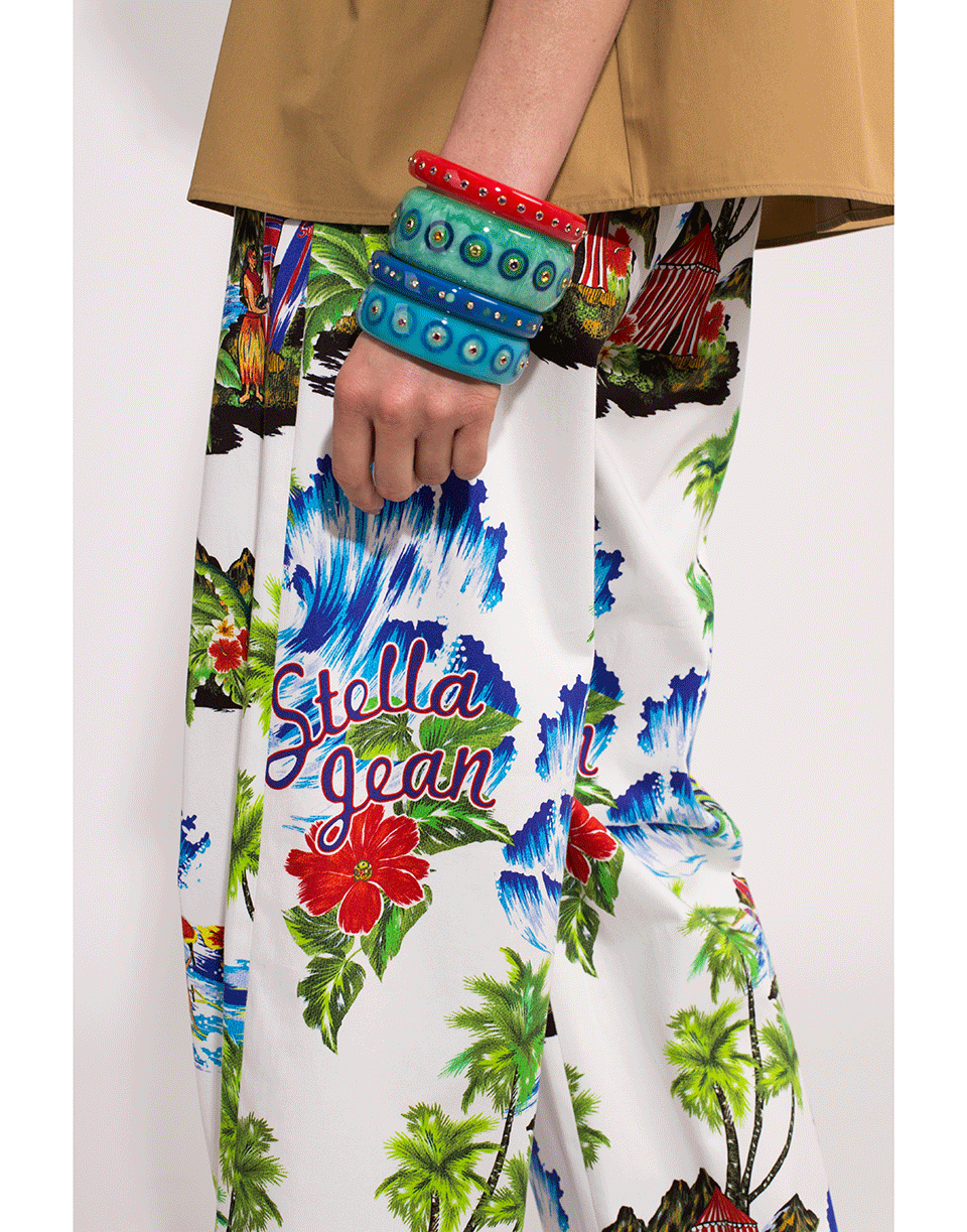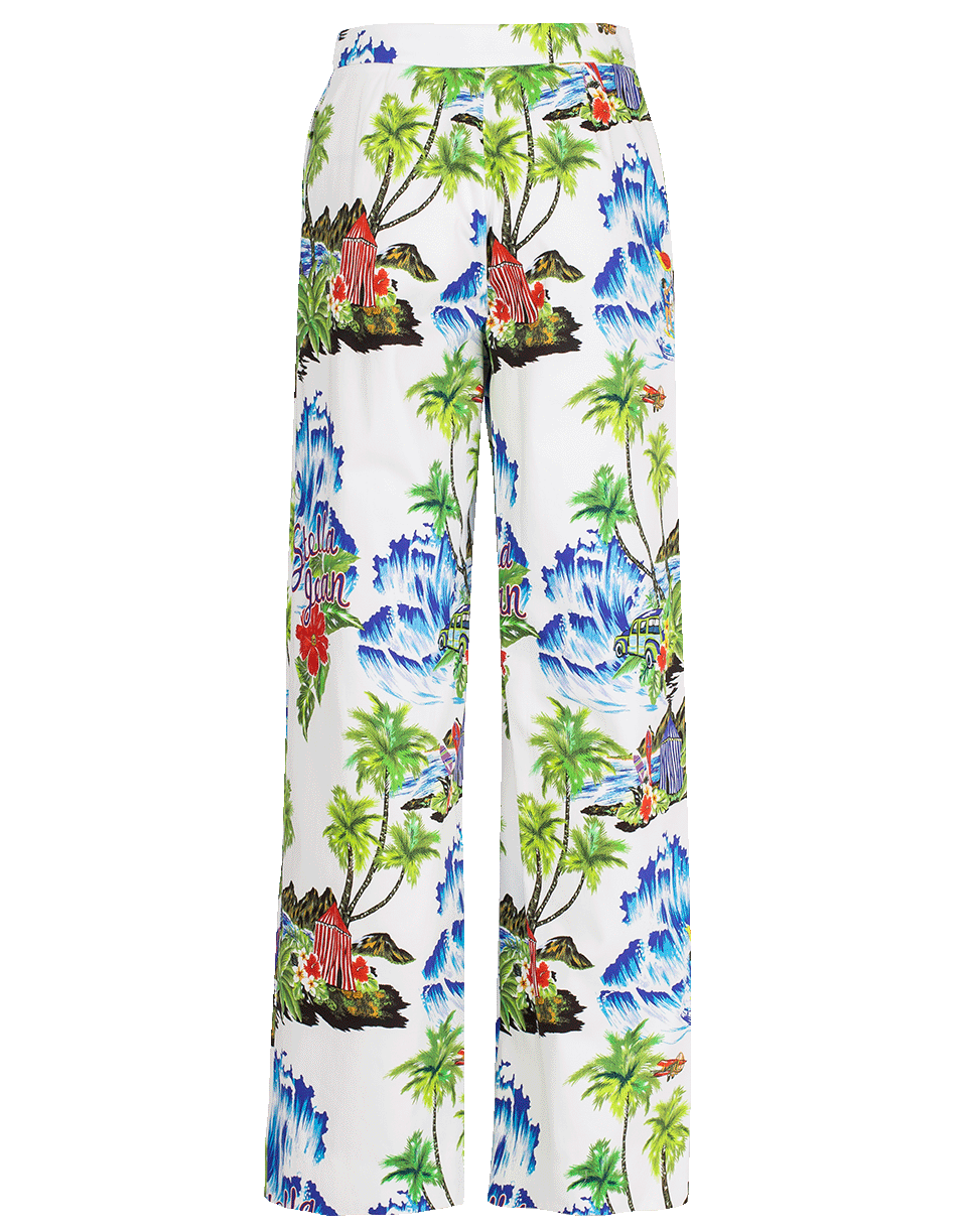 Tropical print wide leg pant by Stella Jean. These flowy full-length midrise trousers will have you feeling like you’re on the beach in Hawaii. They feature a picturesque tropical print with a tab closure, front zipper and loose fit.