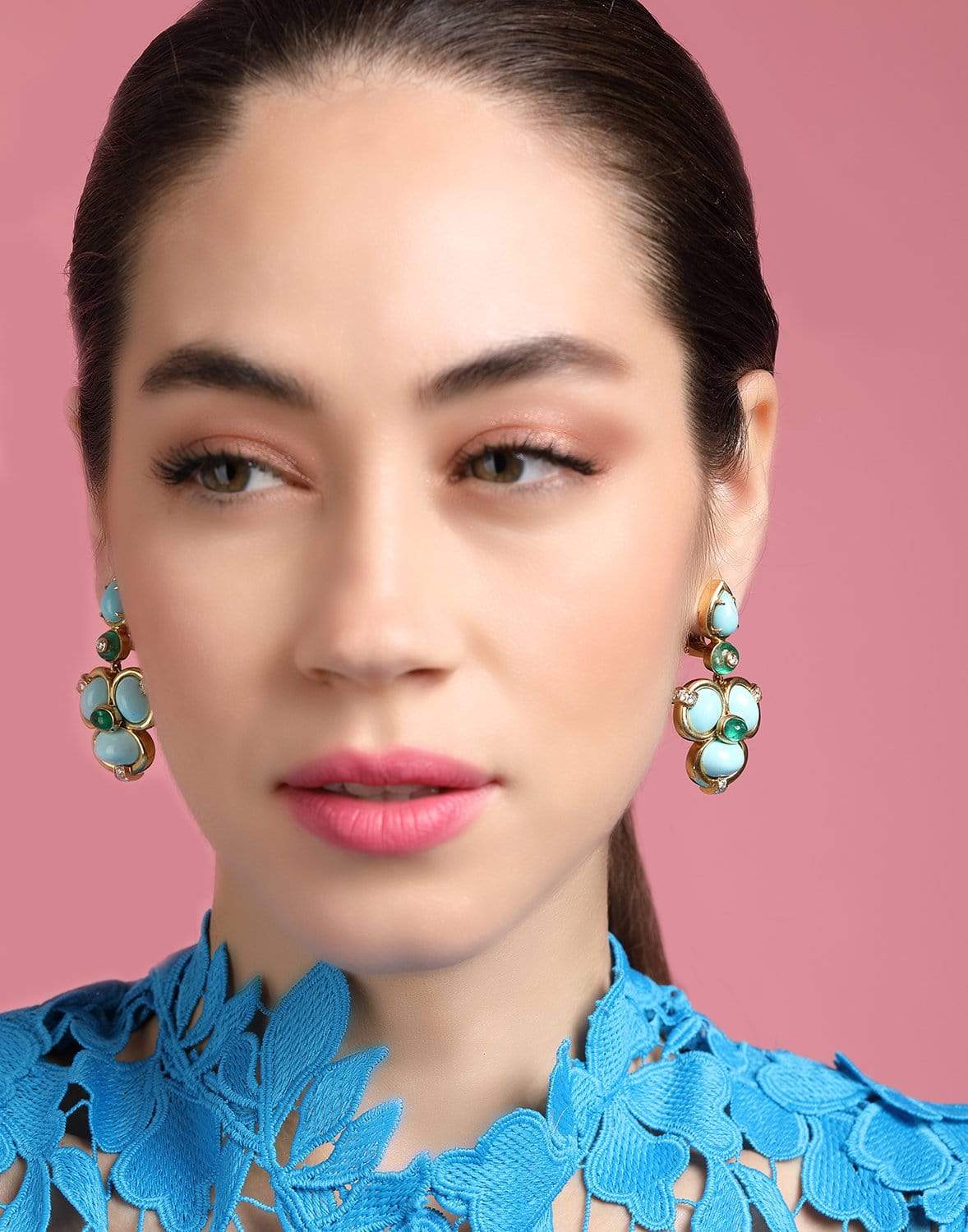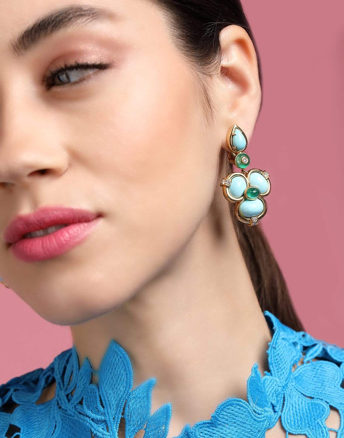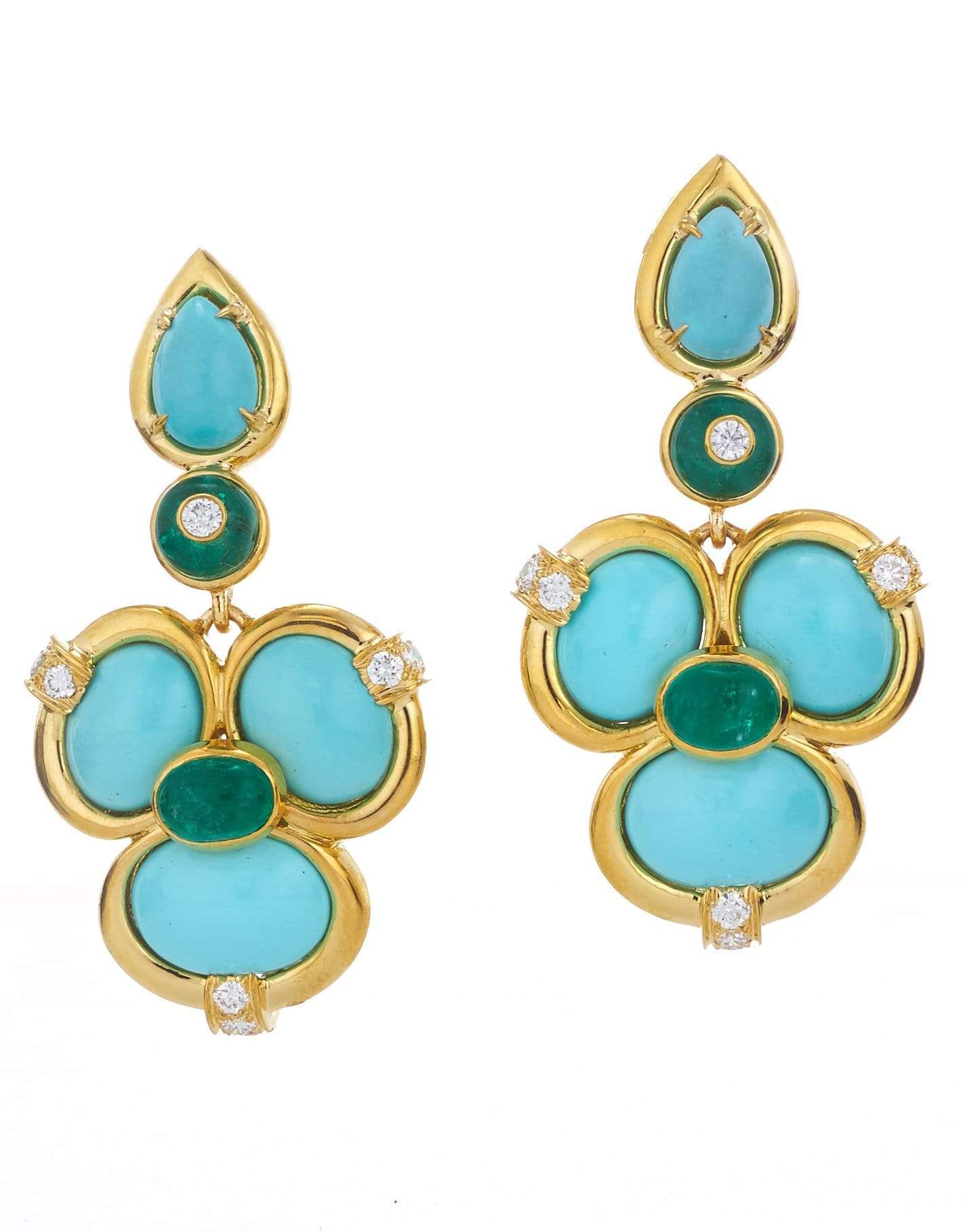 David Webb Shangri-La earrings. Cabochon turquoise and emeralds with brilliant-cut diamonds.
