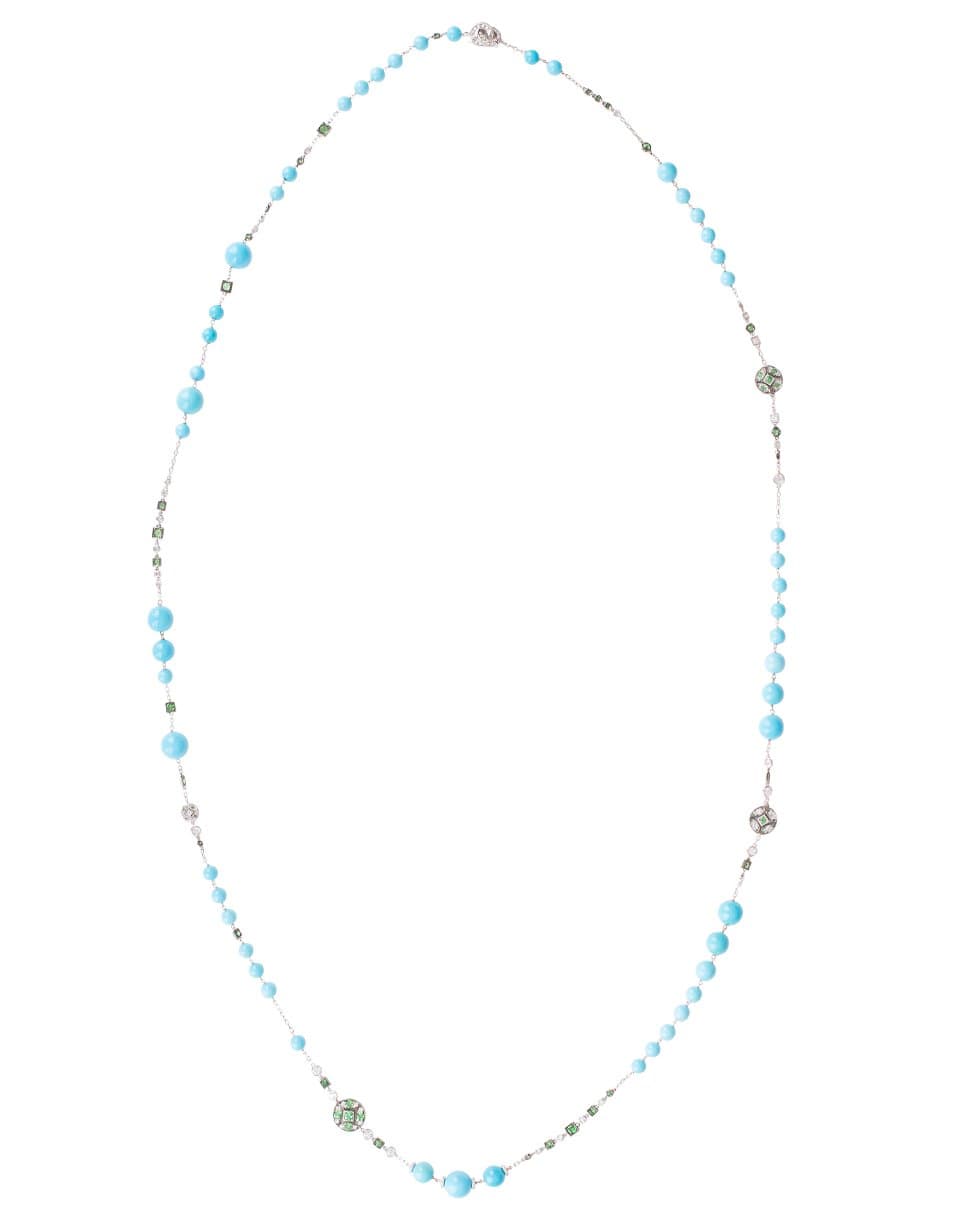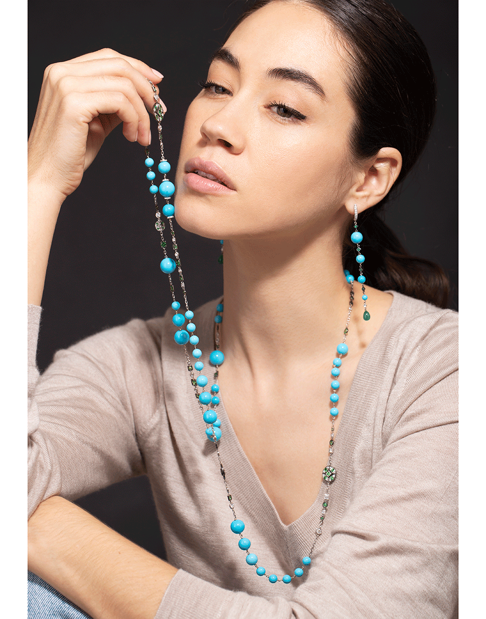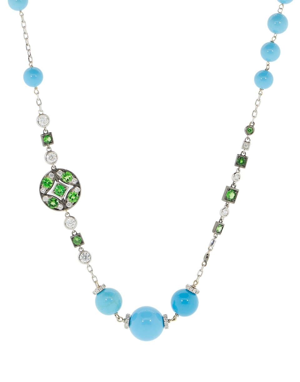 Turchese Collection necklace with turquoise, tsavorite, and diamonds set in 18k white gold.