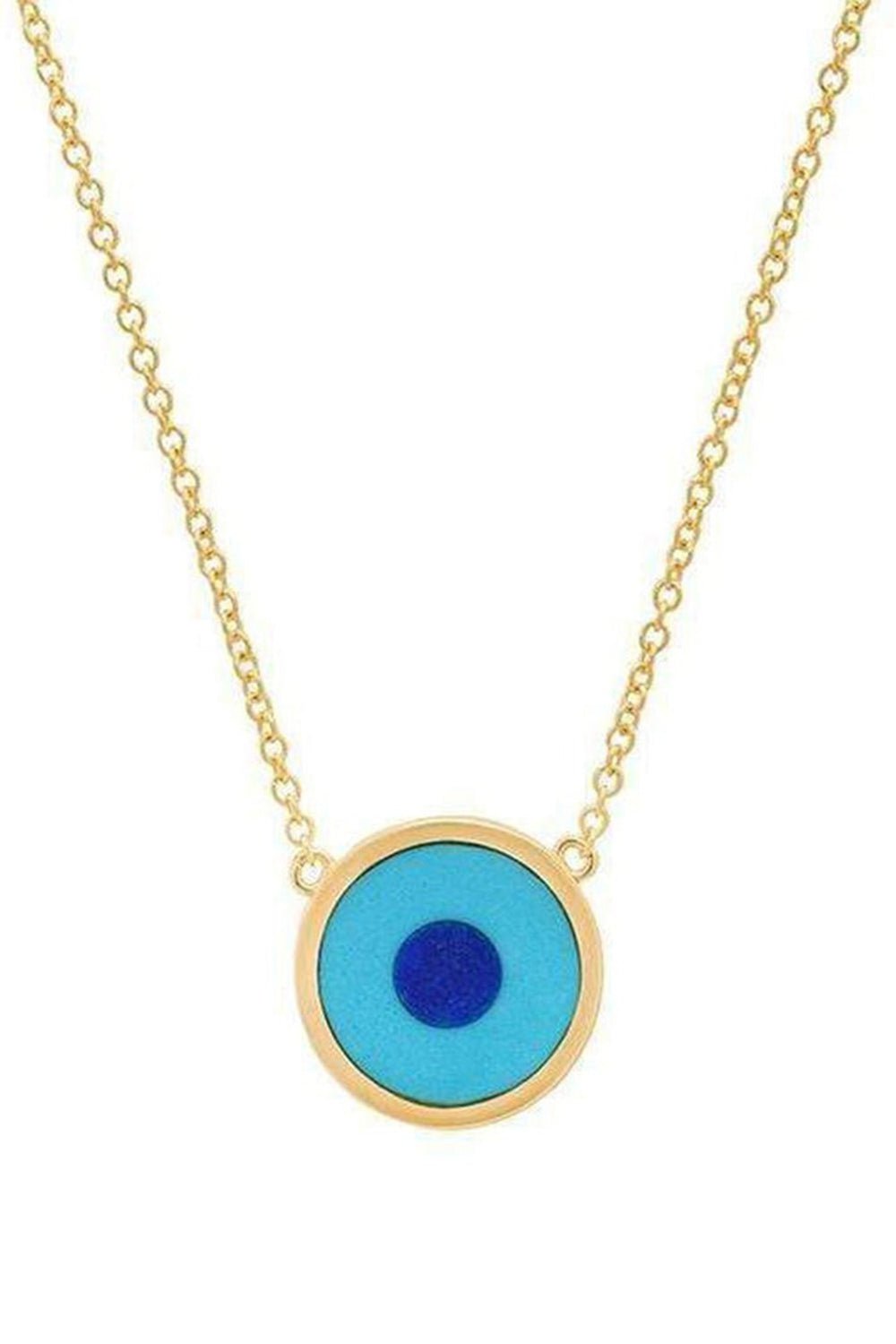 Jennifer Meyer Turquoise and Lapis evil eye necklace.