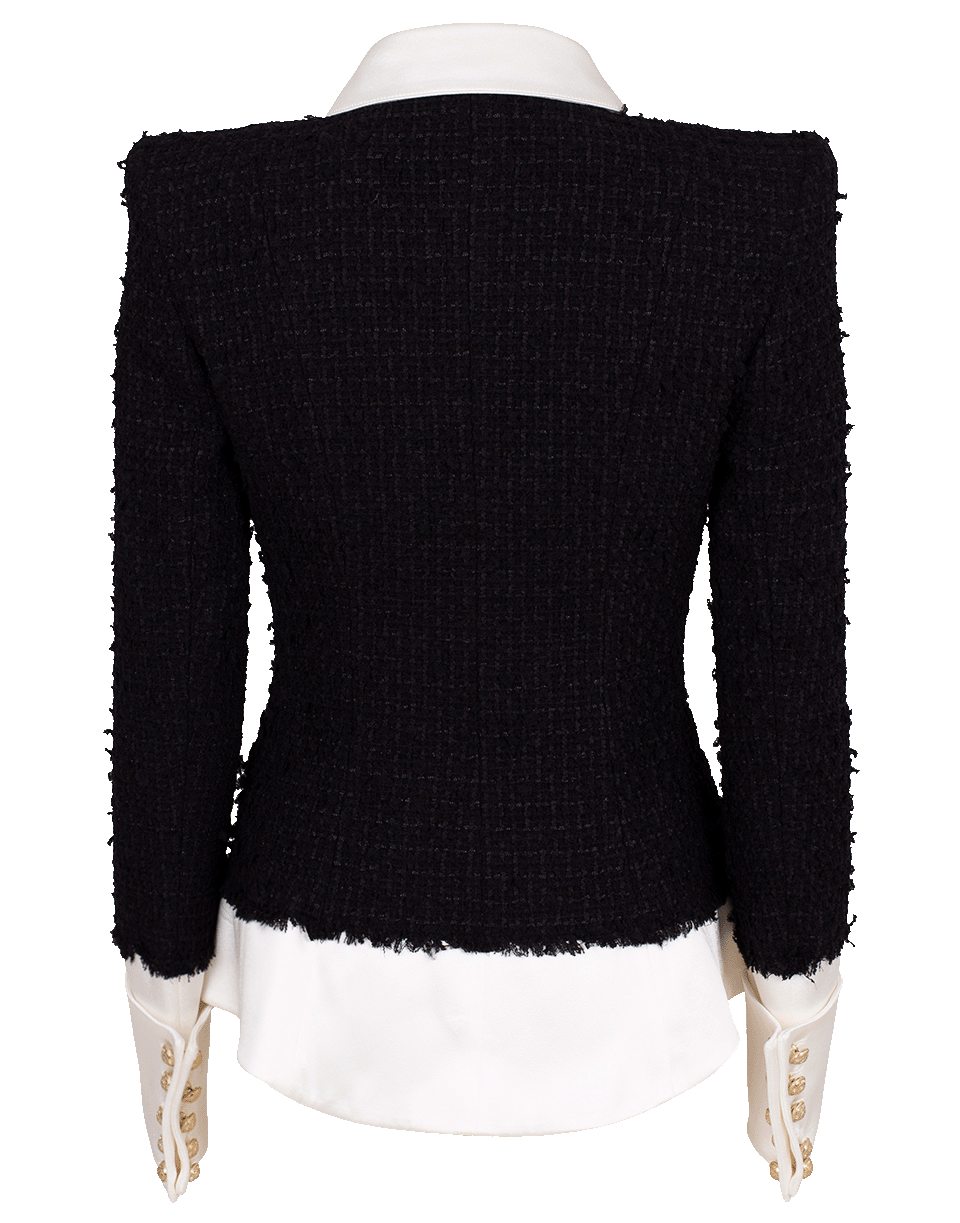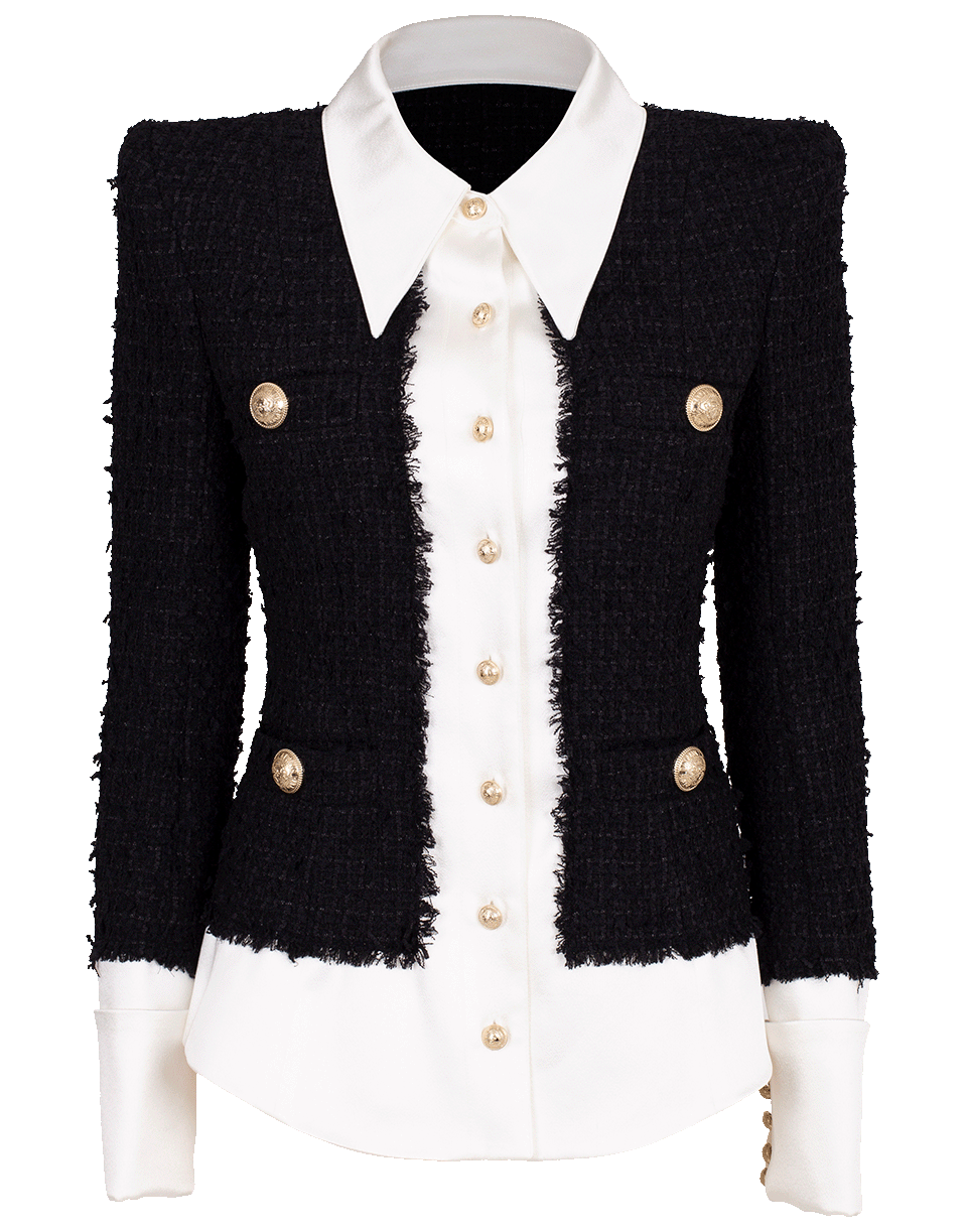 Contrast shirt effect jacket from Balmain featuring a structured silhouette with a pointed collar, four front pockets, embossed gold-tone button front, buttoned cuffs, and tweed details.
