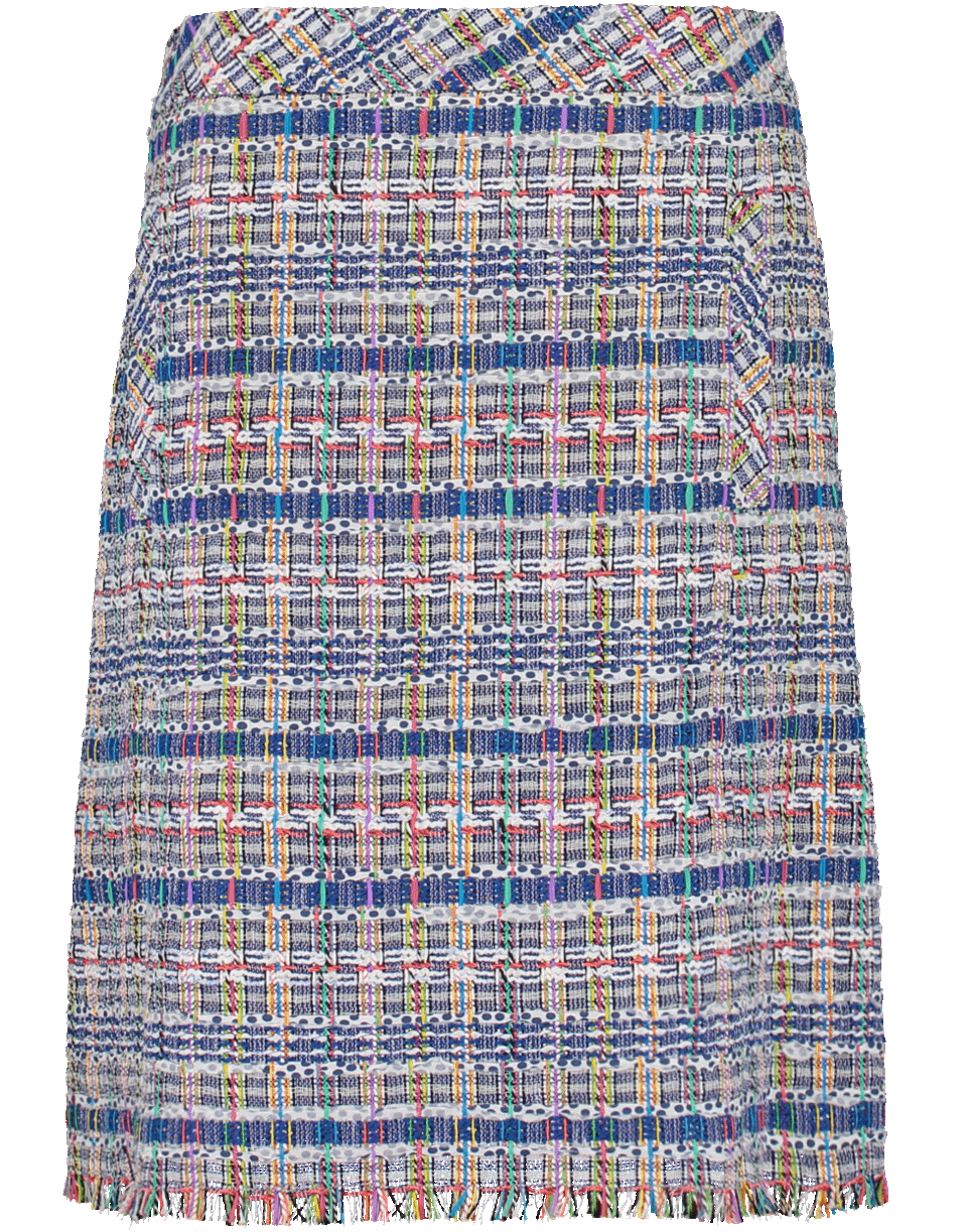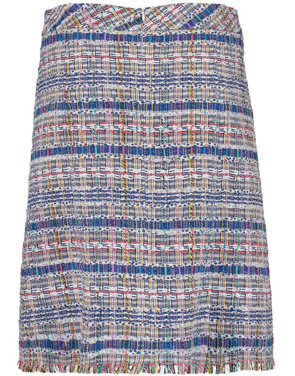 Multicolor tweed skirt by Maison Common. This thigh length skirt features a mid-rise waist with concealed rear zip closure and a subtle frayed hem.