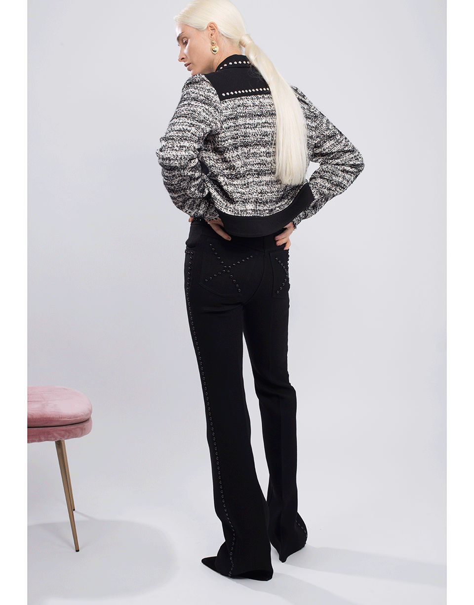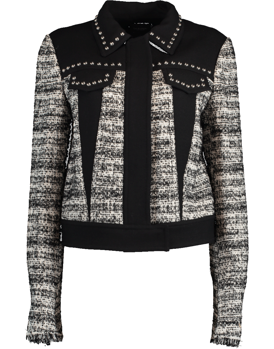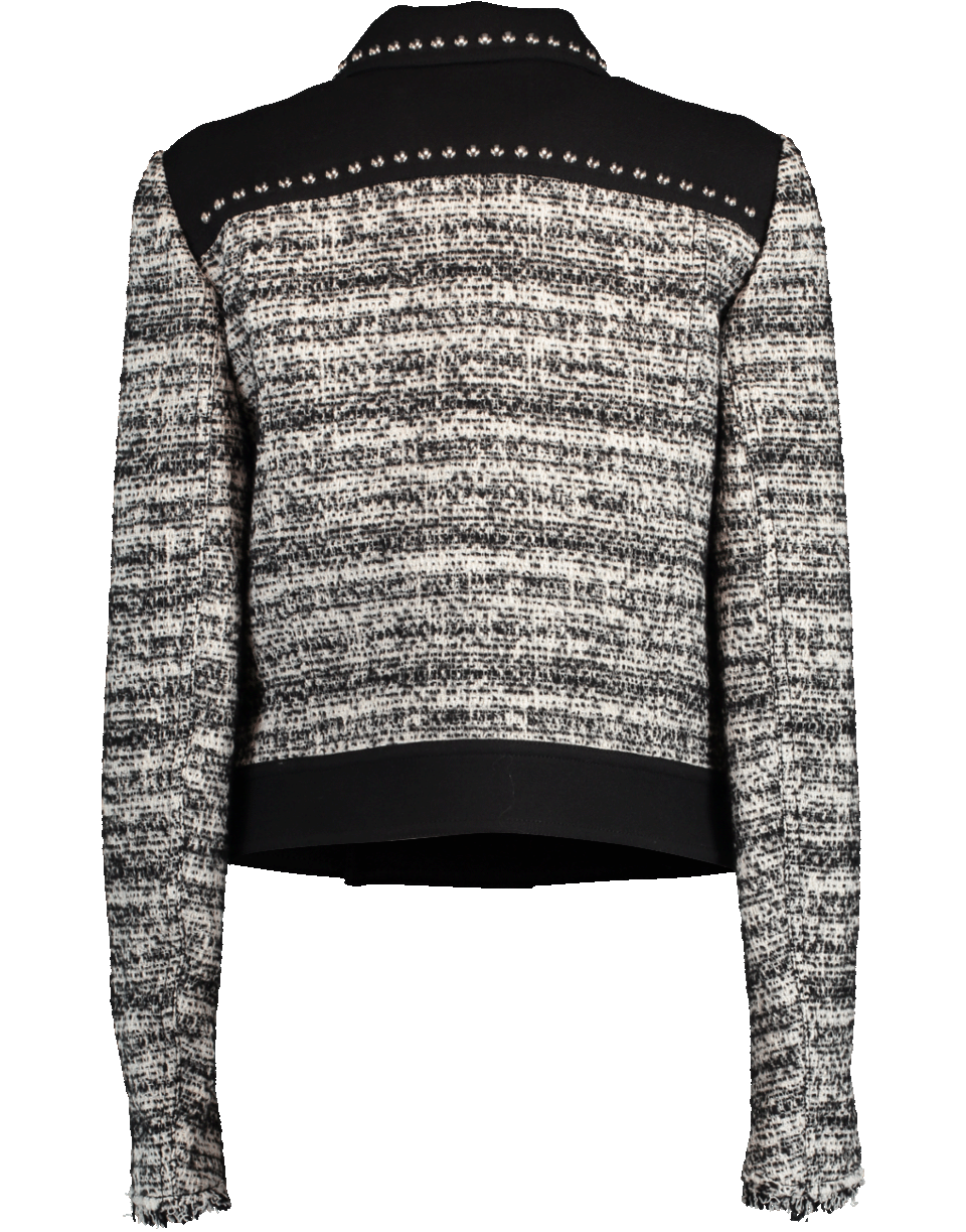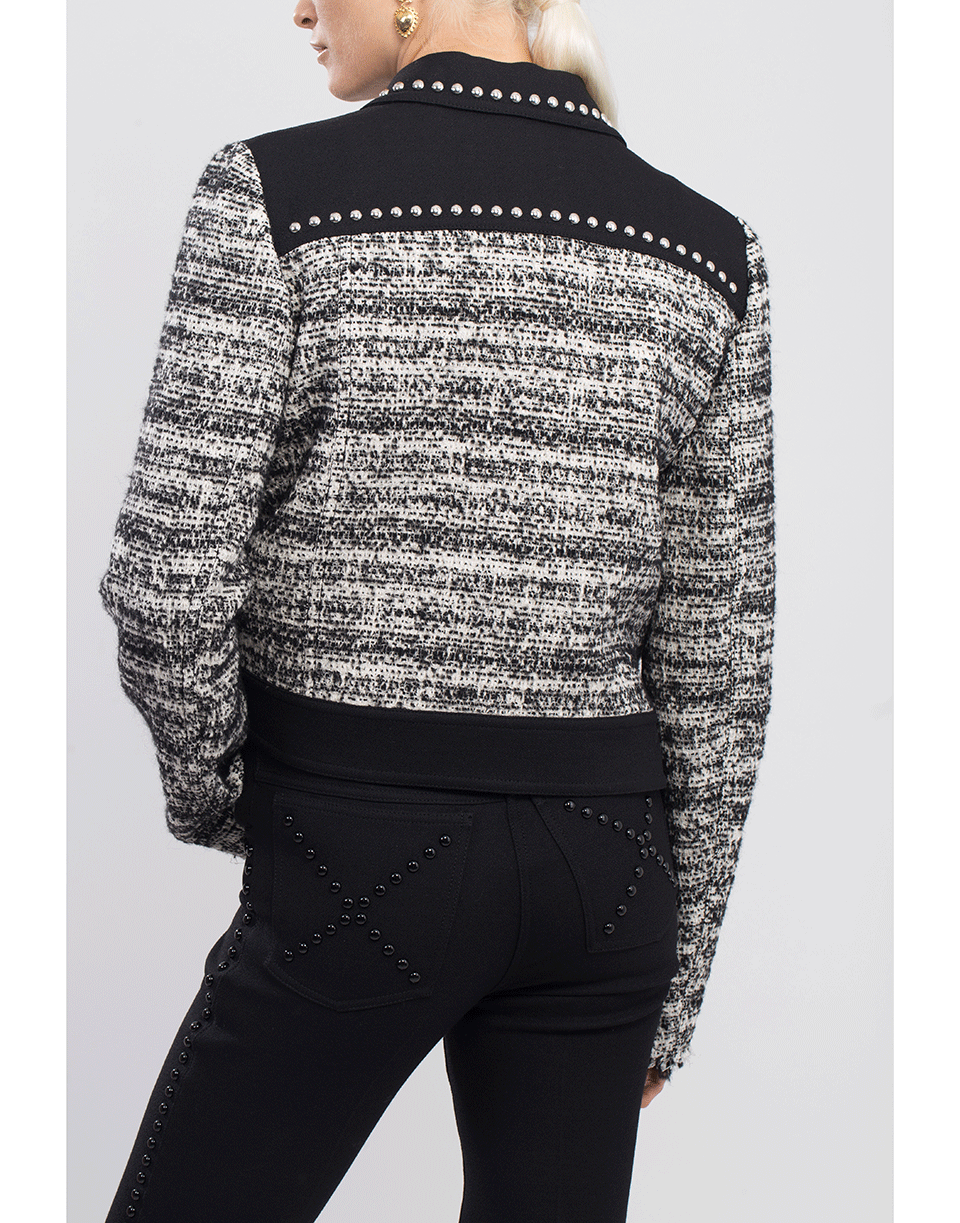 Studded tweed jacket from Giambattista Valli featuring a regular fit, long sleeves, concealed zip closure at front, spread collar, chest flap pockets, and stud details.