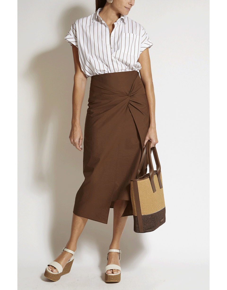 This crinkle cotton poplin twist front skirt from Brunello Cucinelli sits high at the waist with a side zip closure and a midi length.